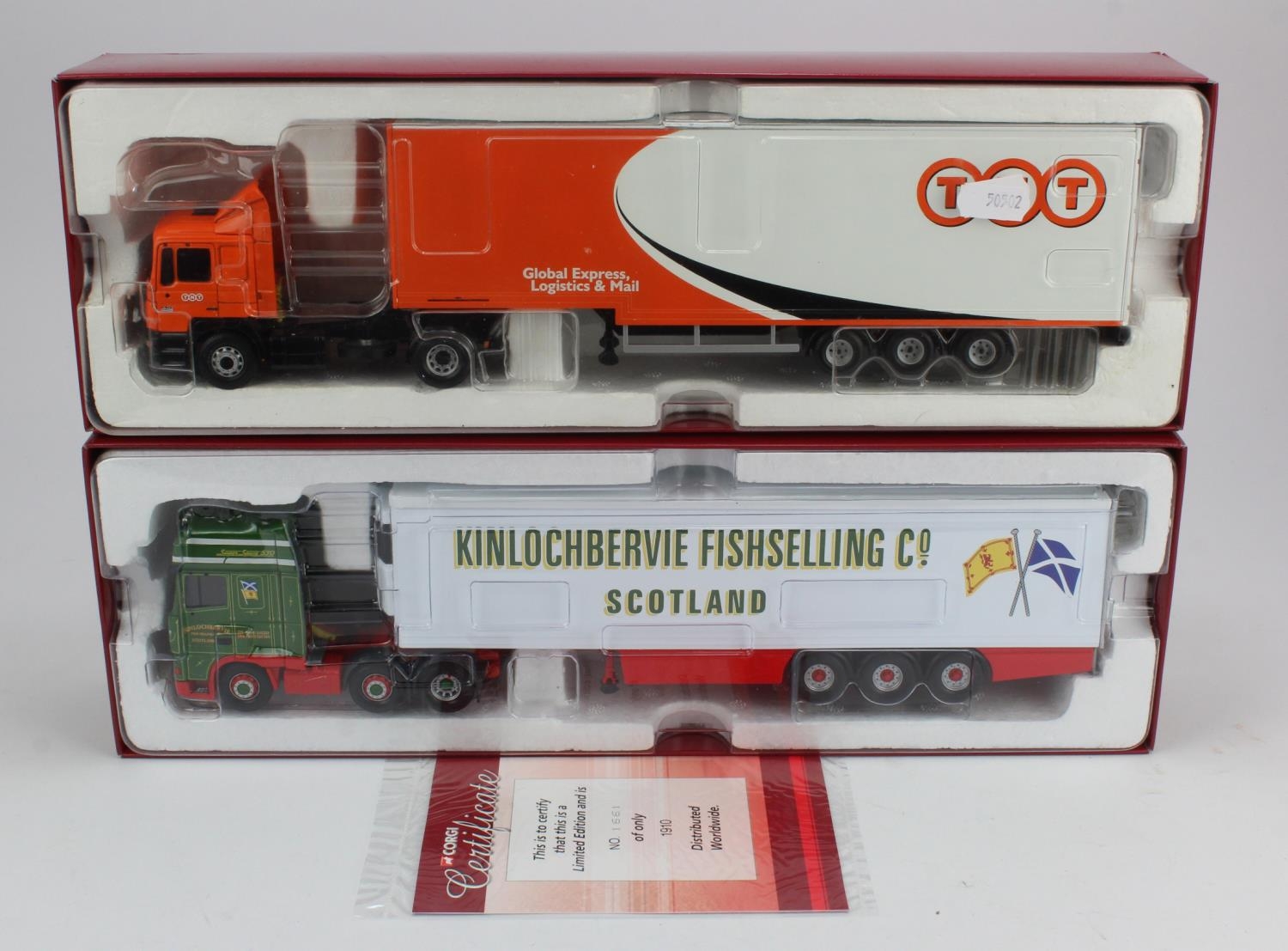 Corgi Hauliers of Renown. Two boxed Corgi Hauliers of Renown 1:50 scale diecast models, comprising 'DAF XF Super Space CAB Fridge Trailer, Kinlochbervie Fishselling Co' (CC13239) & Renault Premium Step Frame Box Trailer, TNT'