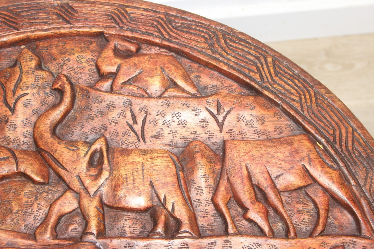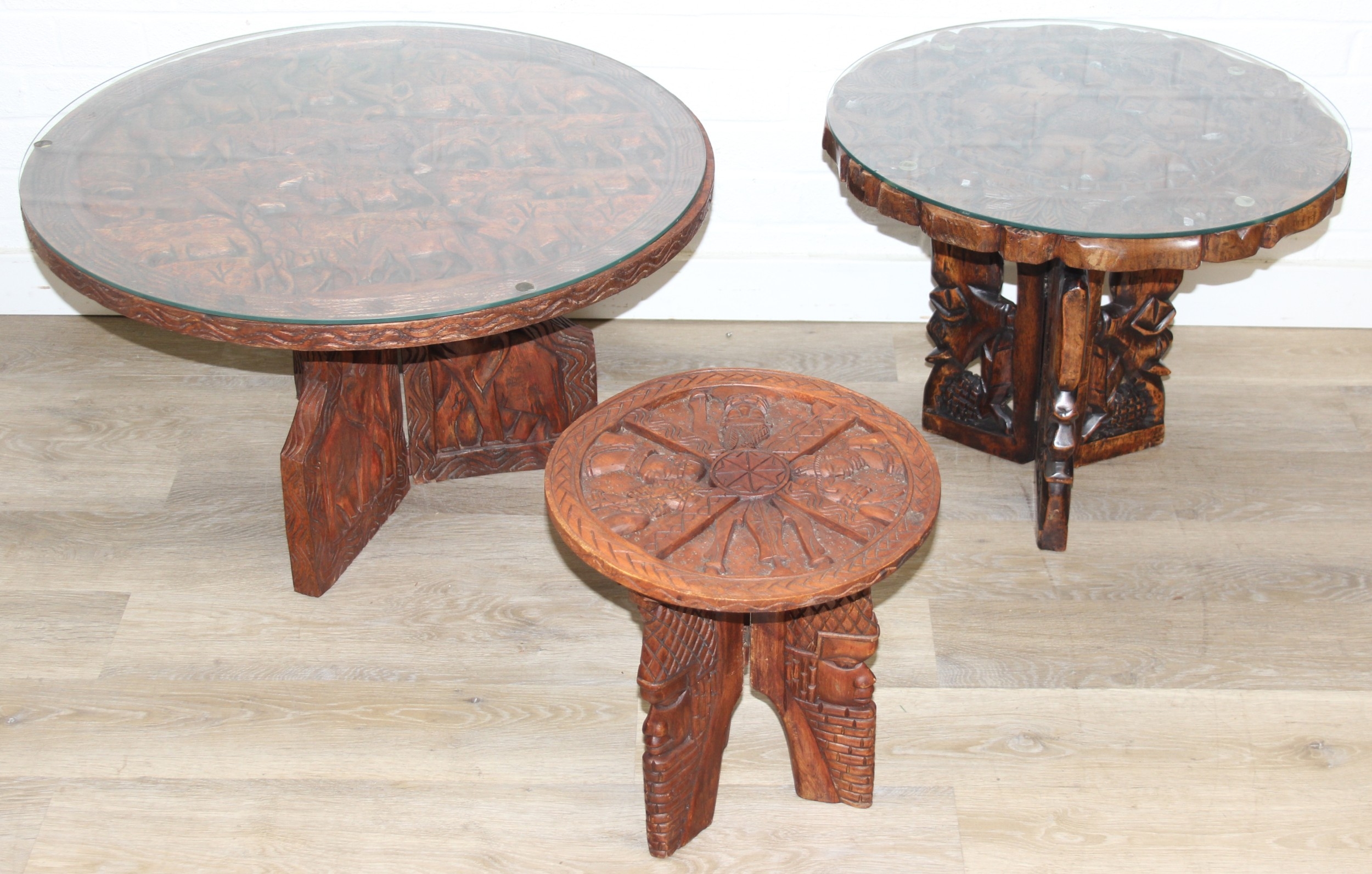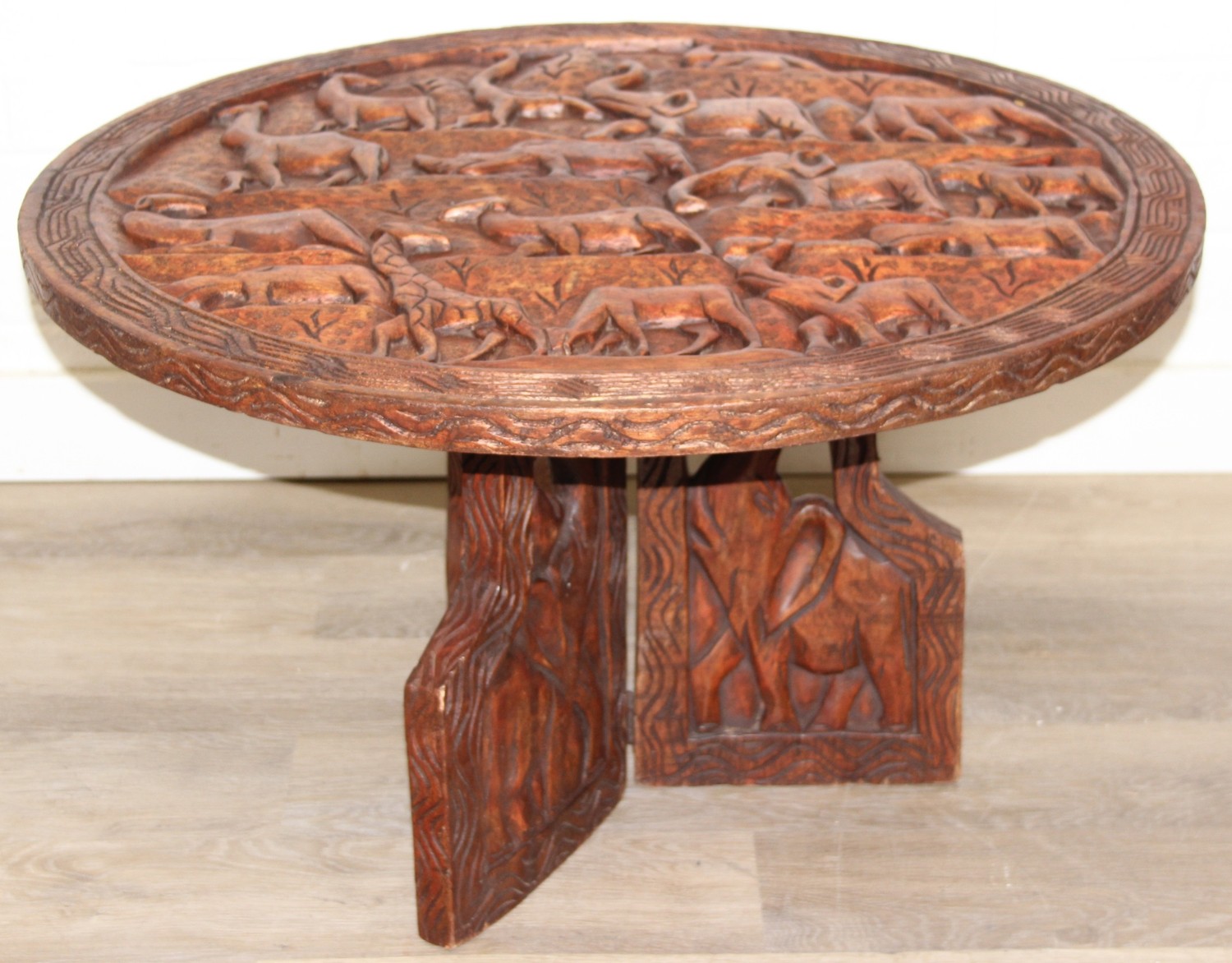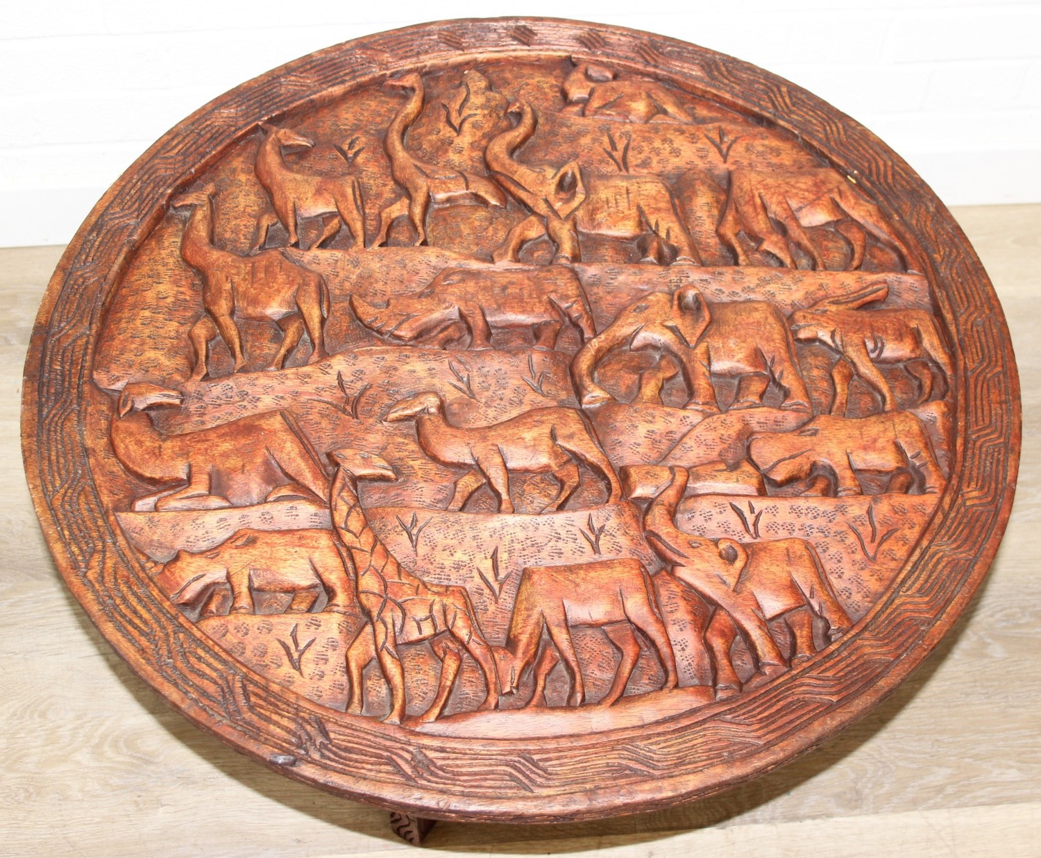 Three African carved hardwood folding tables, the tops carved with elephants, rhinos, giraffes etc, the largest 75cm diam x 46cm H [3]