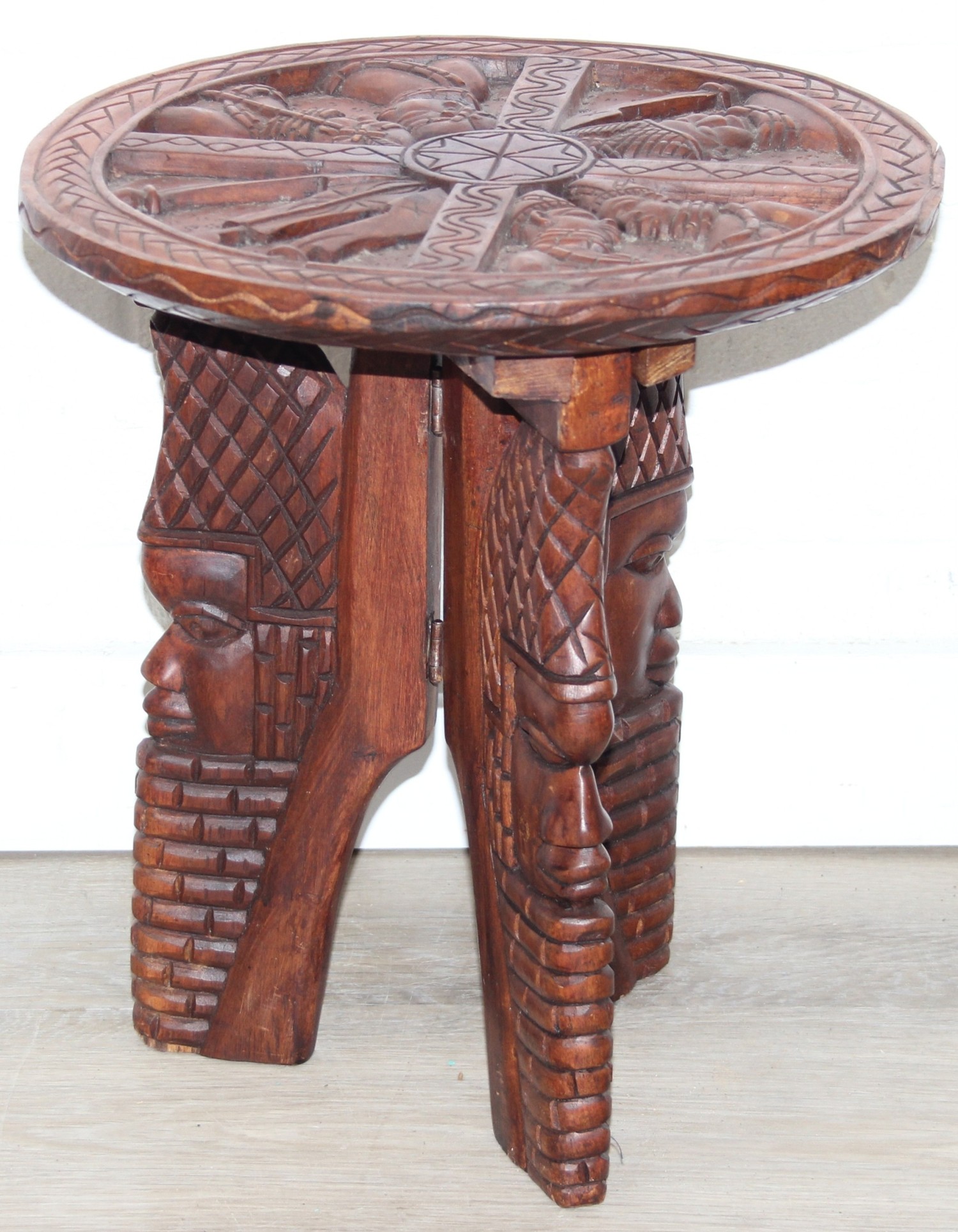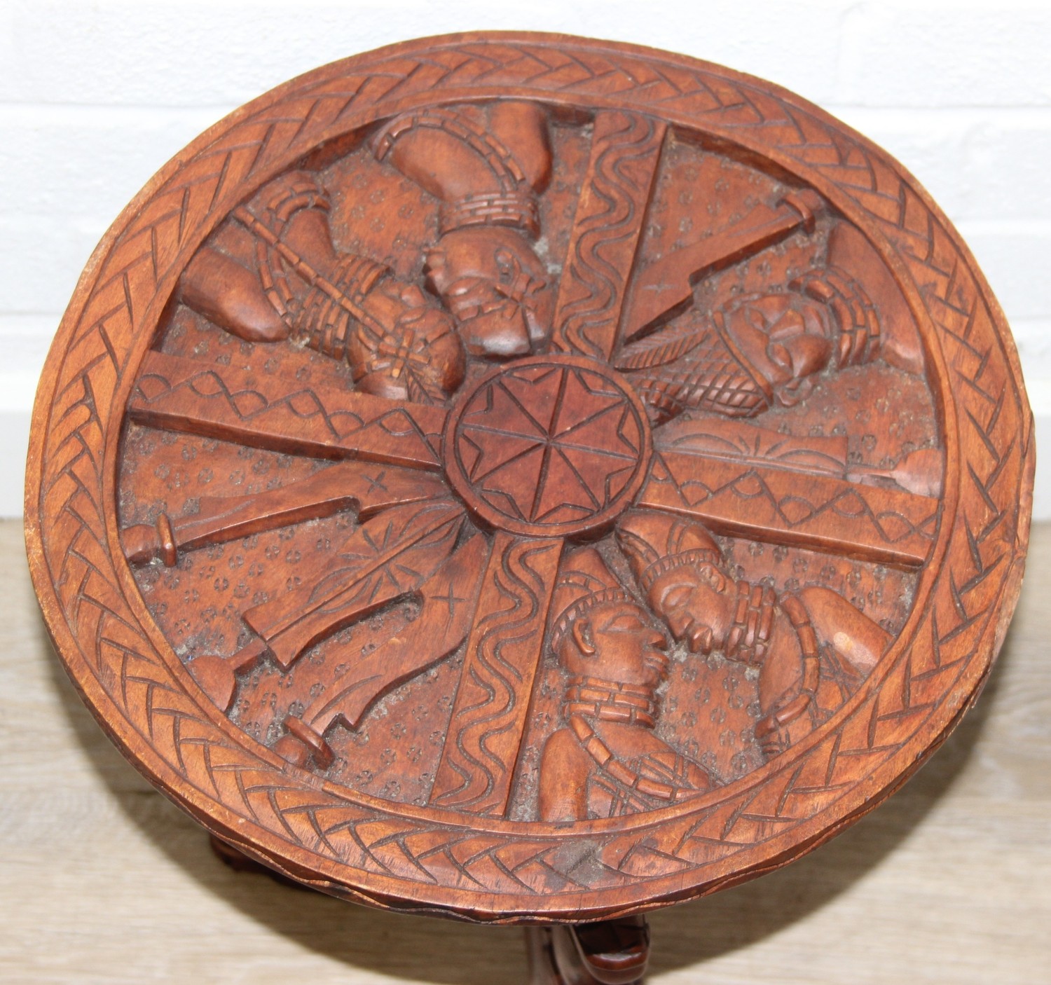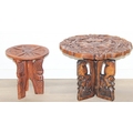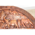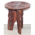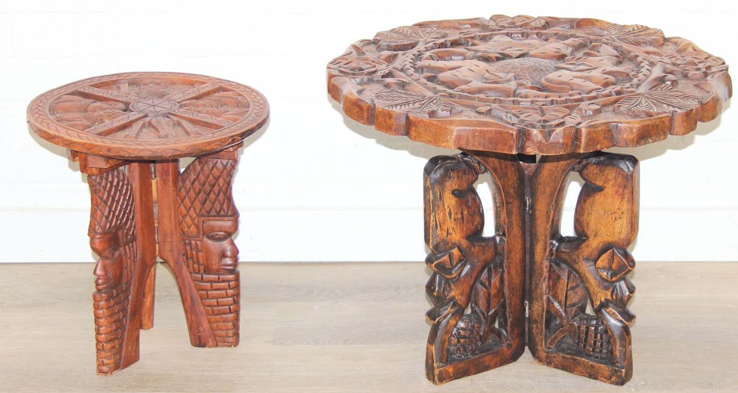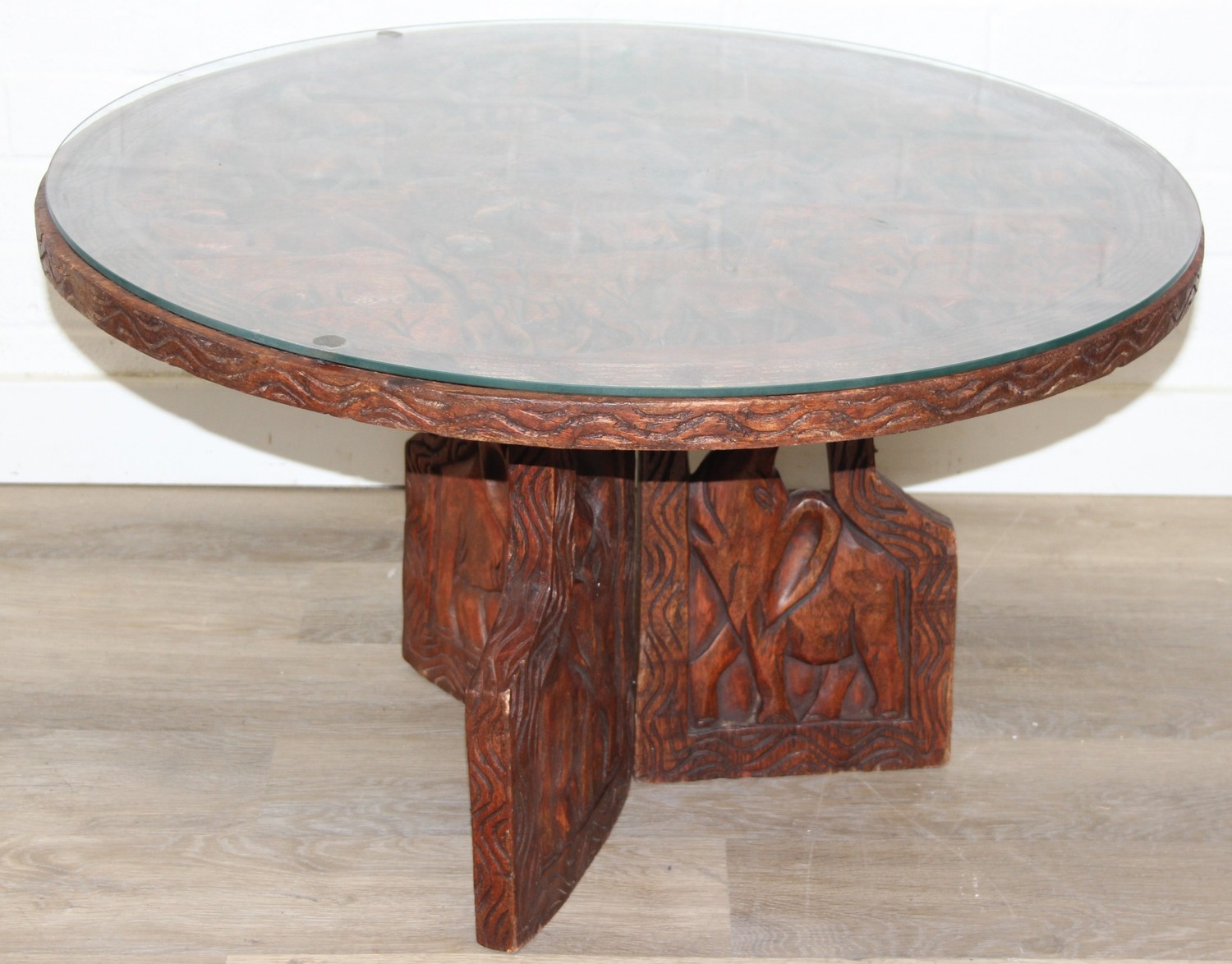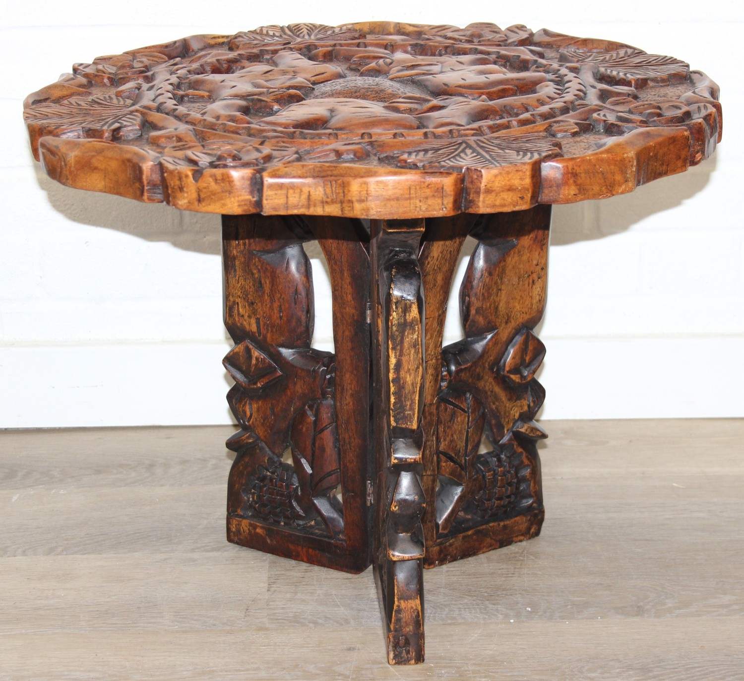Three African carved hardwood folding tables, the tops carved with elephants, rhinos, giraffes etc, the largest 75cm diam x 46cm H [3]