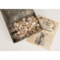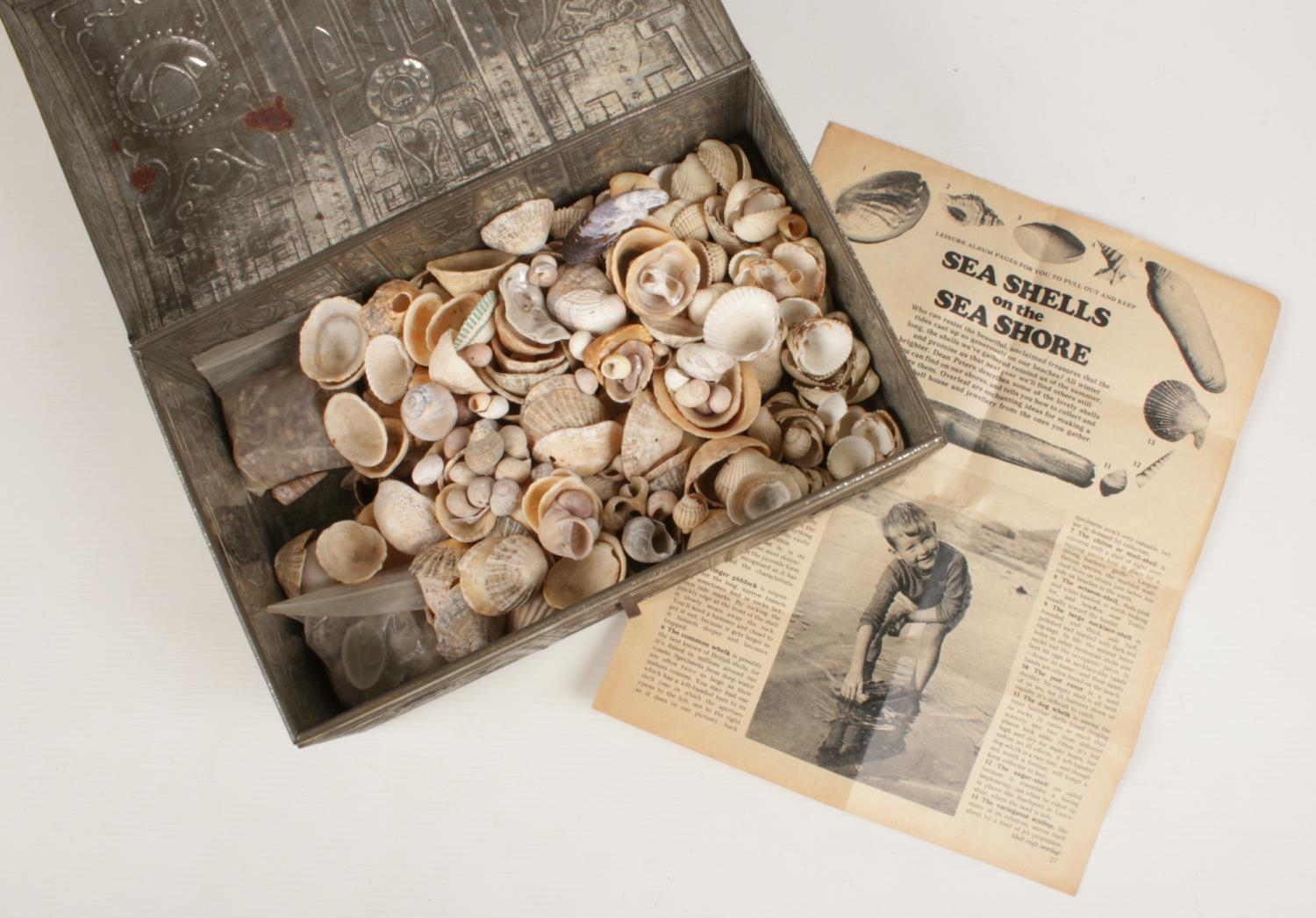 A metal tin with contents of various sea shells.