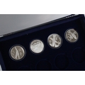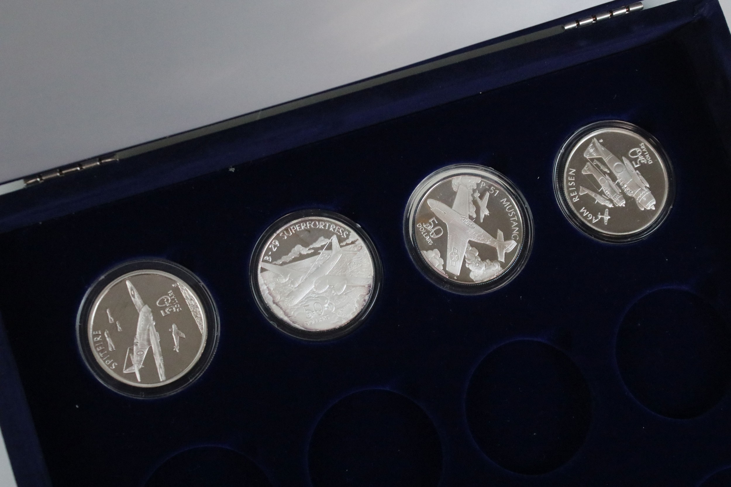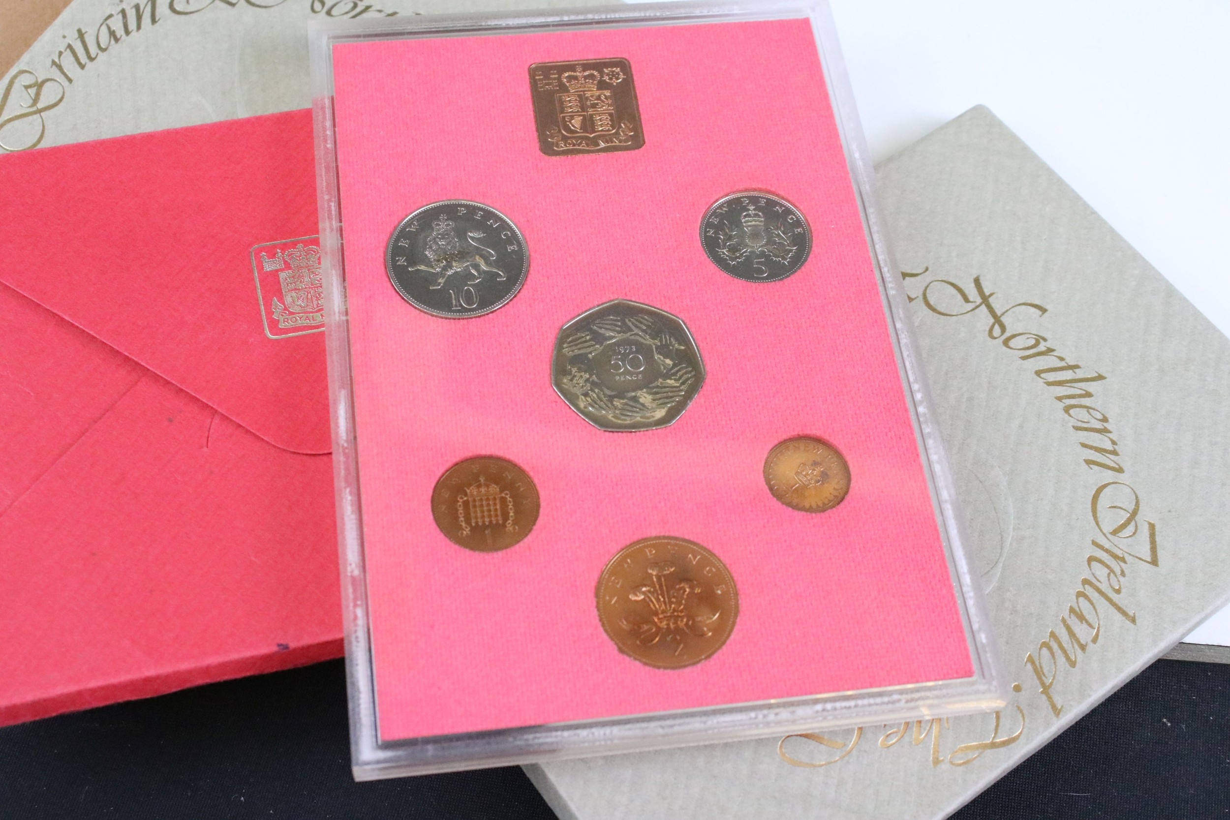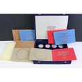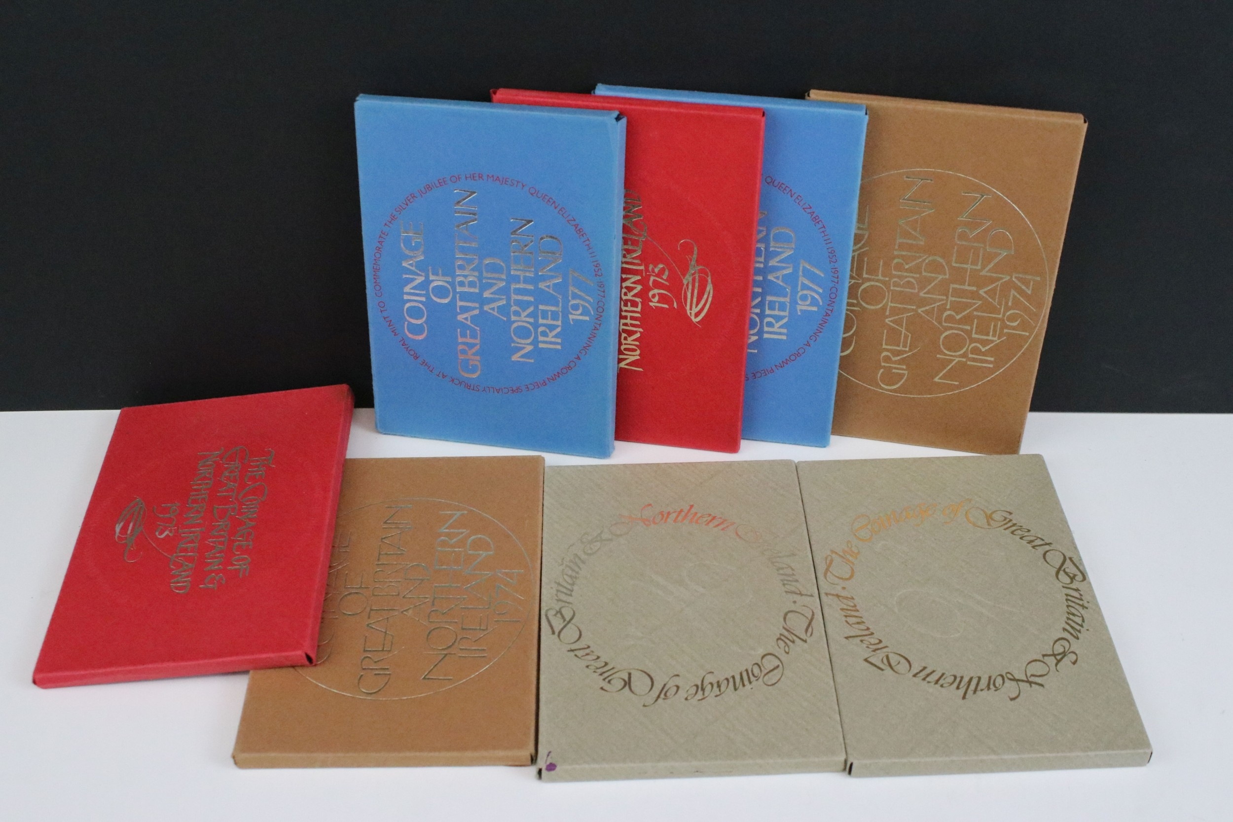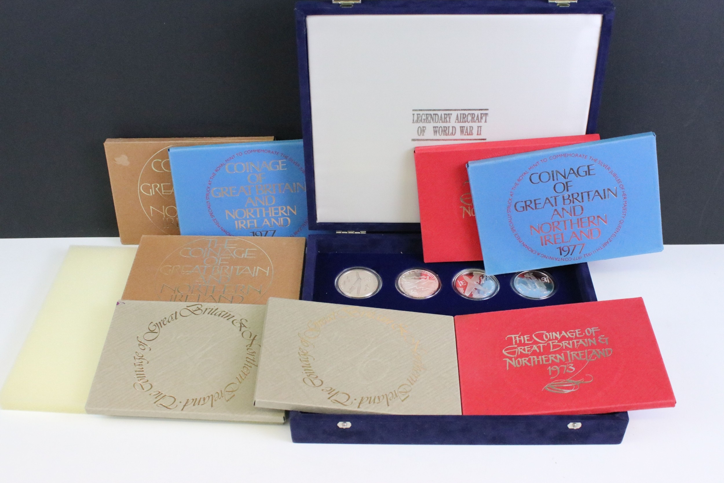 A collection of Royal Mint Queen Elizabeth II brilliant uncirculated annual coin year sets to include 1973, 1974, 1977 and 1976 examples together with four Legendary Aircraft silver proof coins encapsulated within display case.
