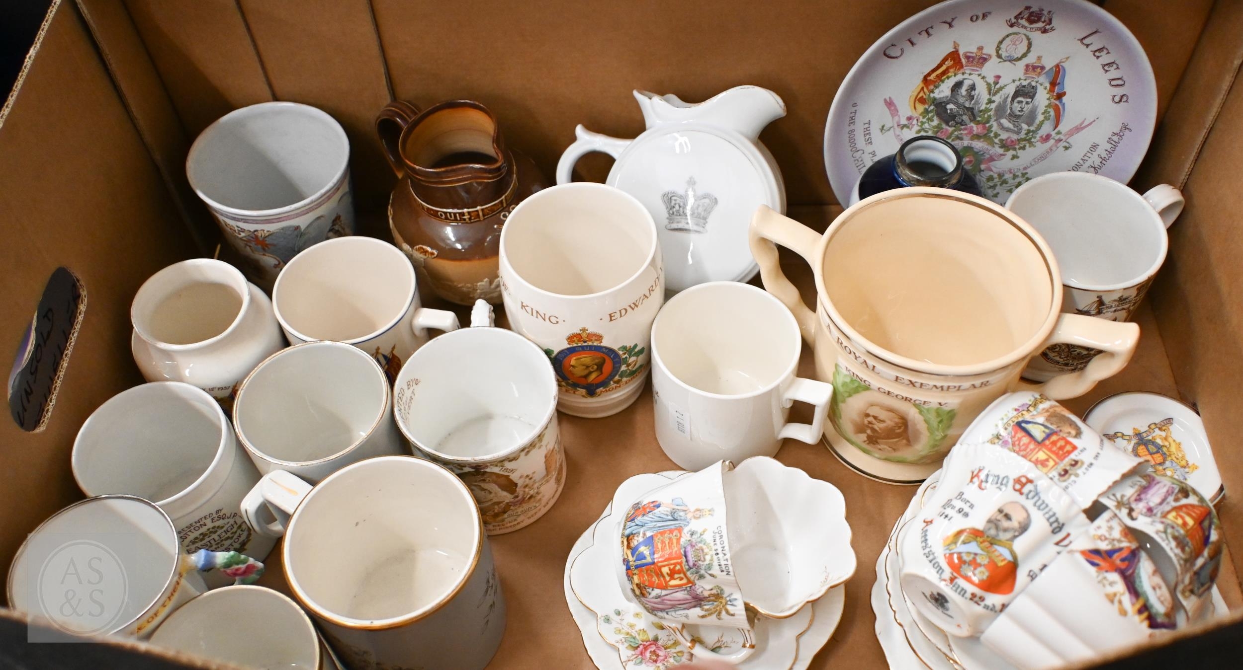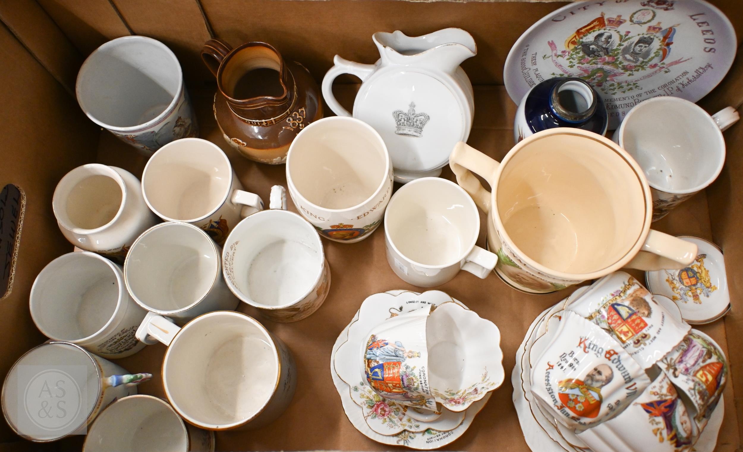 #A Victorian 1897 Jubilee enamel beaker and a Doulton Lambeth stoneware 1887 Jubilee jug, to/w various Edwardian and later Royal commemorative china (box)