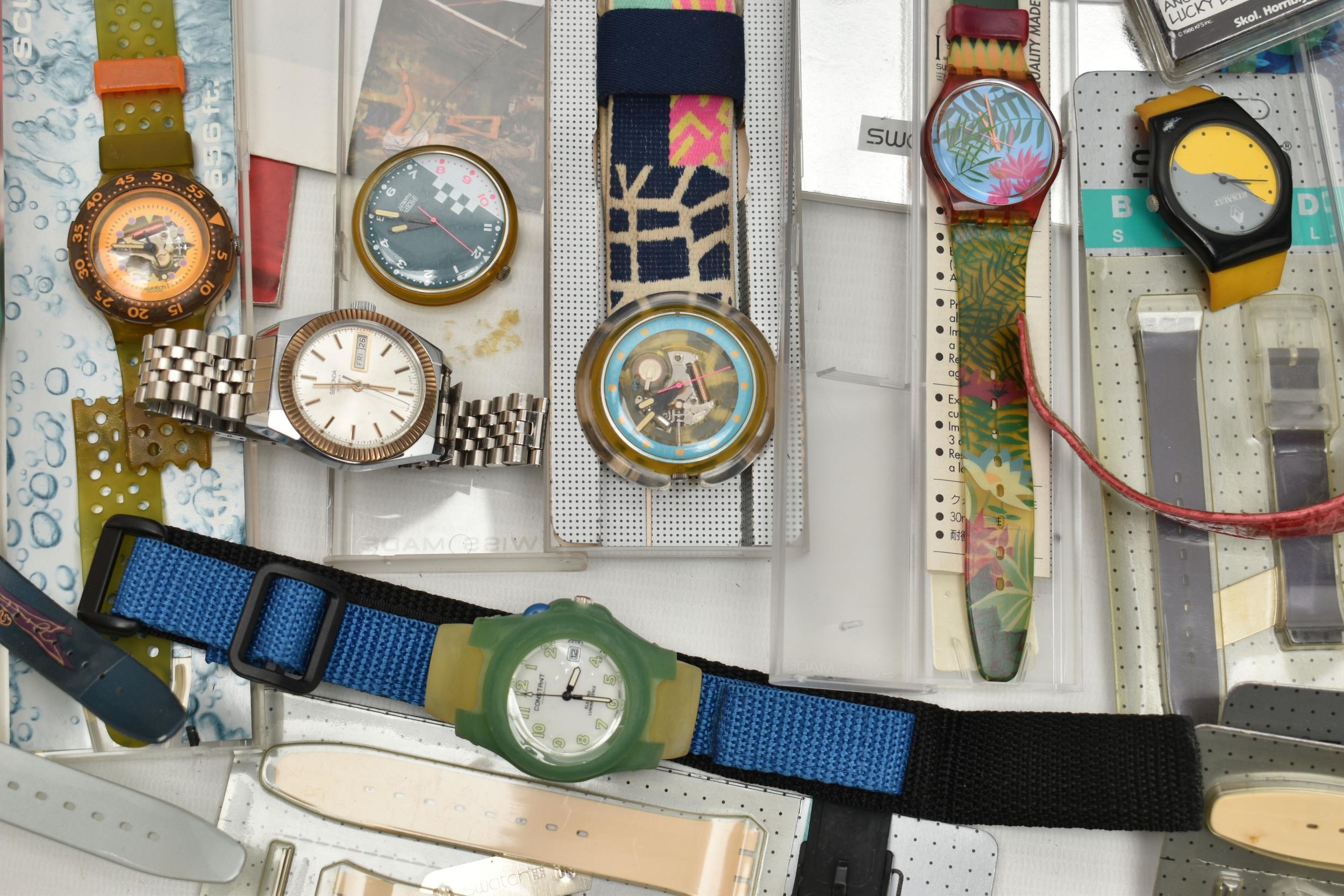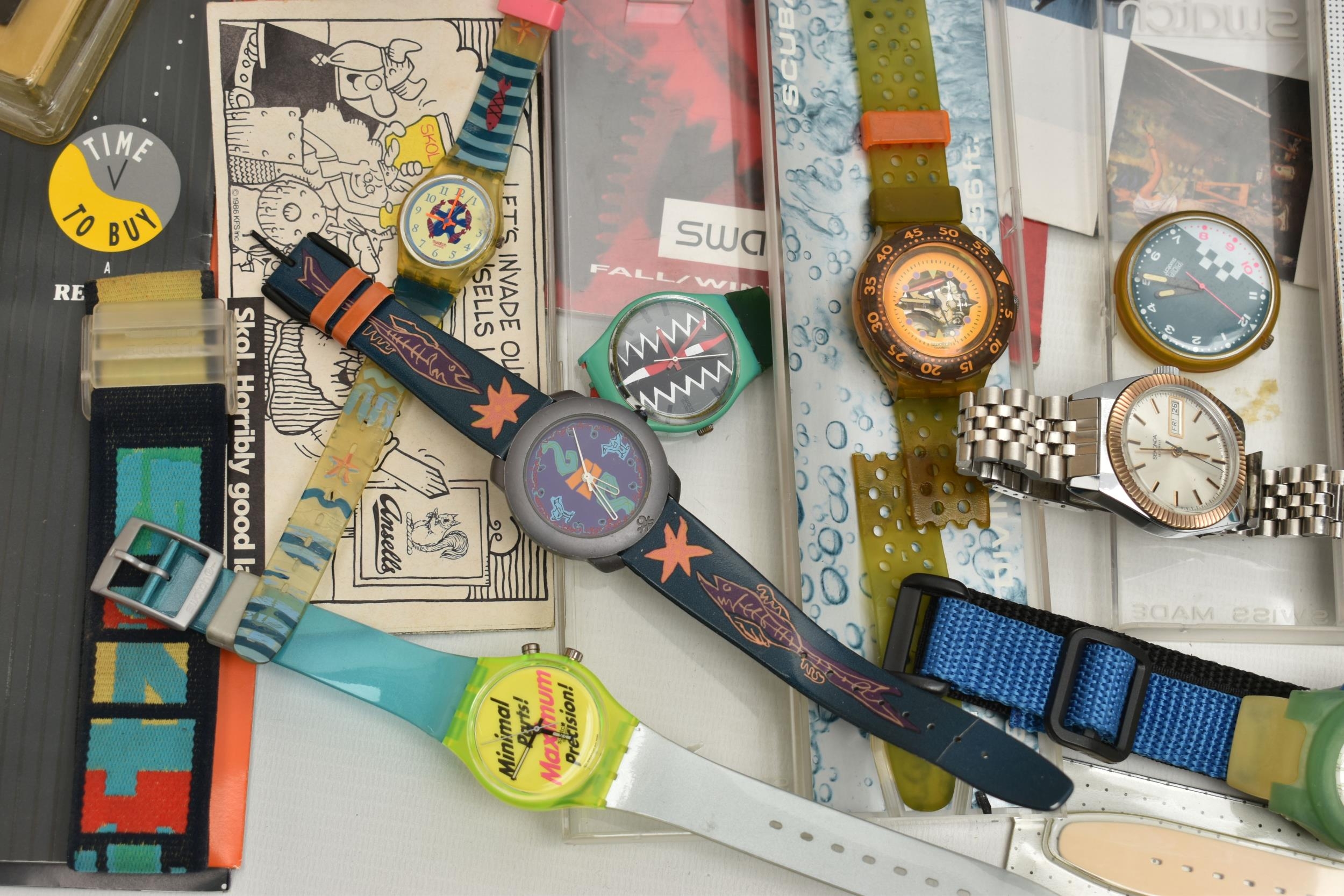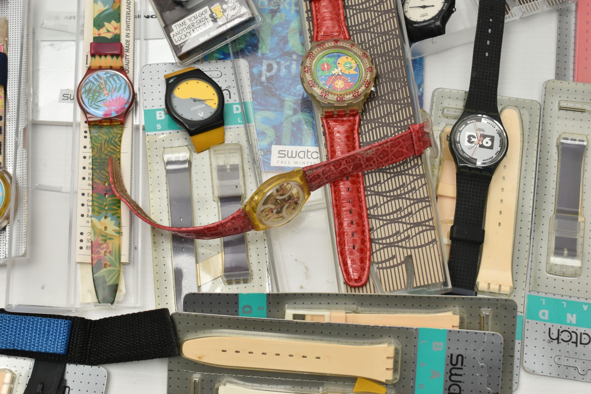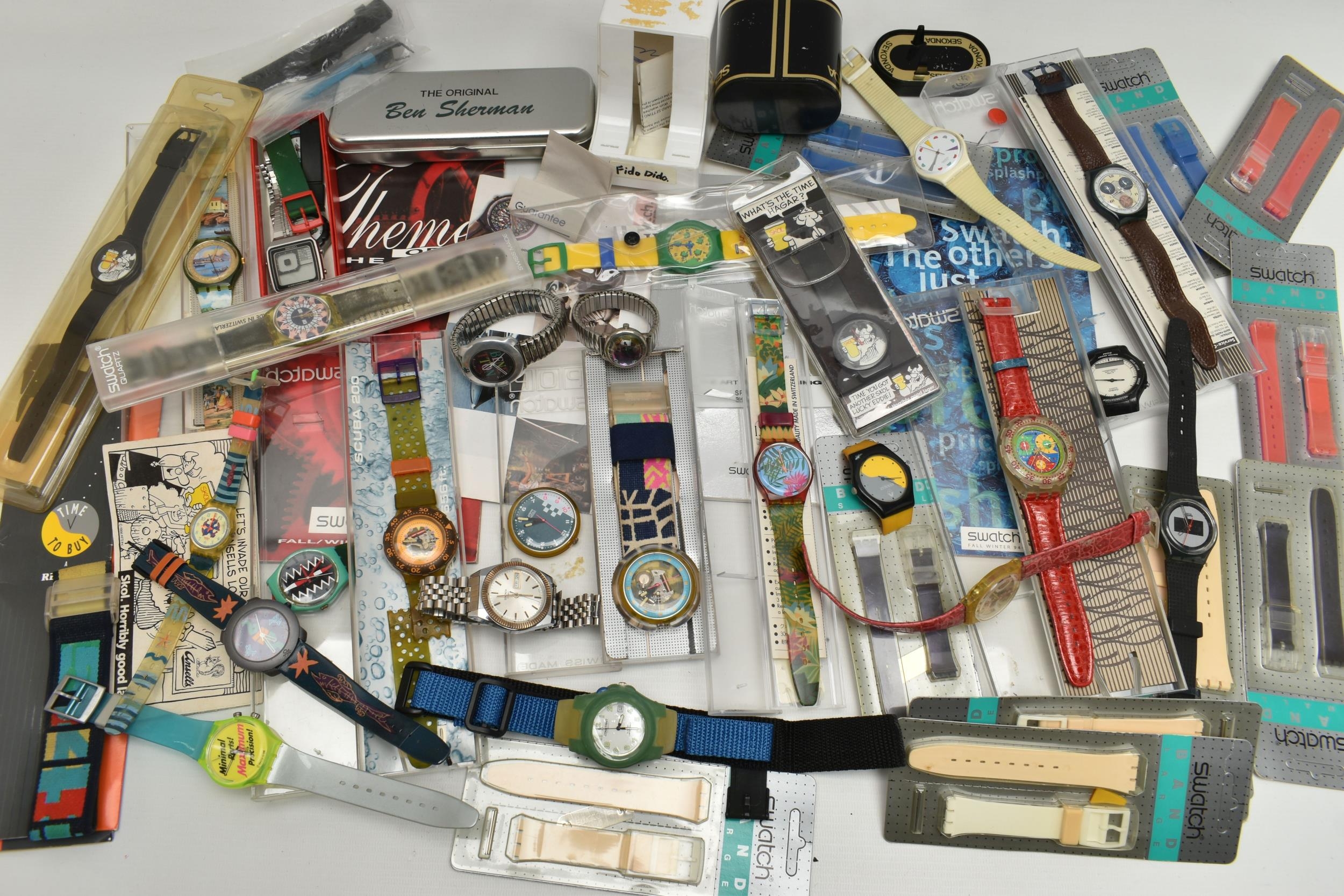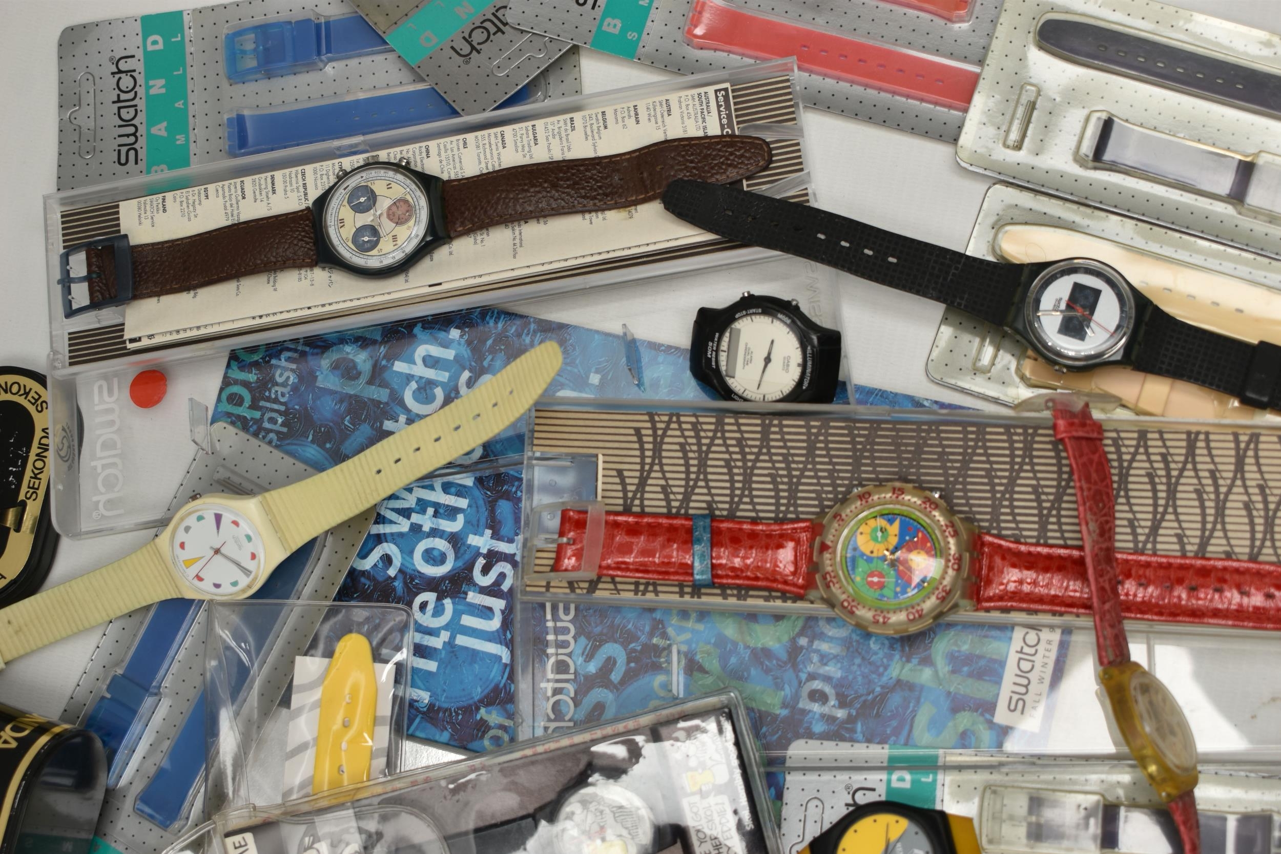 AN BOX OF 'SWATCH' WRISTWATCHES, assorted watches, some unworn and in original packaging, a selection of unopened 'Swatch' watch straps, together with some 'Swatch' brochures circa 1990s, also including a small selection of other wristwatches (condition report: watches are all untested)