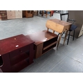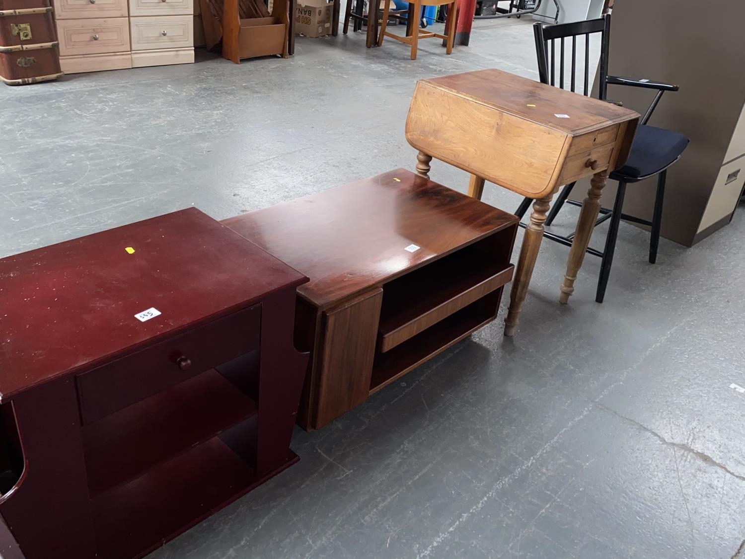 A black chair, side table, magazine rack etc.