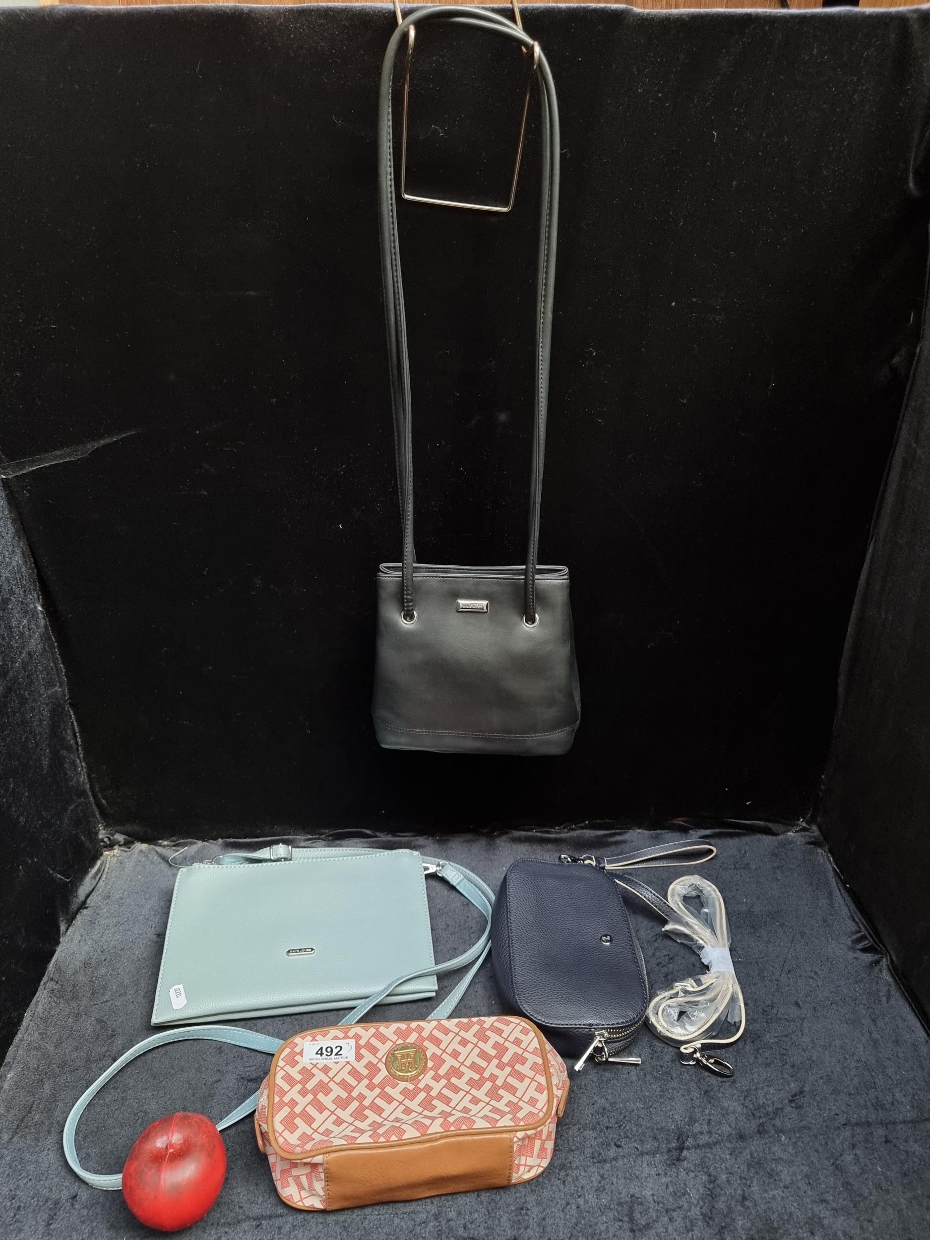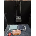 A black leather shoulder bag and a small navy clutch purse with shoulder strap, both by Nine West. Accompanied by a David Jones shoulder bag in a baby blue and a cosmetic / make up bag in a pink and tan check. (4 items)
