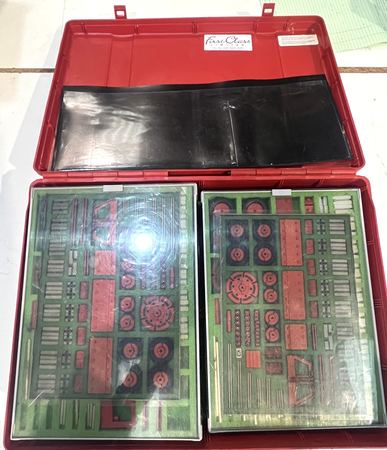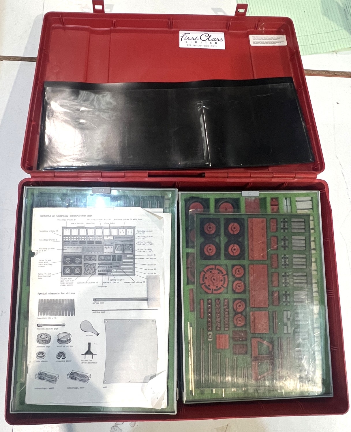 CVK Fishertechnik cased vintage construction set with six trays of various materials to build cars buldings etc all in red case