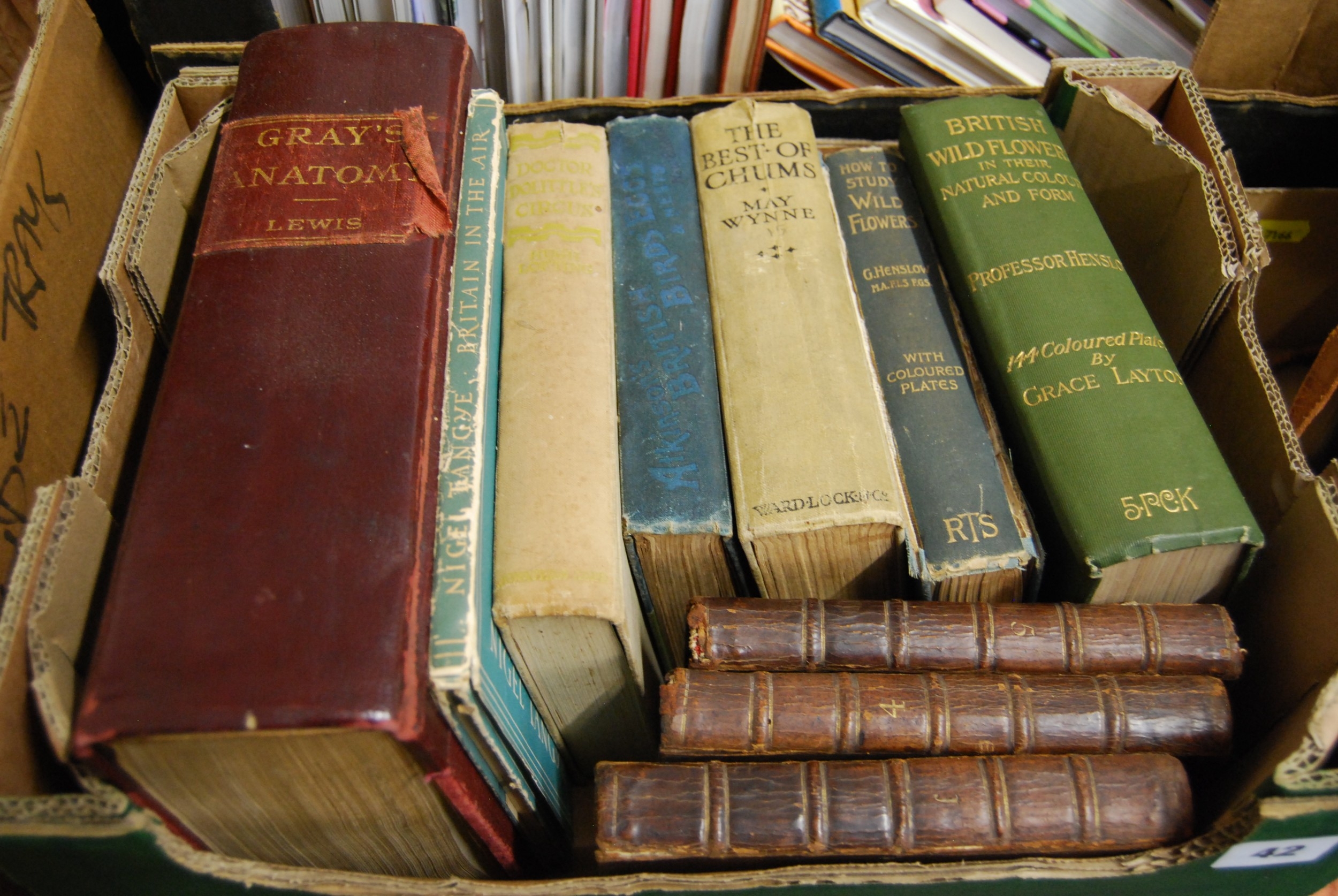 3 VOLUMES "THE HISTORY OF SIR CHARLES GRANDISON 1796" (VOLUMES 1, 4 & 5), 1 VOLUME "BRITISH WILD FLOWERS" BY PROFESSOR HENSLOW 1910, 1 VOLUME "HOW TO STUDY WILD FLOWERS" BY PROFESSOR HENSLOW, 1 VOLUME "GREY'S ANATOMY", ETC