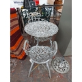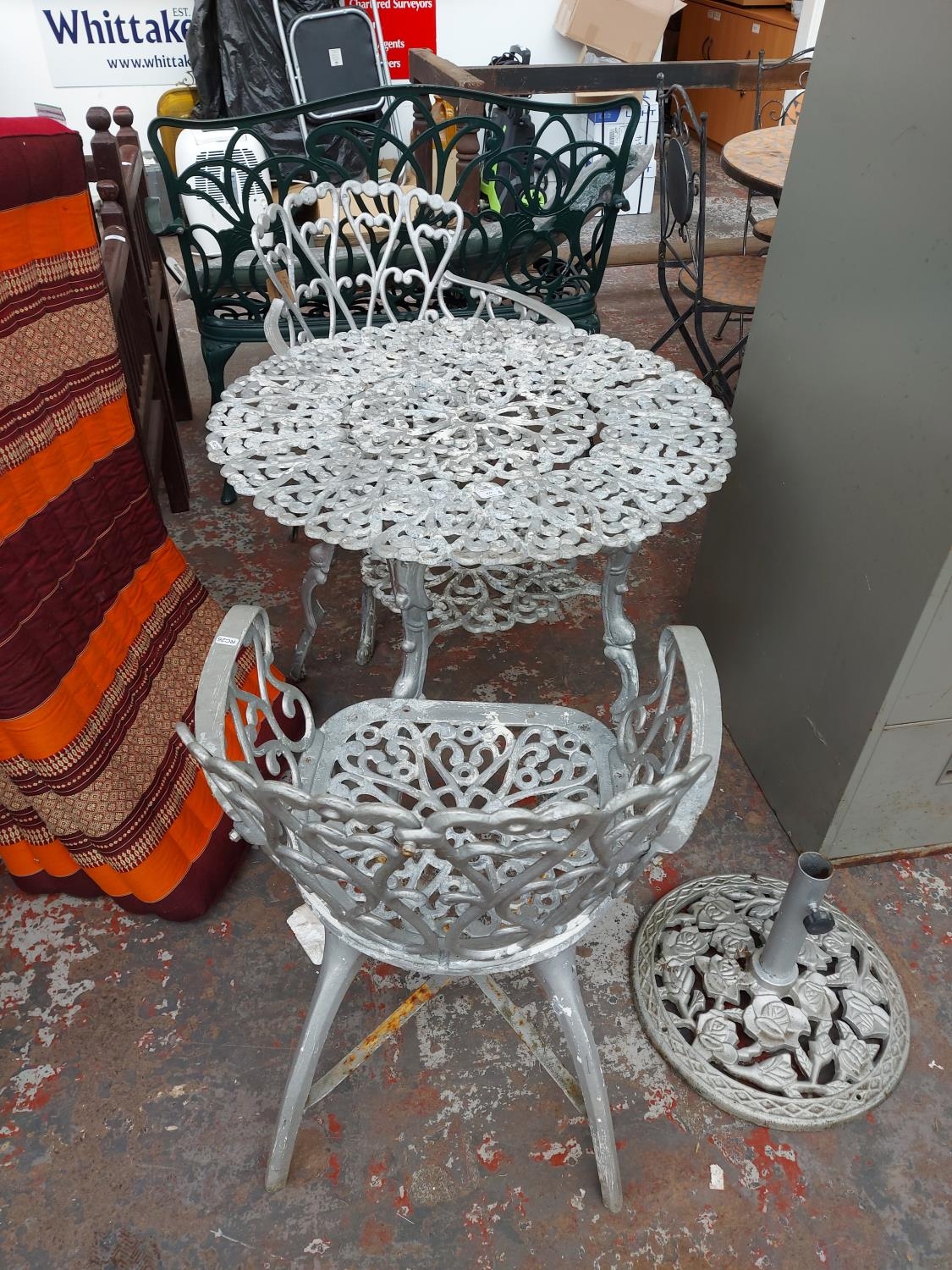 A four piece cast aluminium patio set comprising of circular ornate table, two matching armchairs and cast iron parasol base