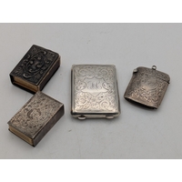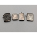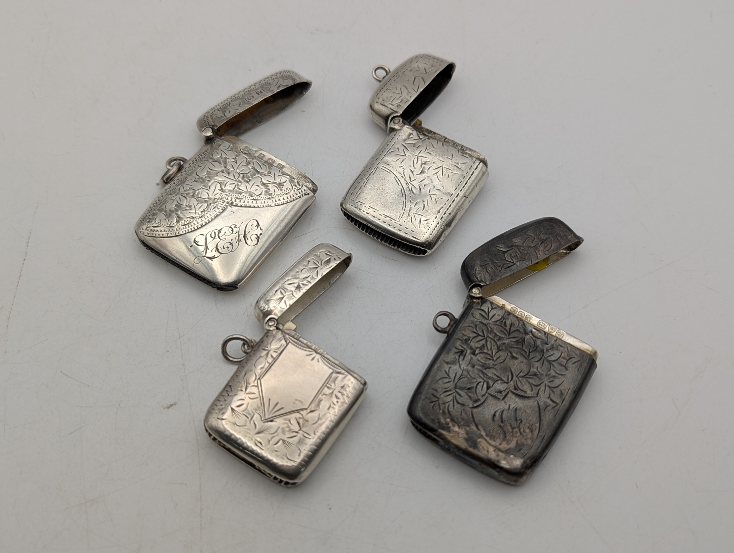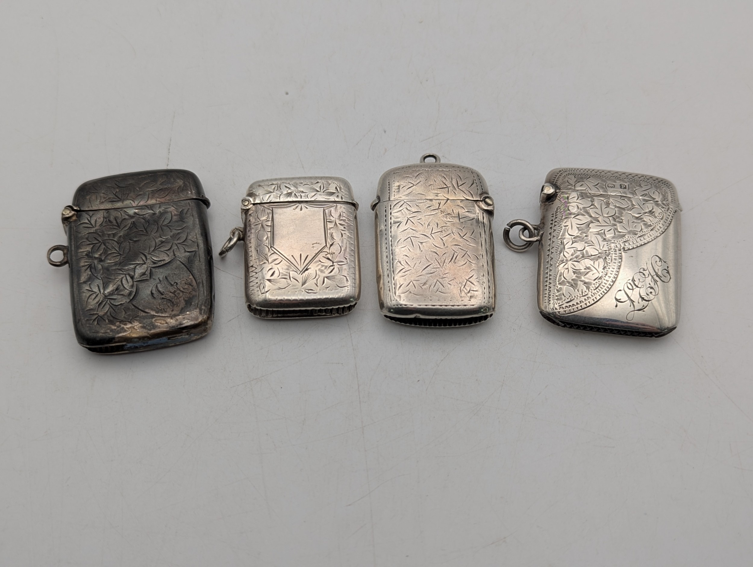 Four silver vesta cases, all having floral engraved decoration, three with hinged lids and suspension loops, total weight 65.7g