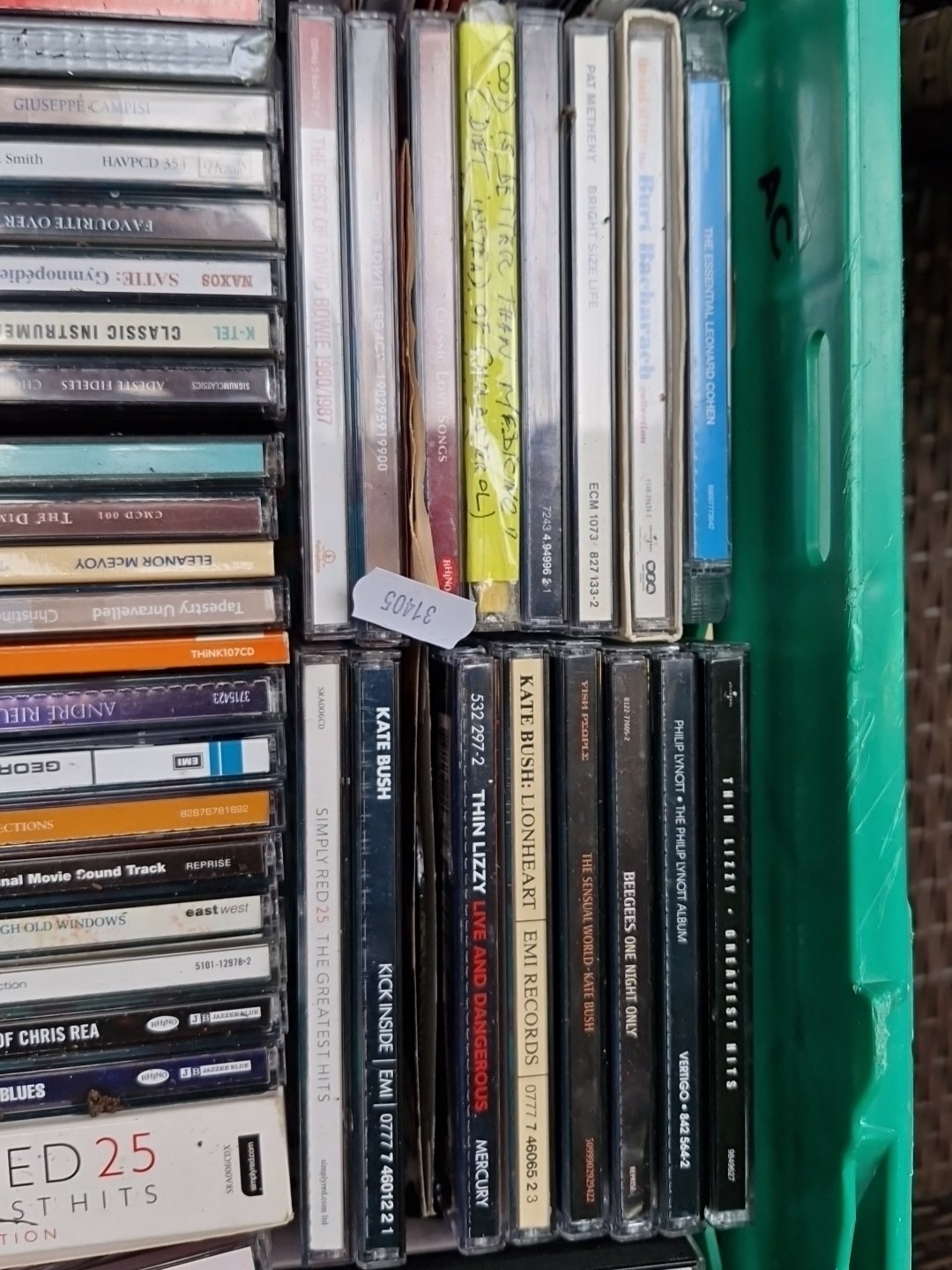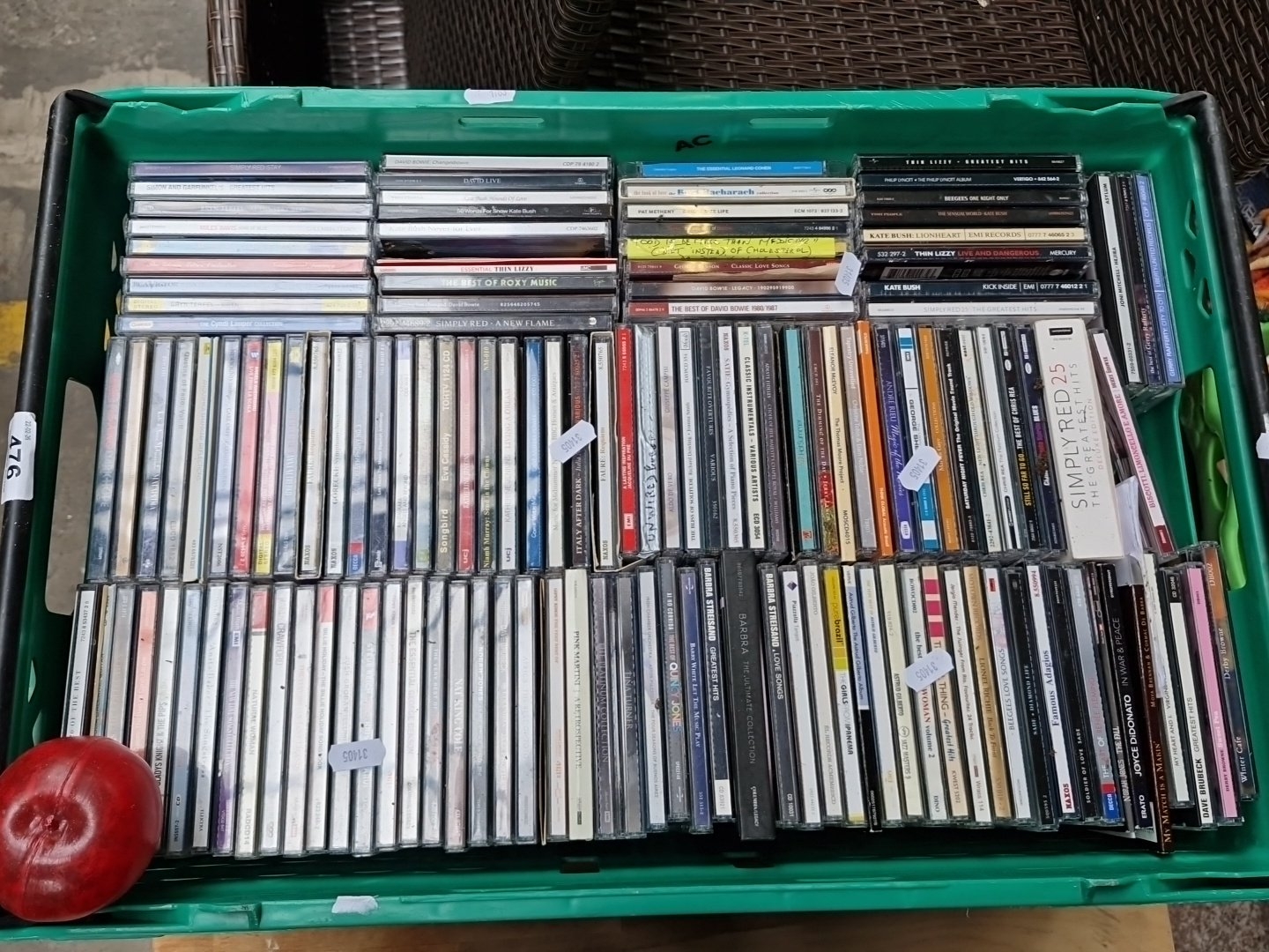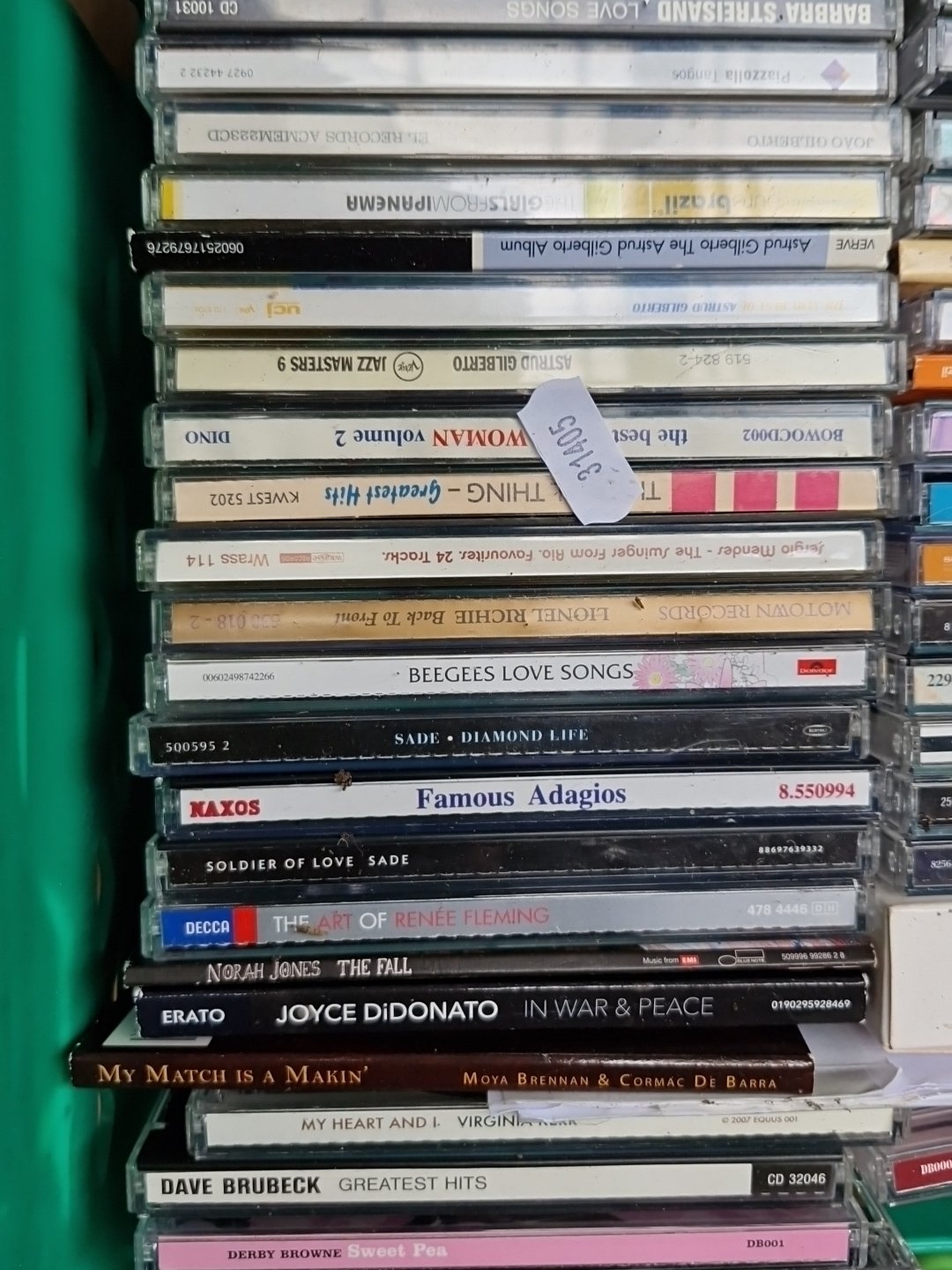 A full crate of compact discs, chiefly popular and jazz with some classical, including titles by David Bowie, Kate Bush, Thin Lizzy, Simply Red, Sade, Norah Jones, Dave Brubeck, and Miles Davis, in jewel cases.