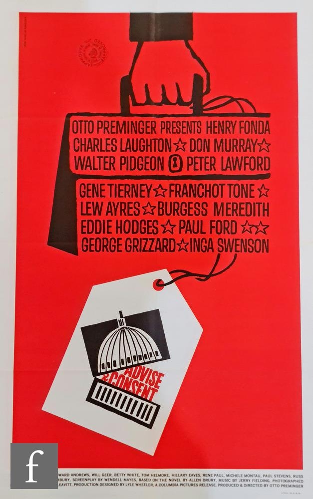 An original 1960s Advise and Consent film poster, artwork by Saul Bass, with 'Approved' stamp of the Quebec cinema censor, previously folded, 104cm x 68.5cm.