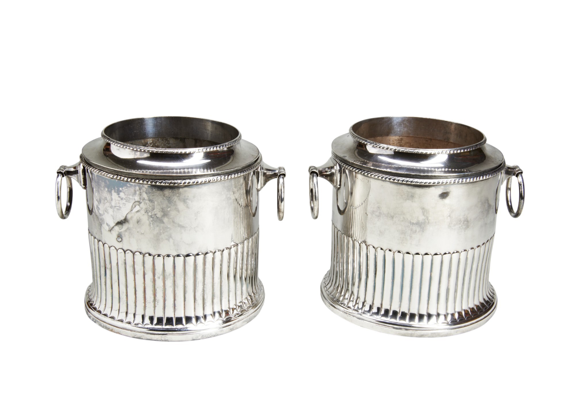 A pair of half fluted coolers with ring handles. The rims detach to allow the removal of the inner silvered liners. Very little copper showing through from use