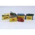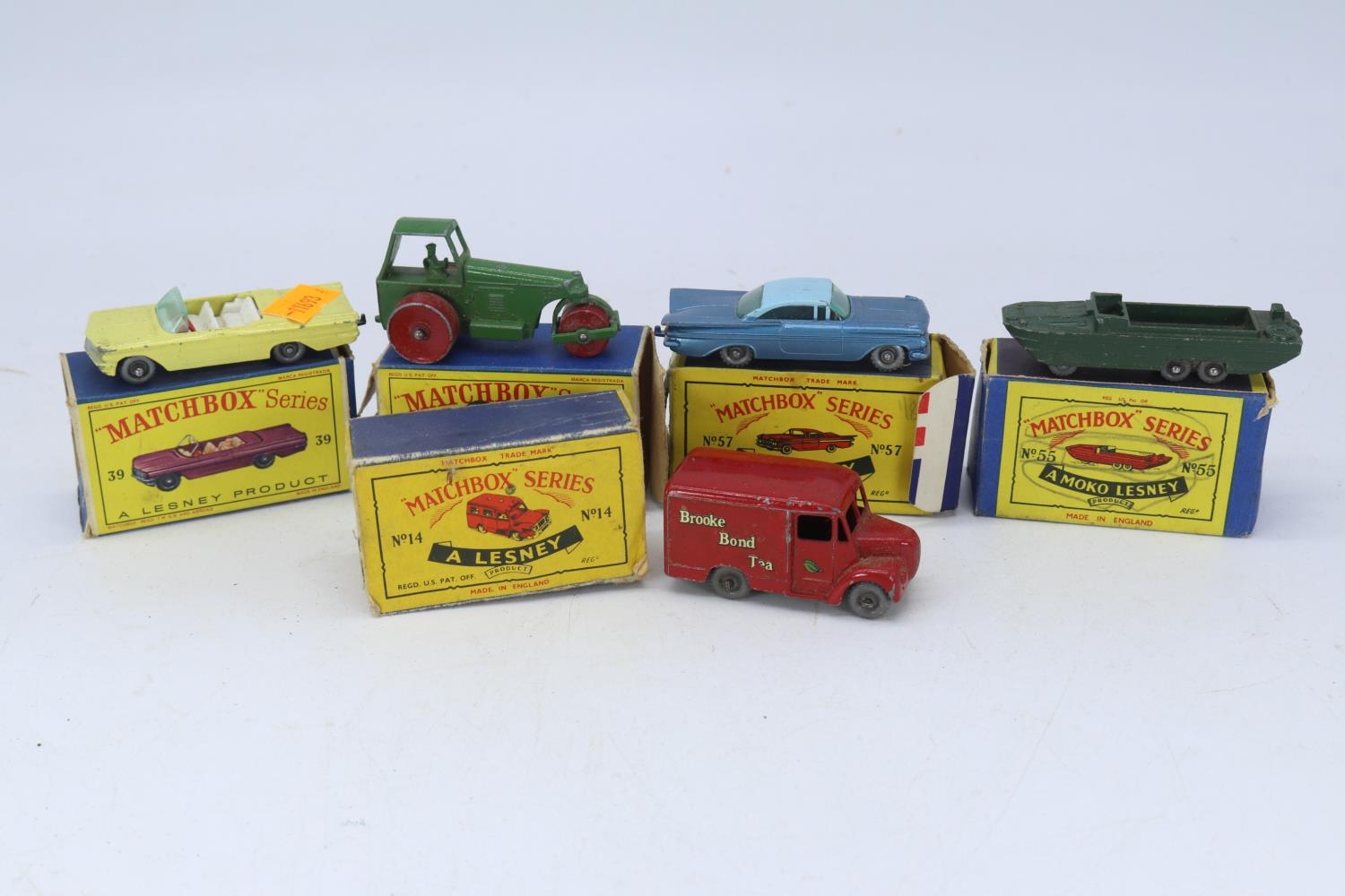 Matchbox Lesney Pontiac, road roller, Dukw, Chevrolet Imparla and a Trojan van all boxed showing various levels of playware to cars and boxes