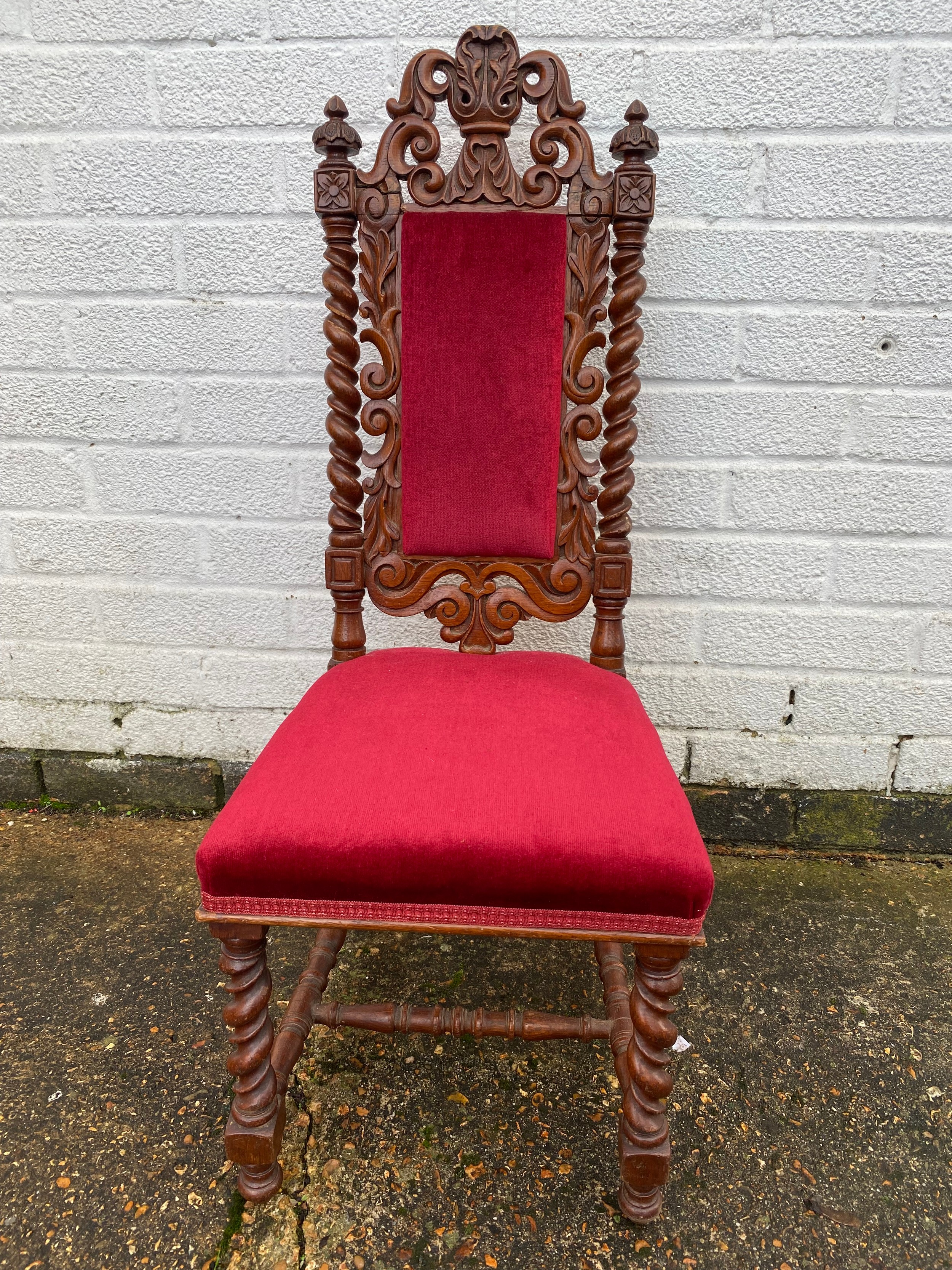 A 17th century style child's chair, with padded back and seat, carved supports and barleytwist legs -