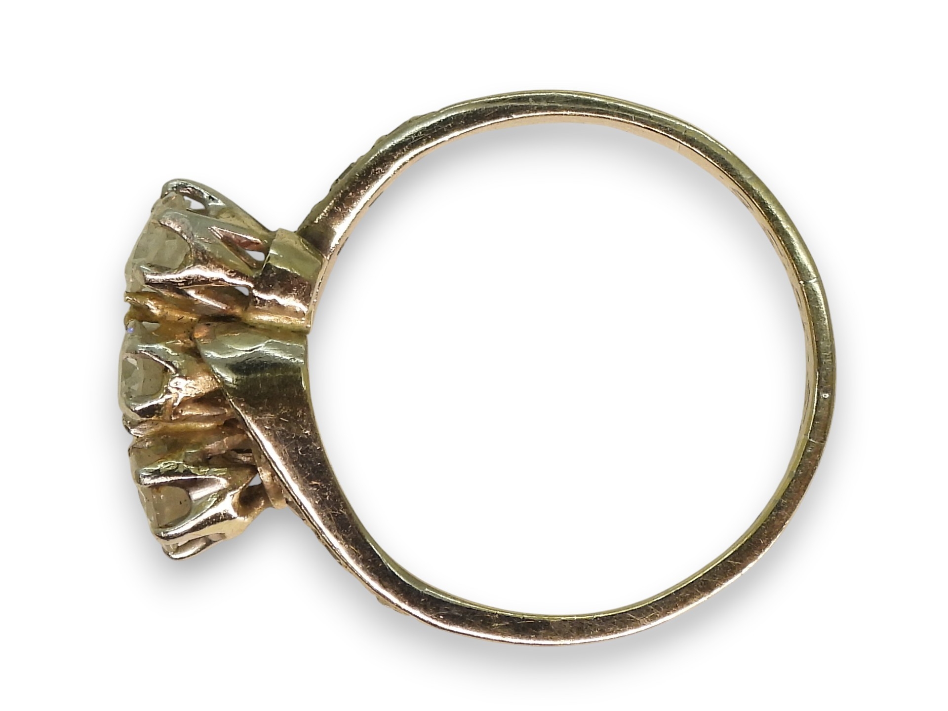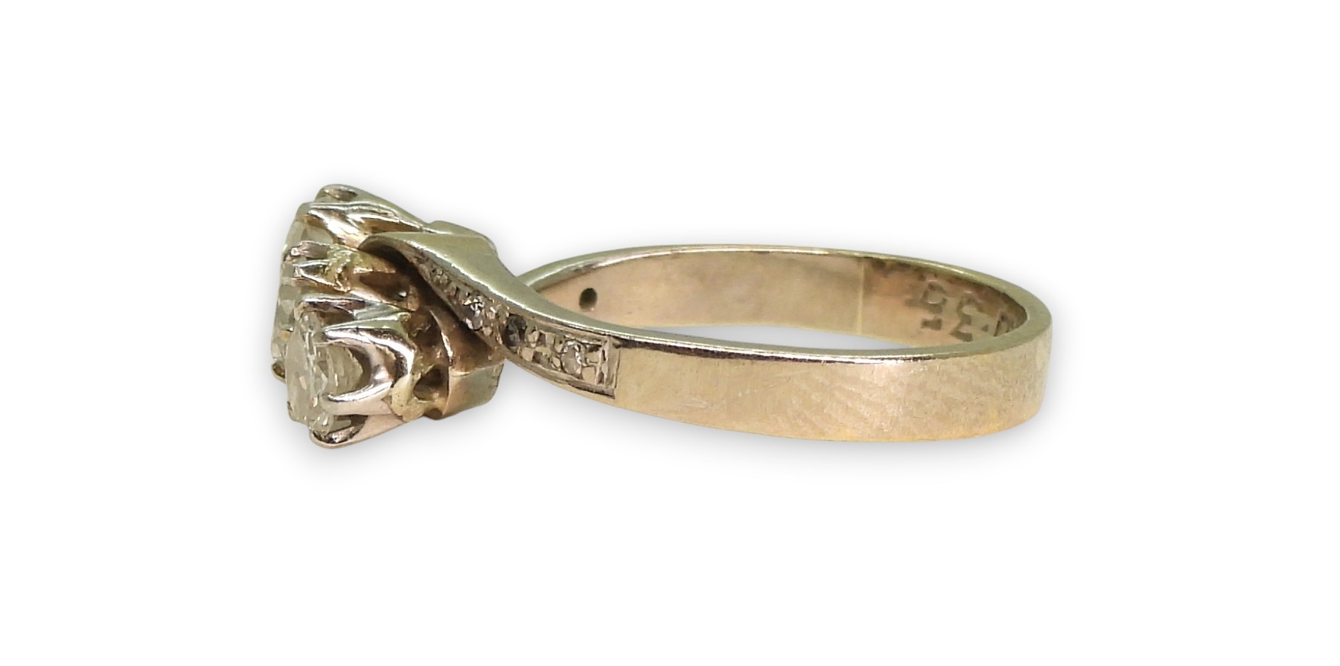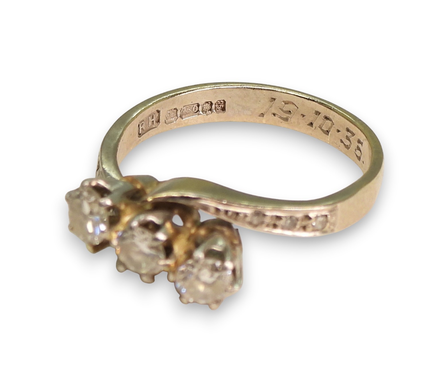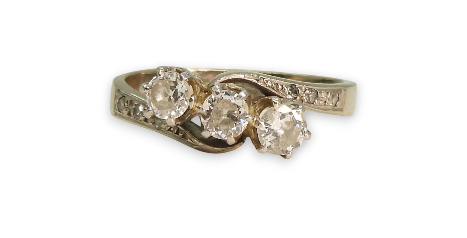 An 18ct white gold three stone diamond ring, set with estimated approx 0.50cts in total including the diamonds set to the shoulders. Finger size M, weight 3.9gms
