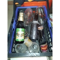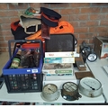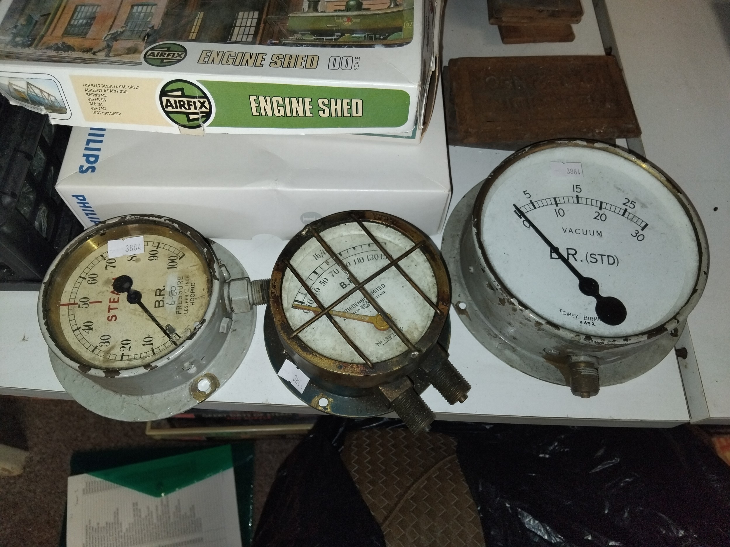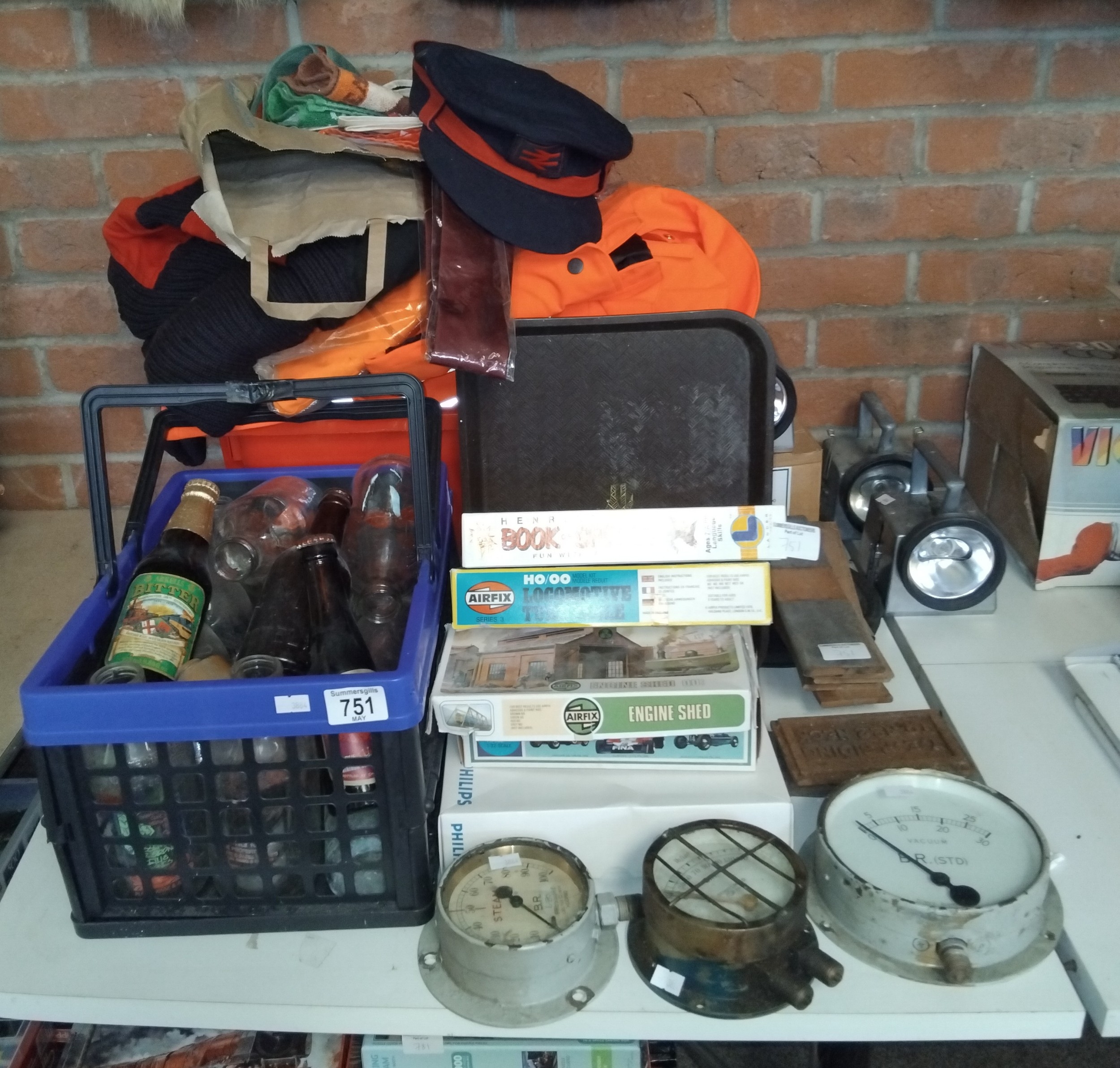 Collection of vintage Railway and Brewery items incl Beer bottles and bar towels, x3 BR Vacuum gauges, lanterns, matchbox and airfix models, British Rail cap etc