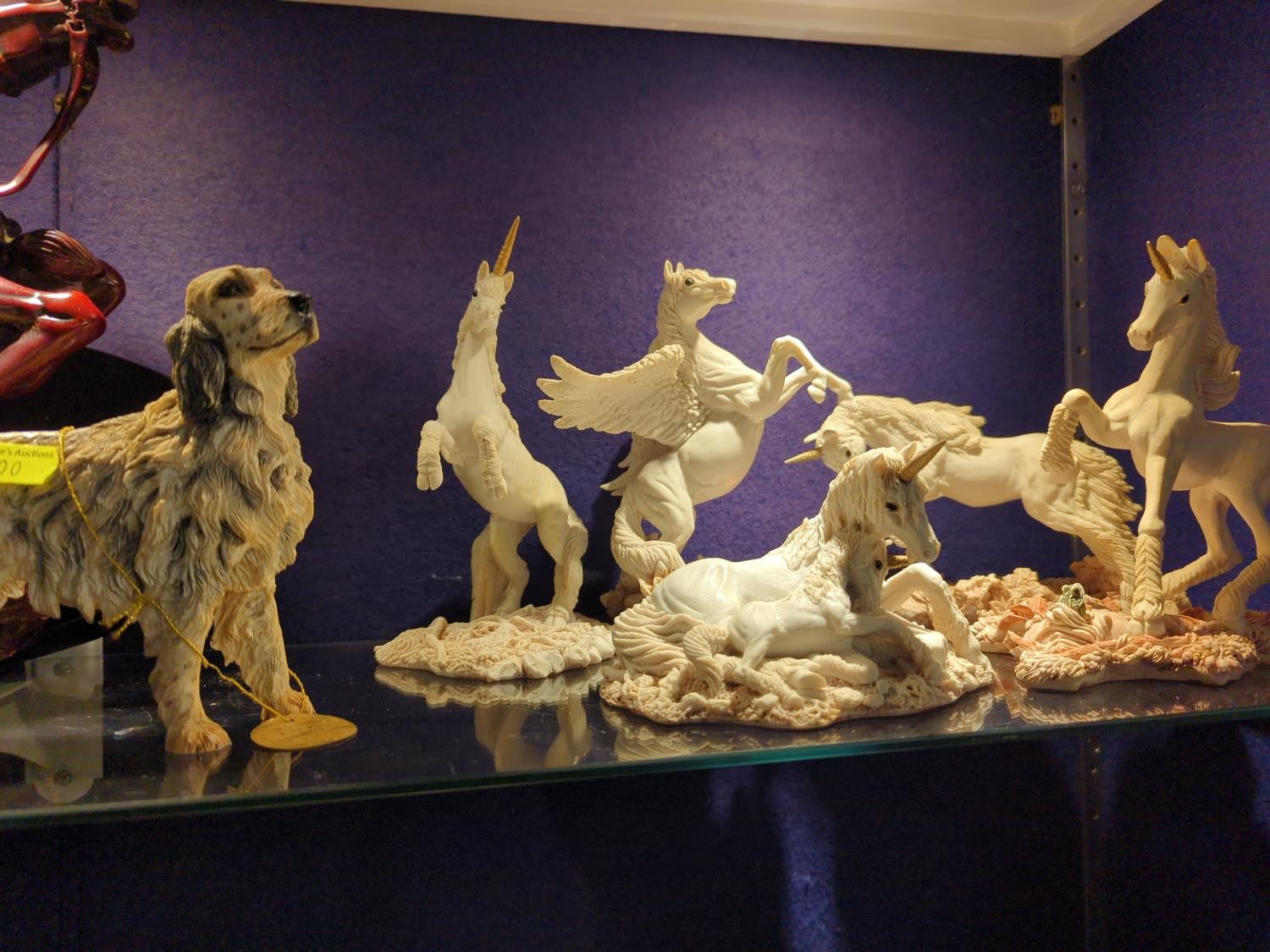Five resin unicorn figures by Fables Adoration and a Leonardo Collection English setter
