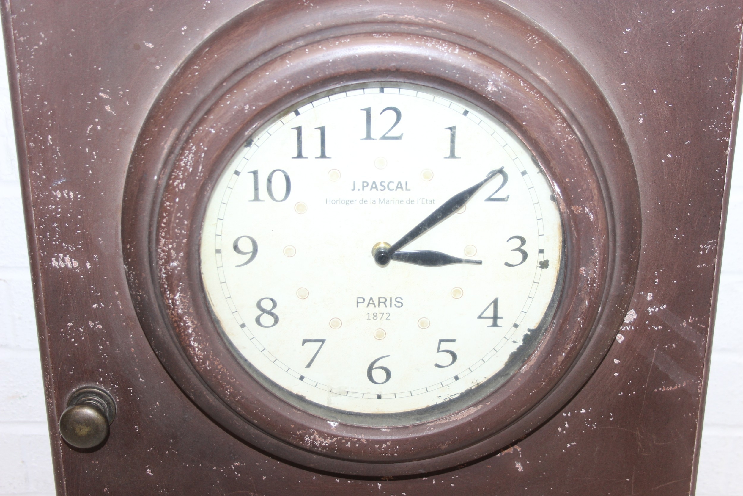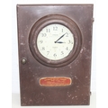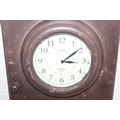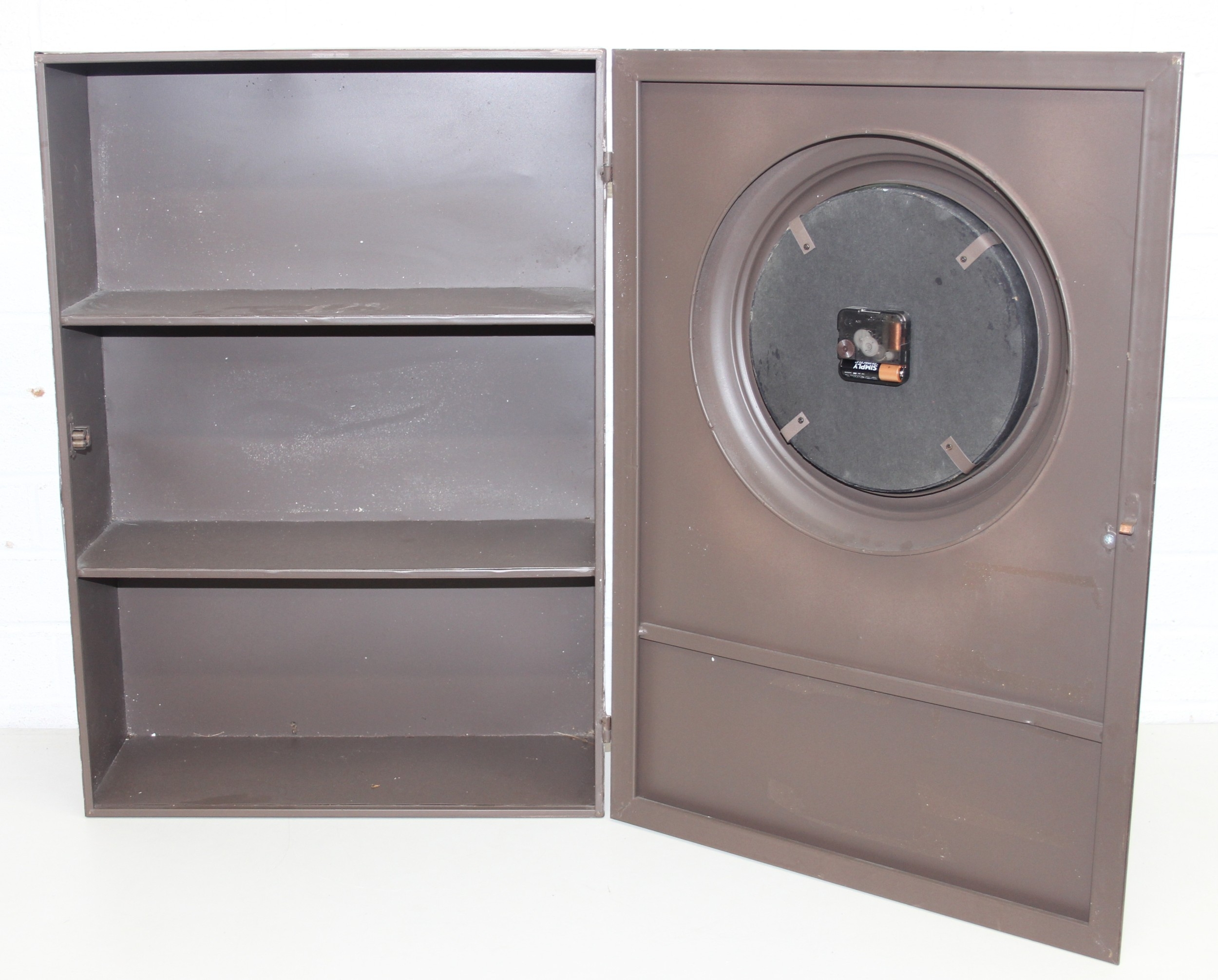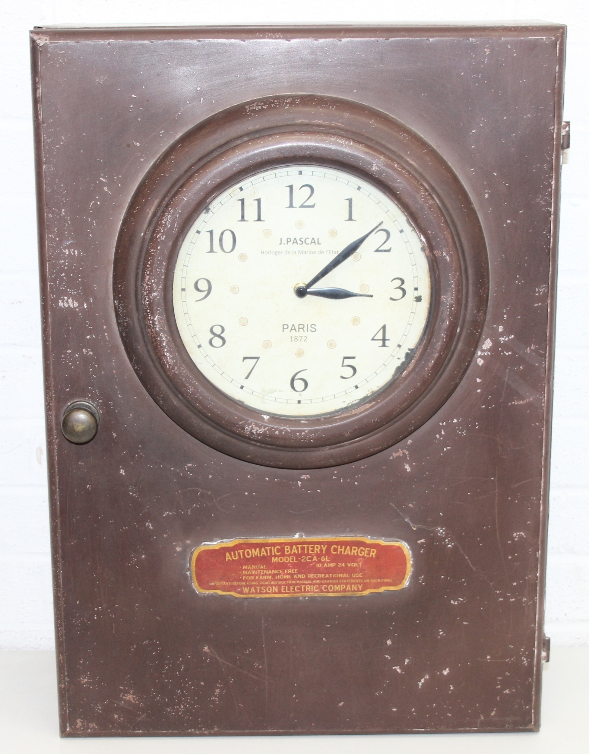 A modern industrial style painted metal wall cabinet with inset clock, the dial marked for J. Pascal of Paris, the cabinet marked Automatic Battery Charger Model 2CA-6L by the Watson Electric Company, 46cm x 21cm x 66cm