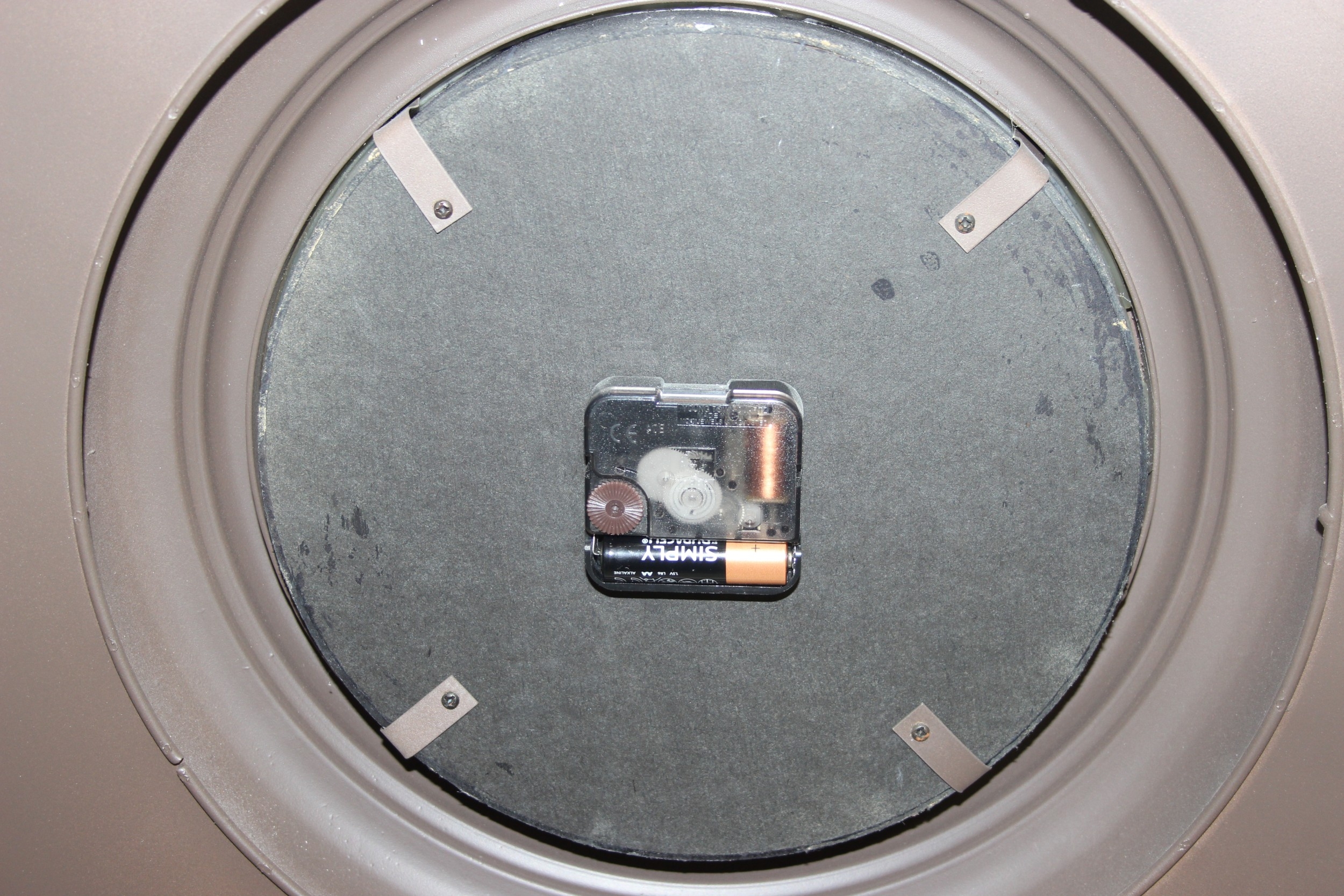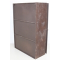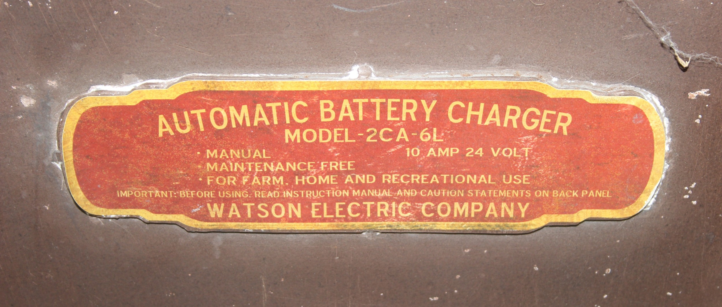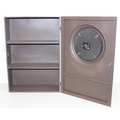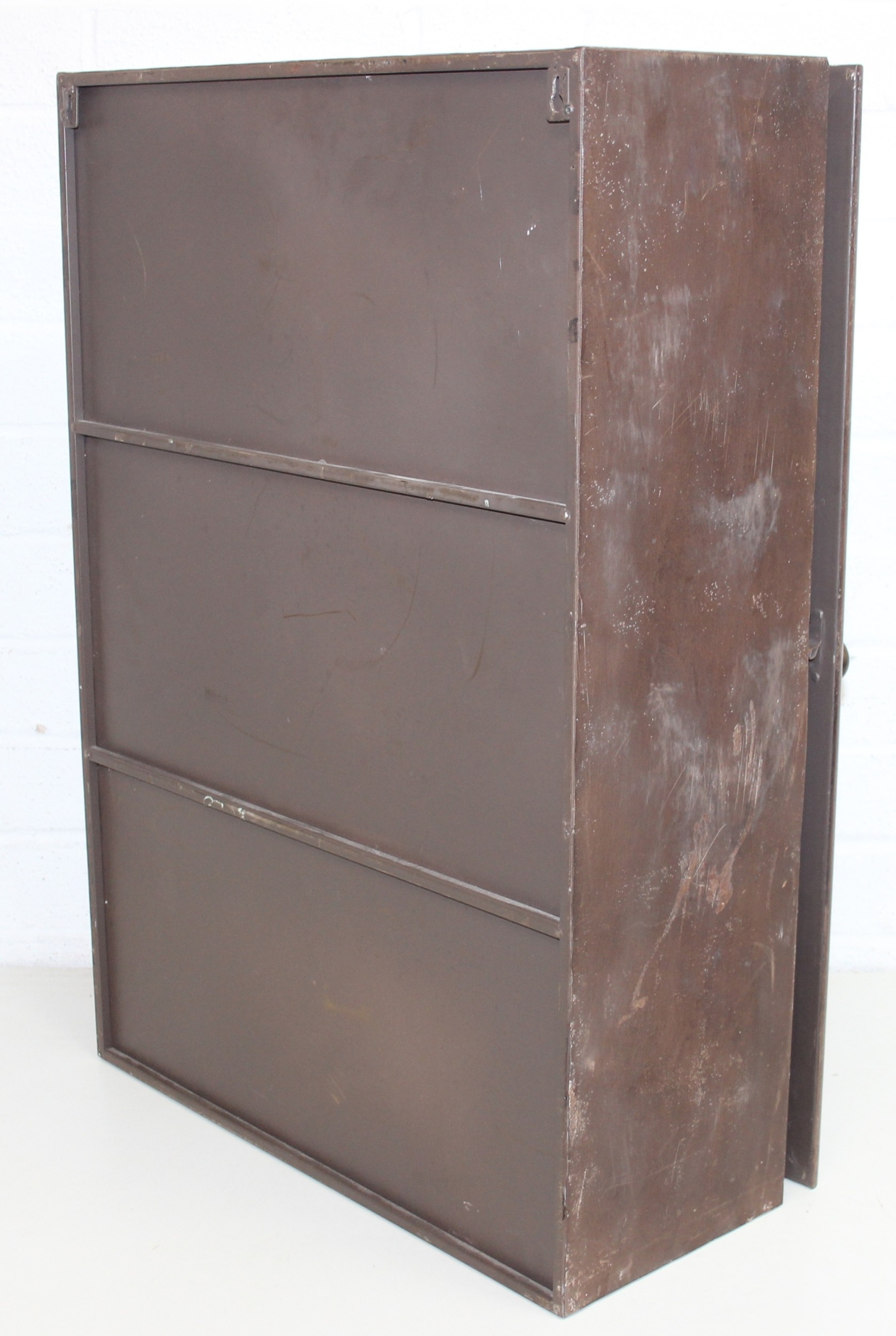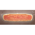 A modern industrial style painted metal wall cabinet with inset clock, the dial marked for J. Pascal of Paris, the cabinet marked Automatic Battery Charger Model 2CA-6L by the Watson Electric Company, 46cm x 21cm x 66cm