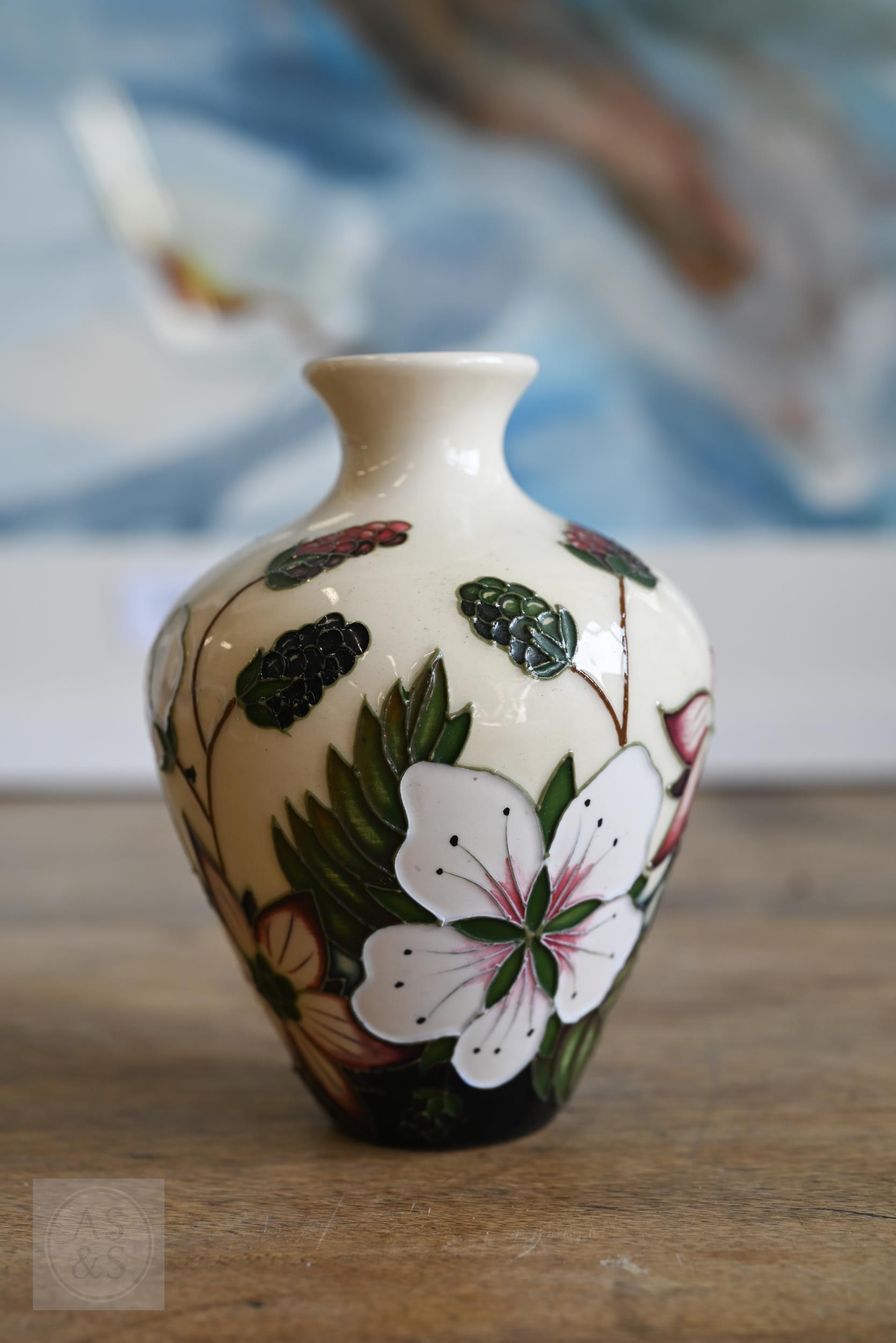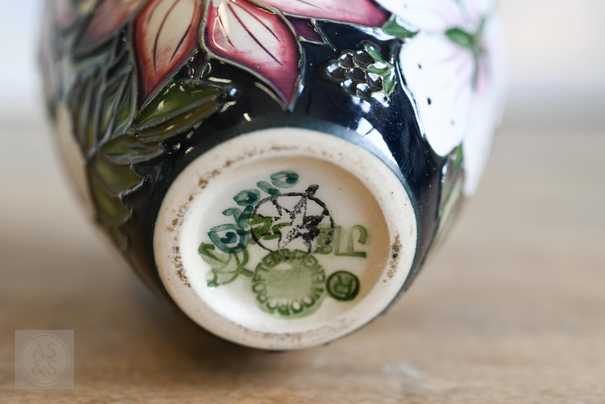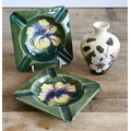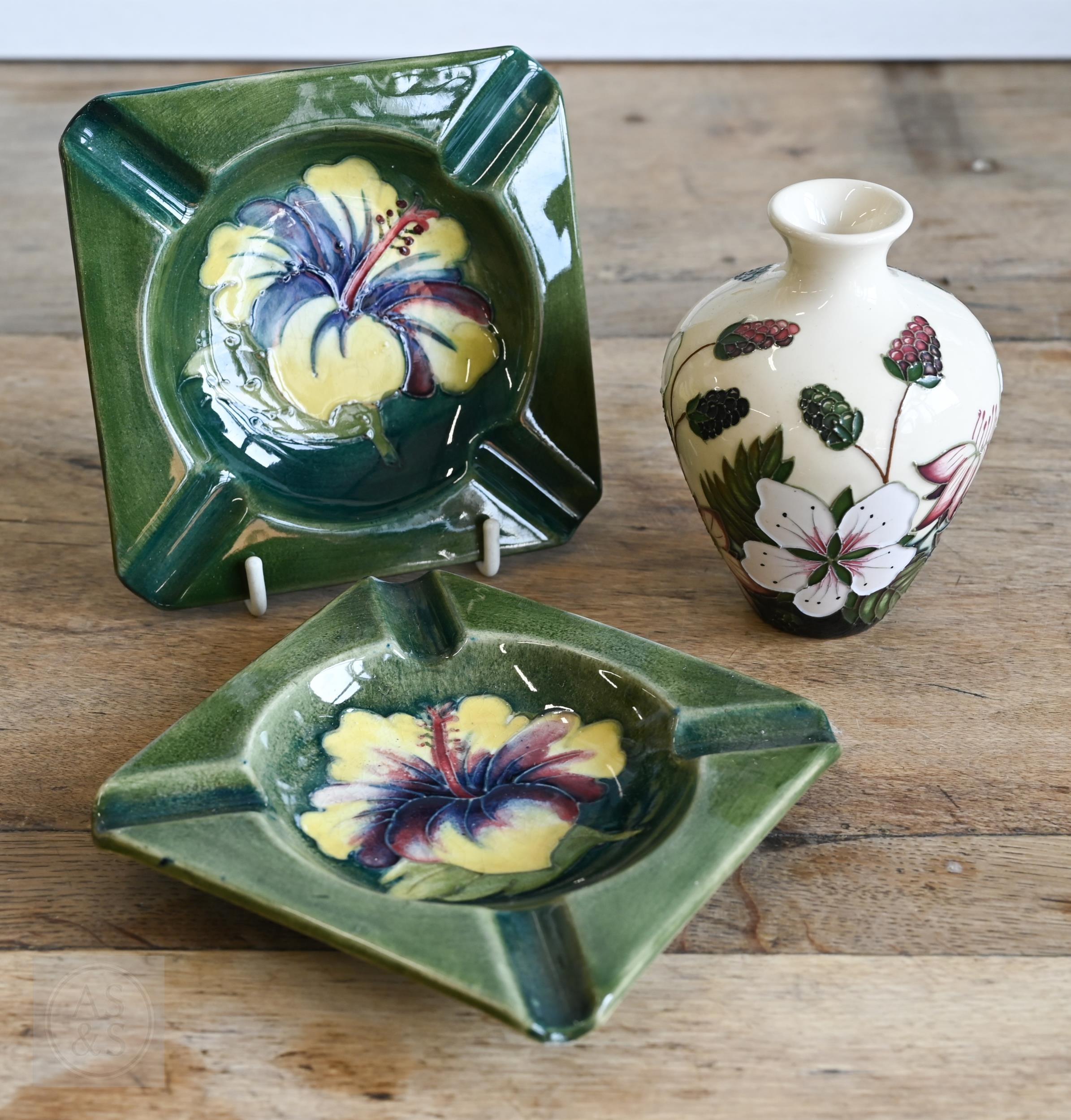 Two vintage Moorcroft pottery ashtrays with floral decoration, to/w a later 'Bramble Revisited' small vase (3)