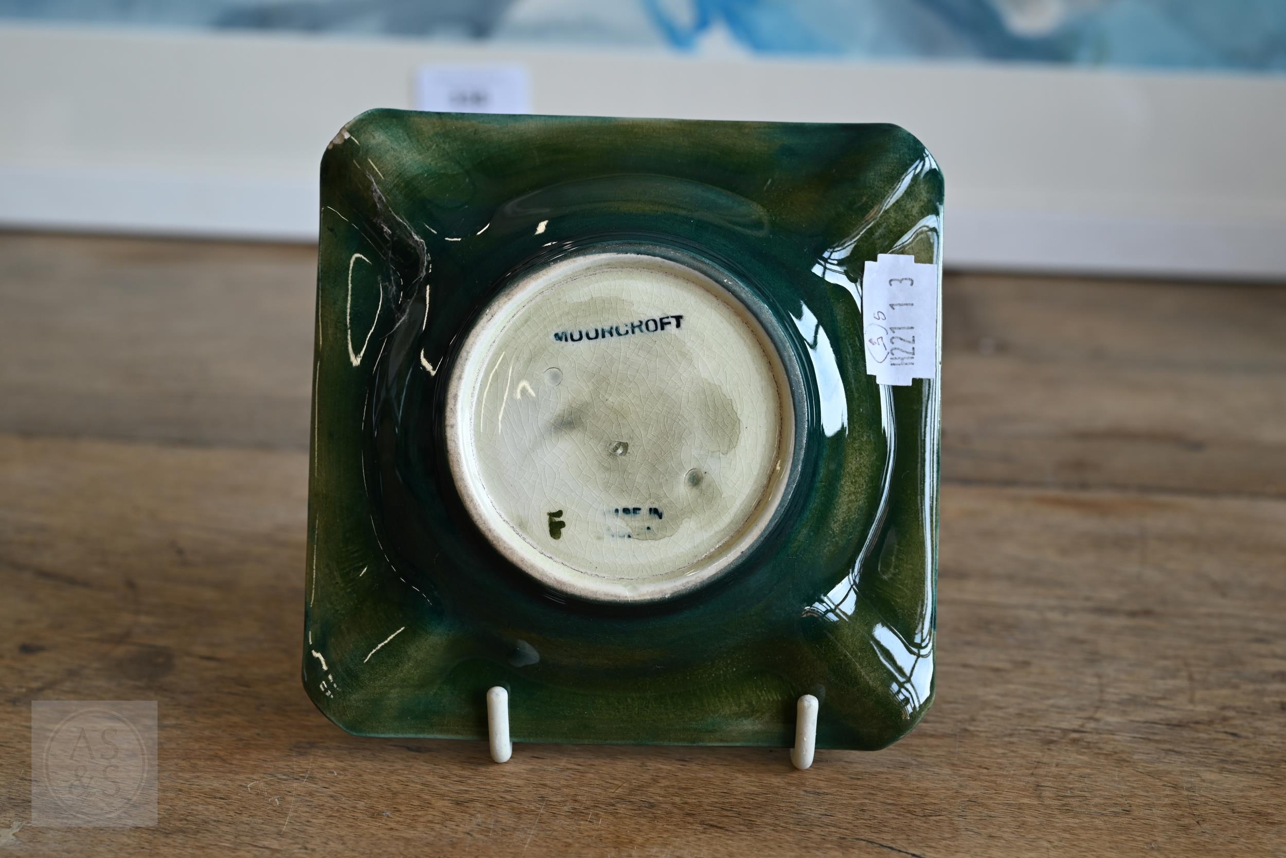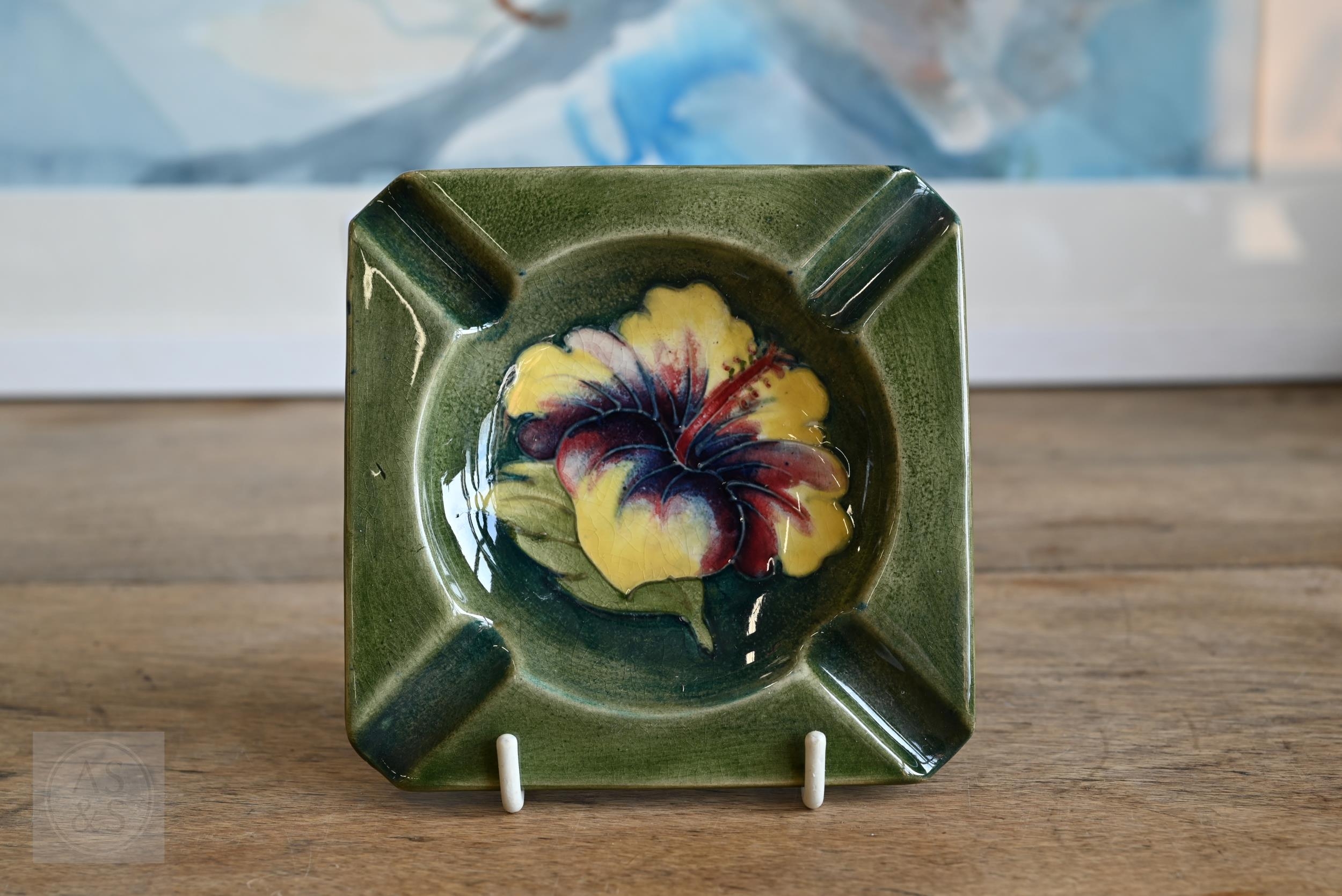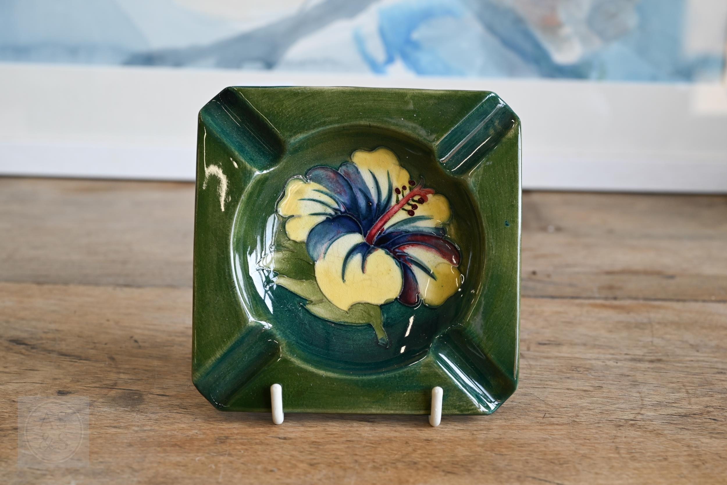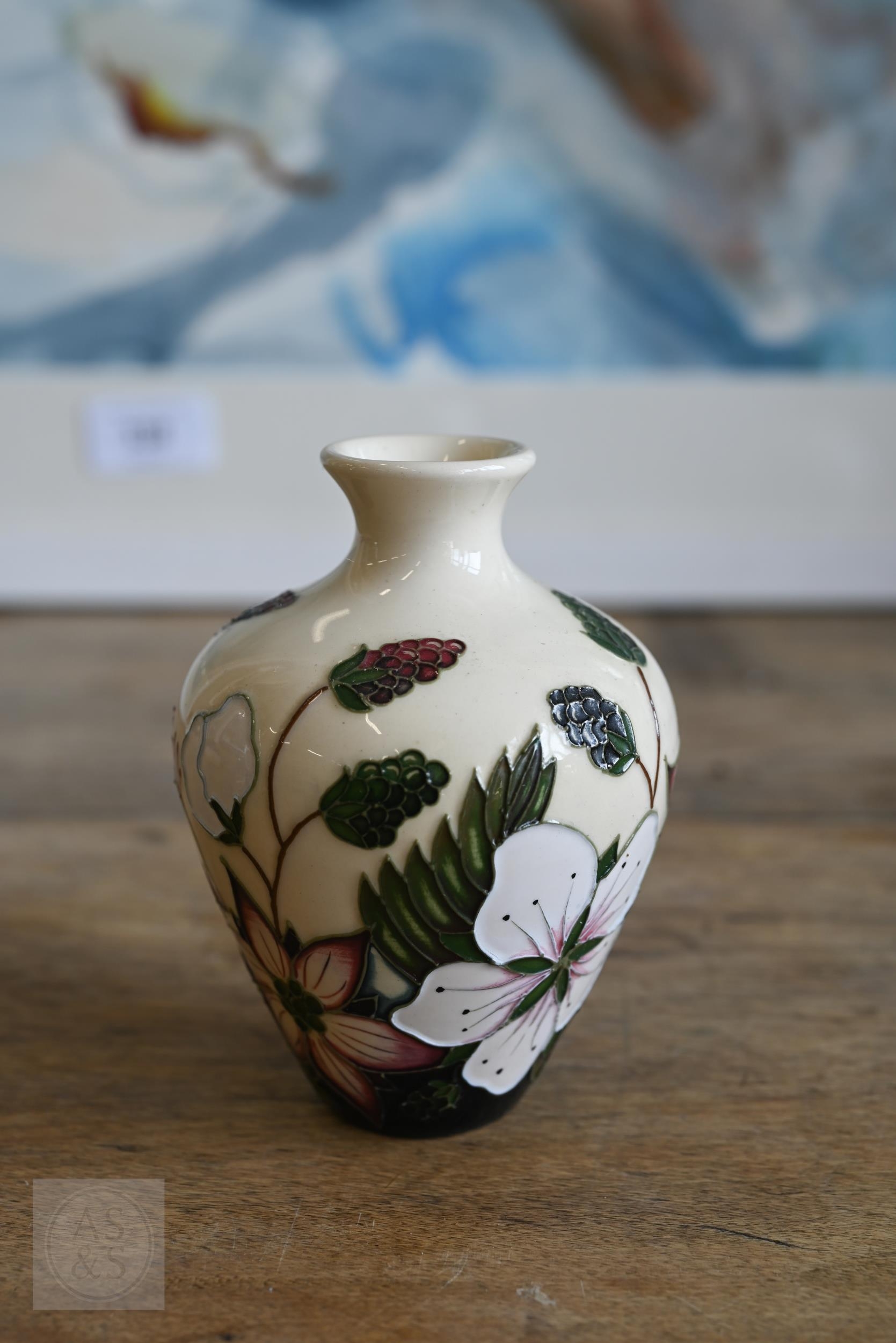 Two vintage Moorcroft pottery ashtrays with floral decoration, to/w a later 'Bramble Revisited' small vase (3)