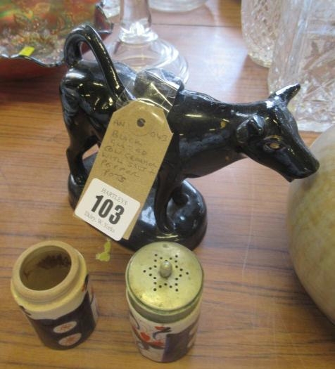 BLACK GLAZED COW CREAMER WITH SALT AND PEPPER POTS