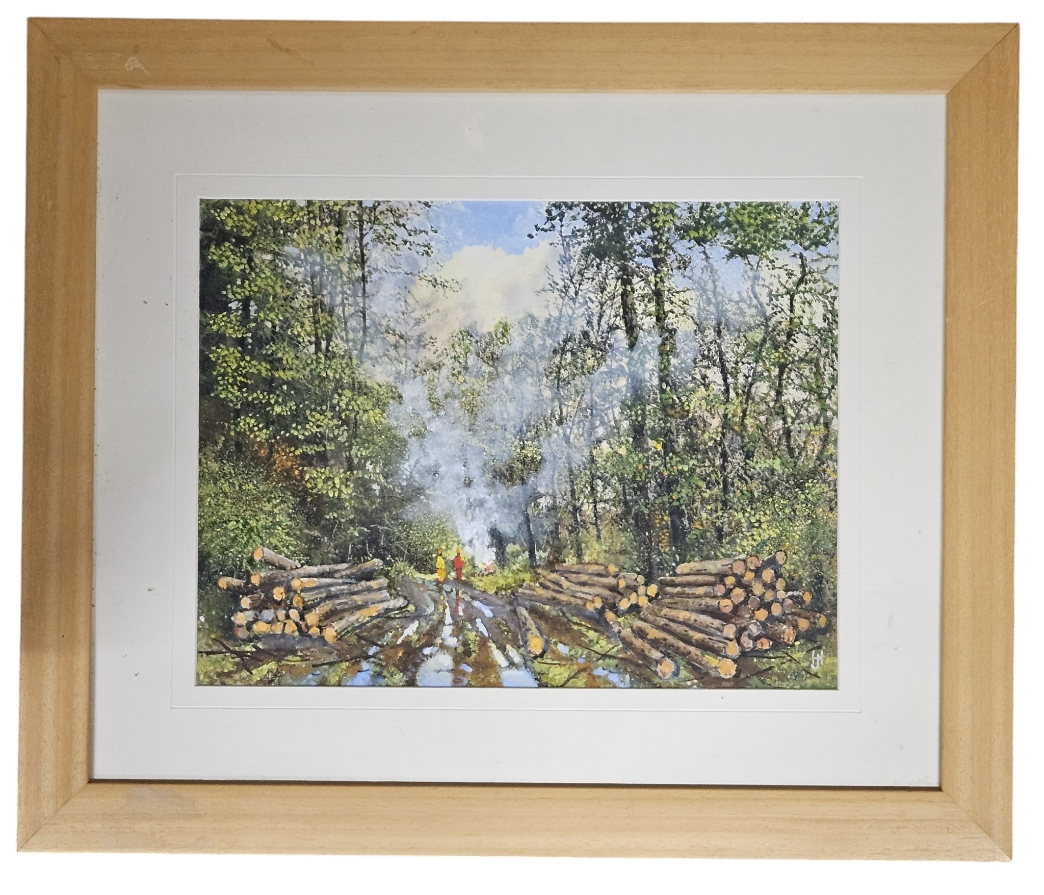 A 20th Century Acrylic/Oil On Paper by John Hiscocks 'Logging activities'. Monogramed LR.