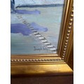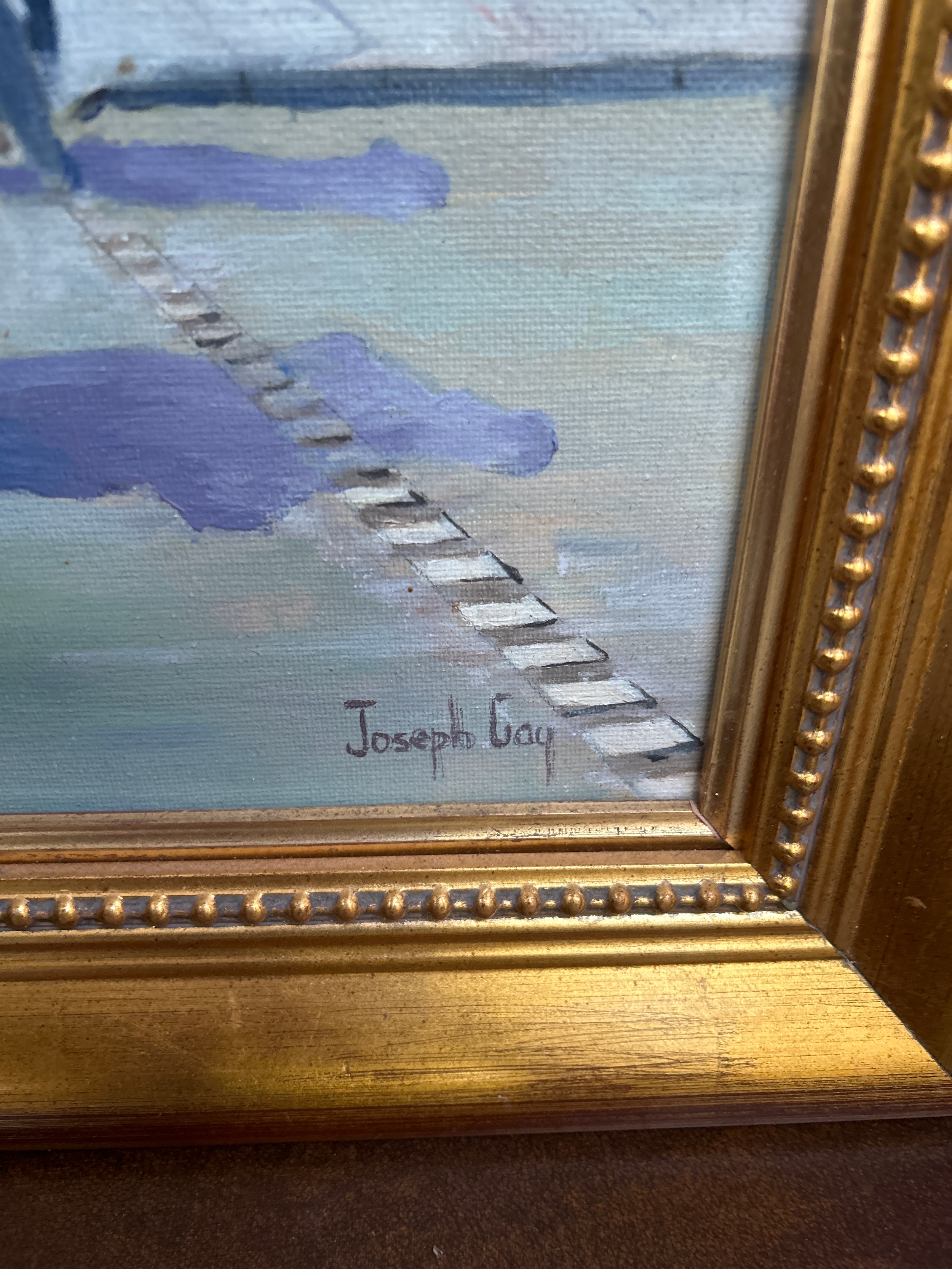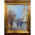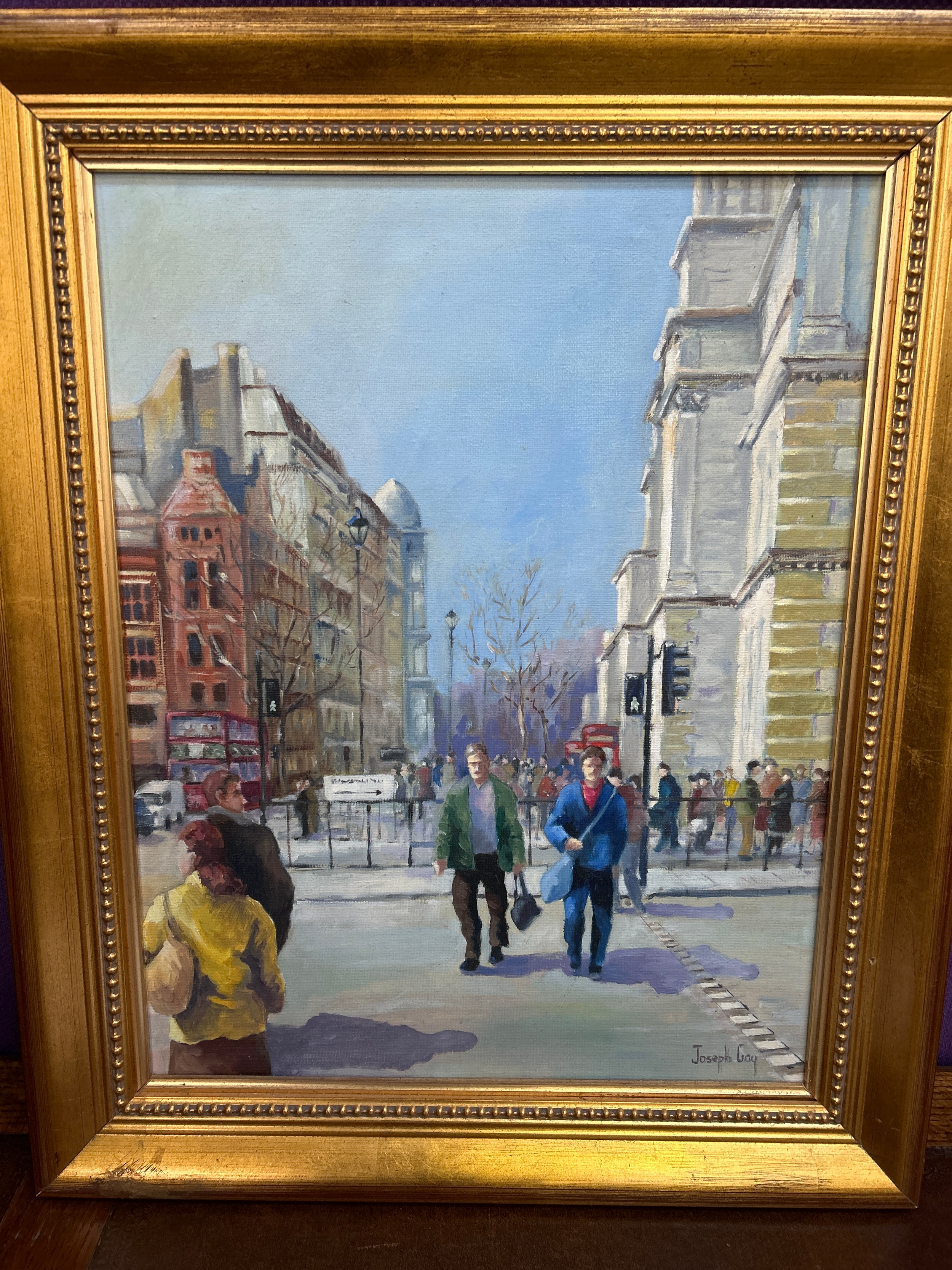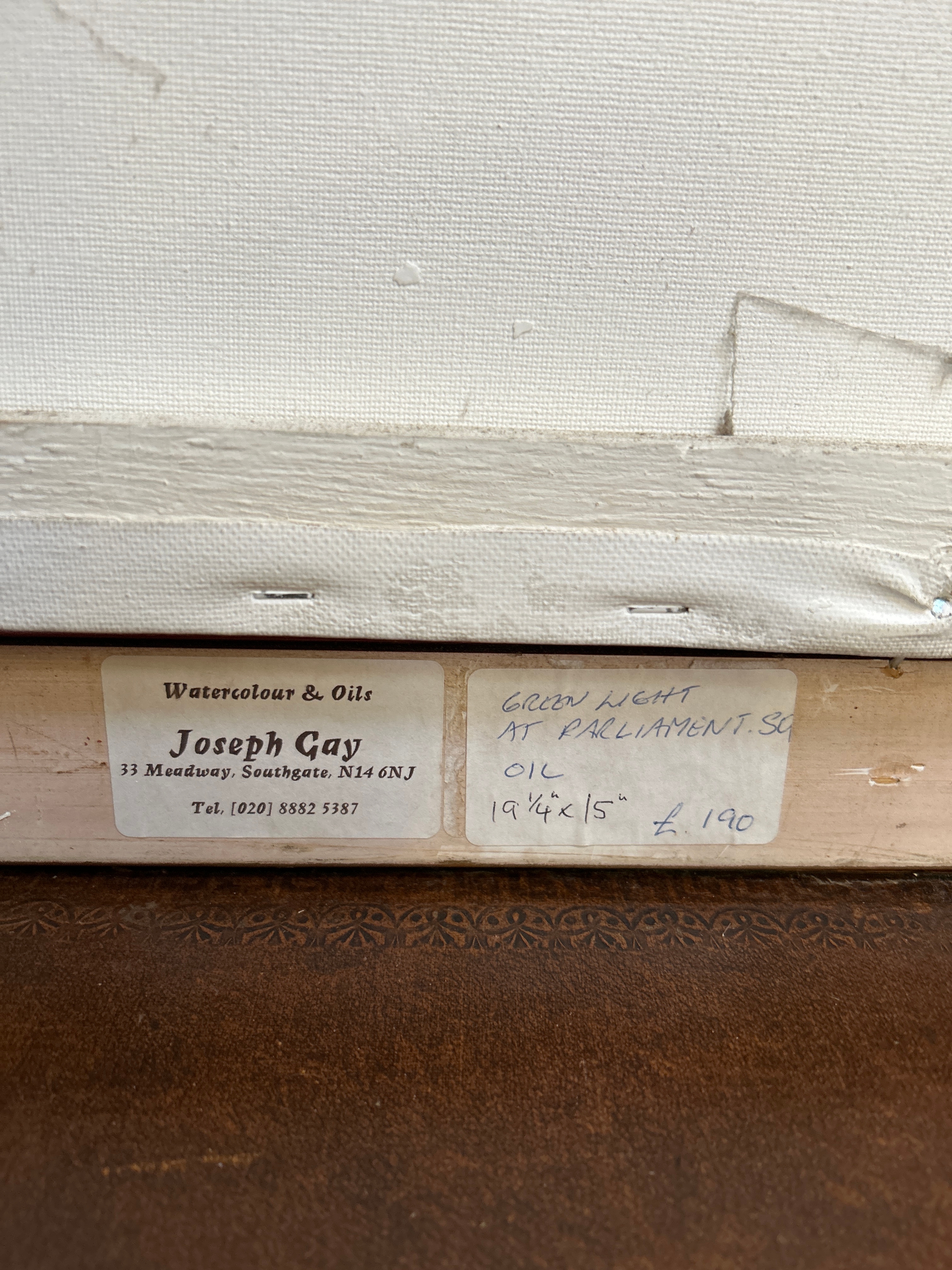 Joseph Gay, London Artist, late 20th Century. Oil painting on canvas entitled “Green Light at Parliament Square” . Signed to front and with artists label and exhibition label verso. Gilt frame 50cm x 63cm