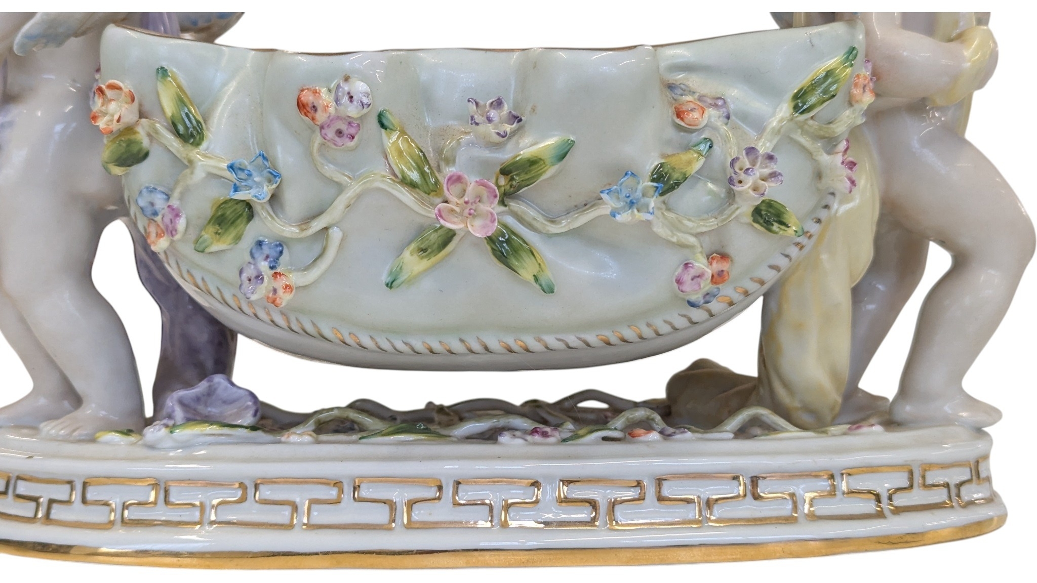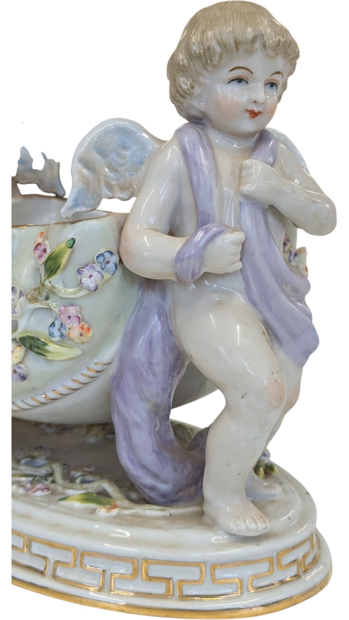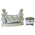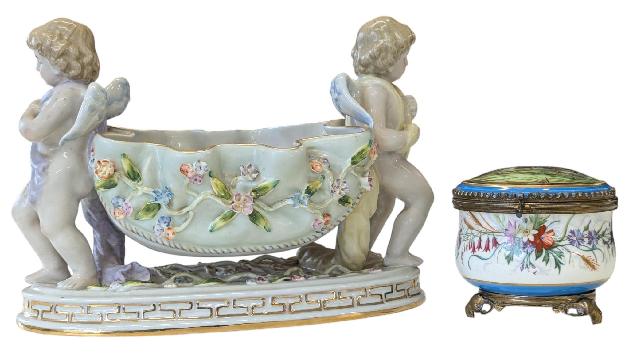 A 20th century German Dresden style porcelain centre piece having figural putti to each side with floral encrustations to body and gilt painted meander to base. Sèvres porcelain manufactory mark to underside. Together with a Limoges style French jewellery box with Rococo Fragonard type courting couple to top.