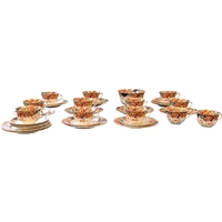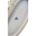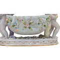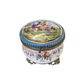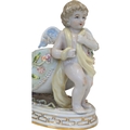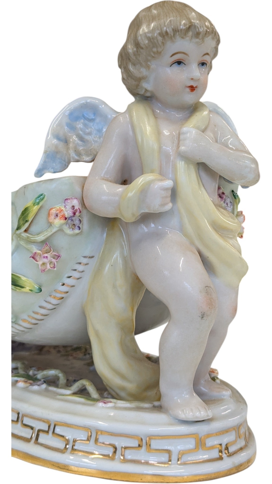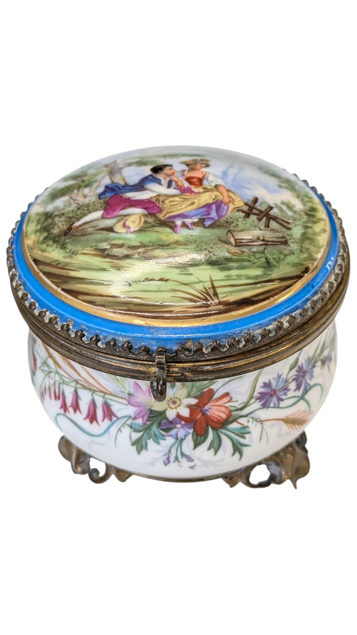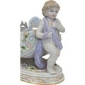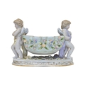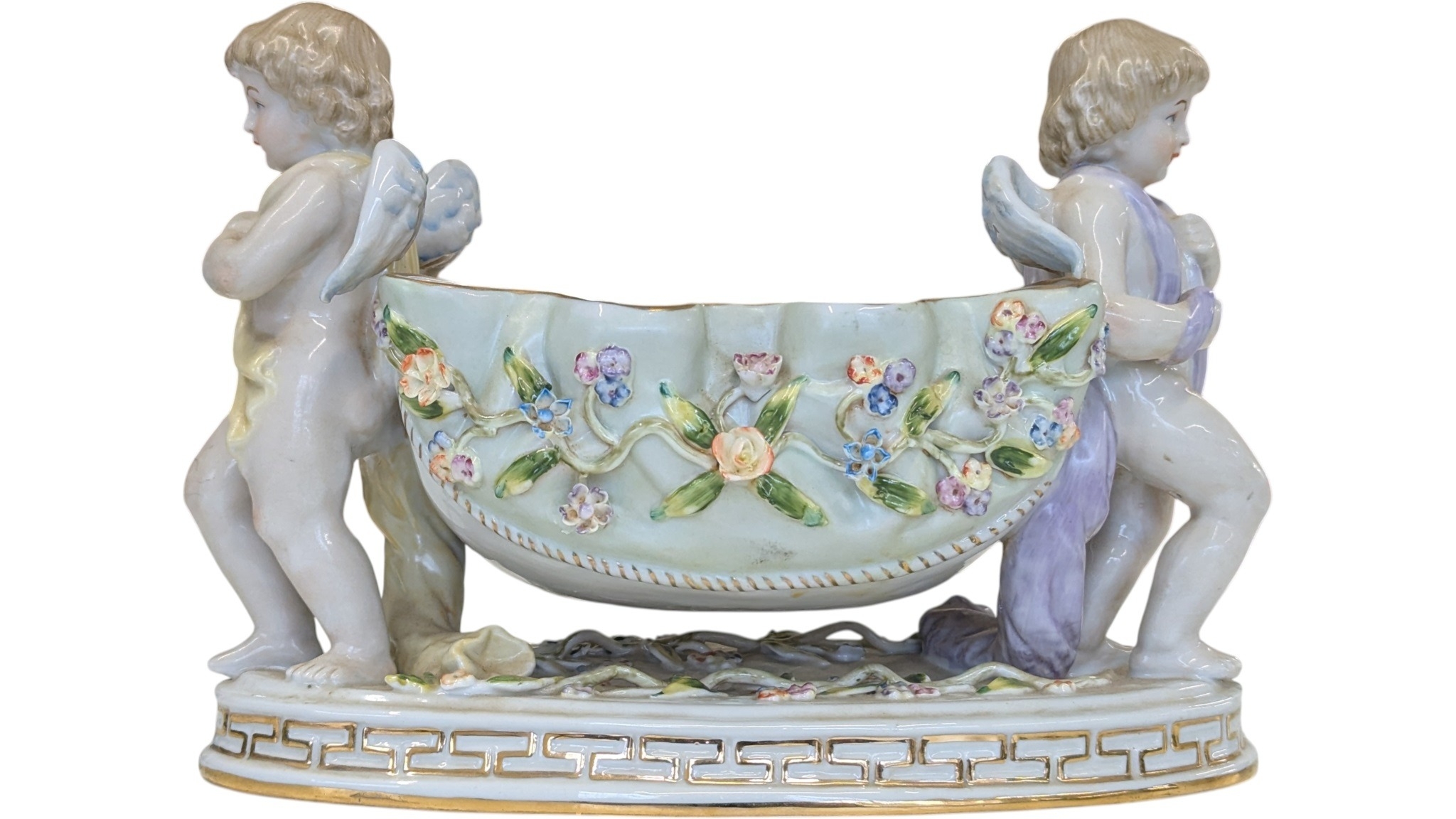 A 20th century German Dresden style porcelain centre piece having figural putti to each side with floral encrustations to body and gilt painted meander to base. Sèvres porcelain manufactory mark to underside. Together with a Limoges style French jewellery box with Rococo Fragonard type courting couple to top.