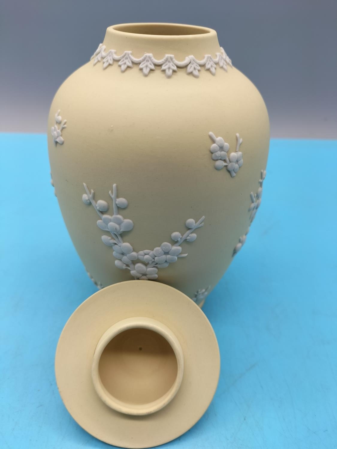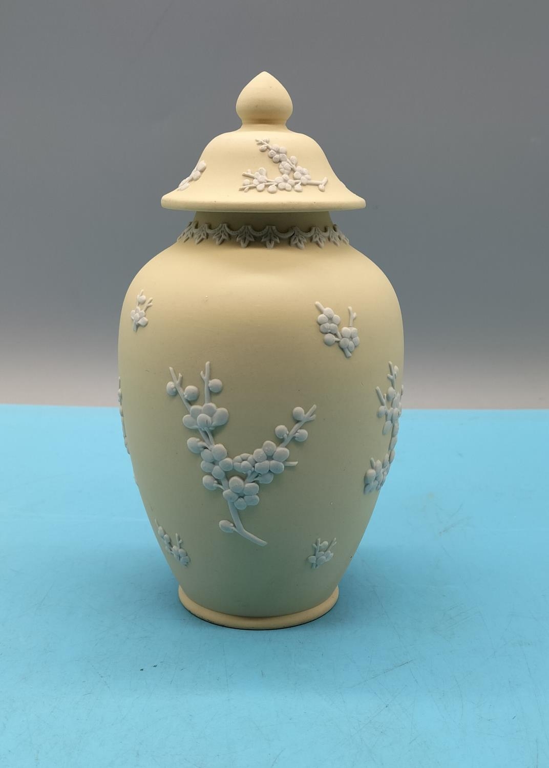 Wedgwood Yellow Jasper Temple Jar in the 'Prunus' Pattern. 18cm Tall.