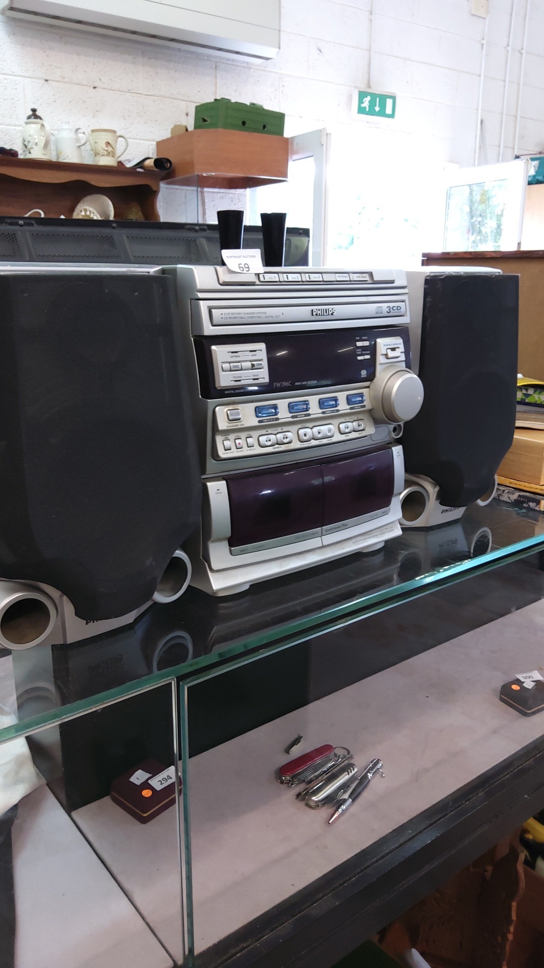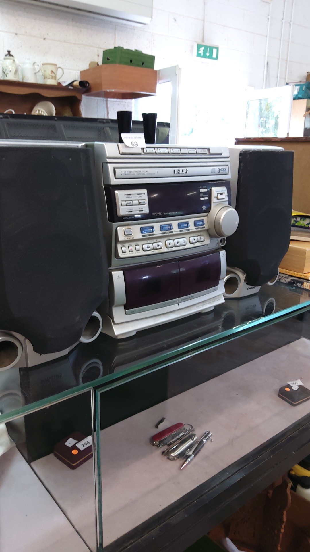 Philips FW39C 3-CD mini hi-fi system with twin cassette deck, AM/FM tuner and paired bookshelf speakers, circa early 2000s.(parts or repair)