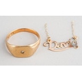 A 9ct gold signet ring set with a diamond chip, hallmarked, UK ring size T and a half, together with a 9ct pendant 'David', gross weight 4.5 grams (2)