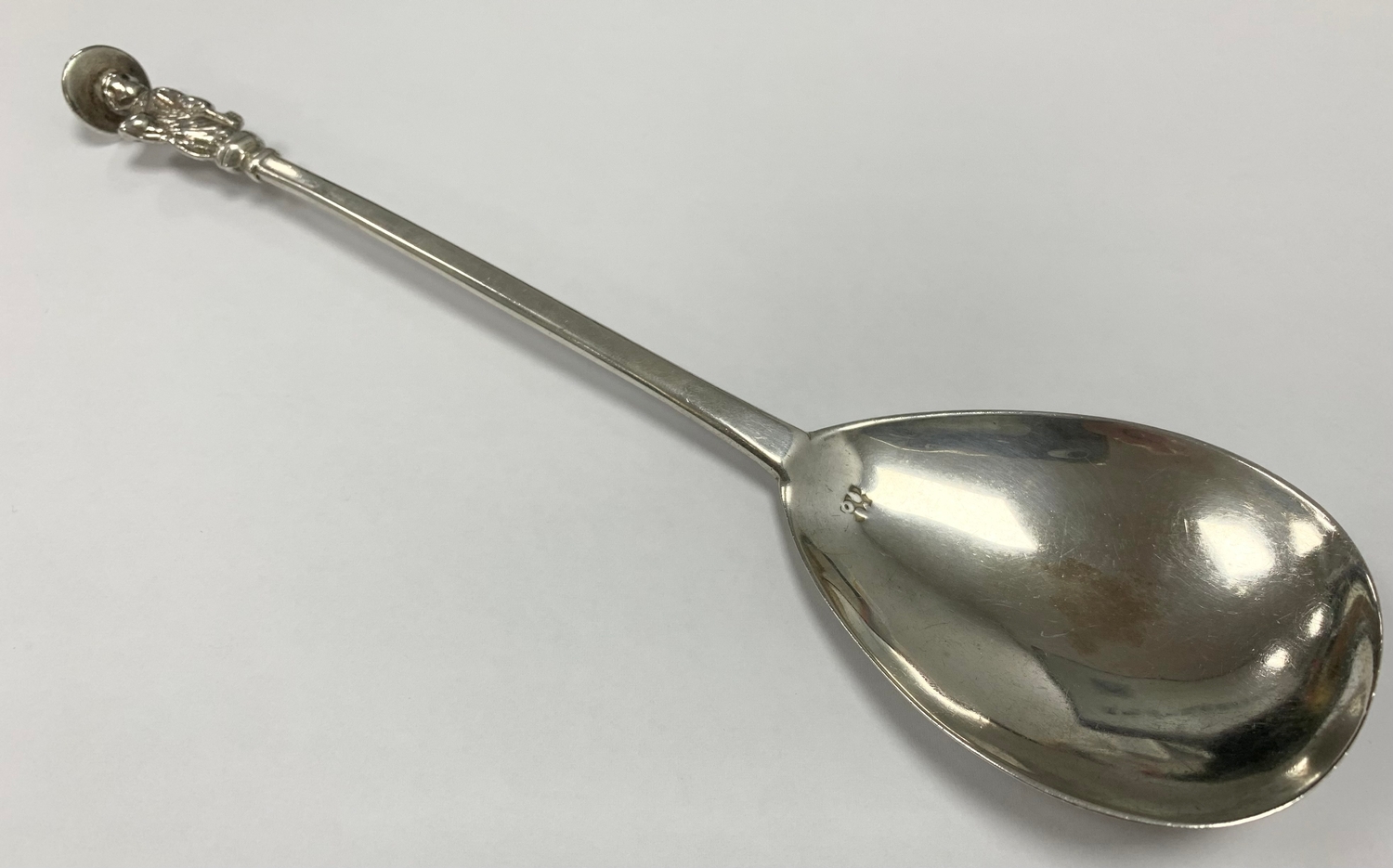 A XVII Century Style Apostle Spoon, Saint Peter with spoked nimbus, triple stamped to back of stem and to front of fig shaped bowl (unidentified / provincial?), 19.5cm long. small trace of gilding to centre of bowl XRF tested 93% silver 43grams