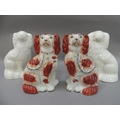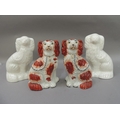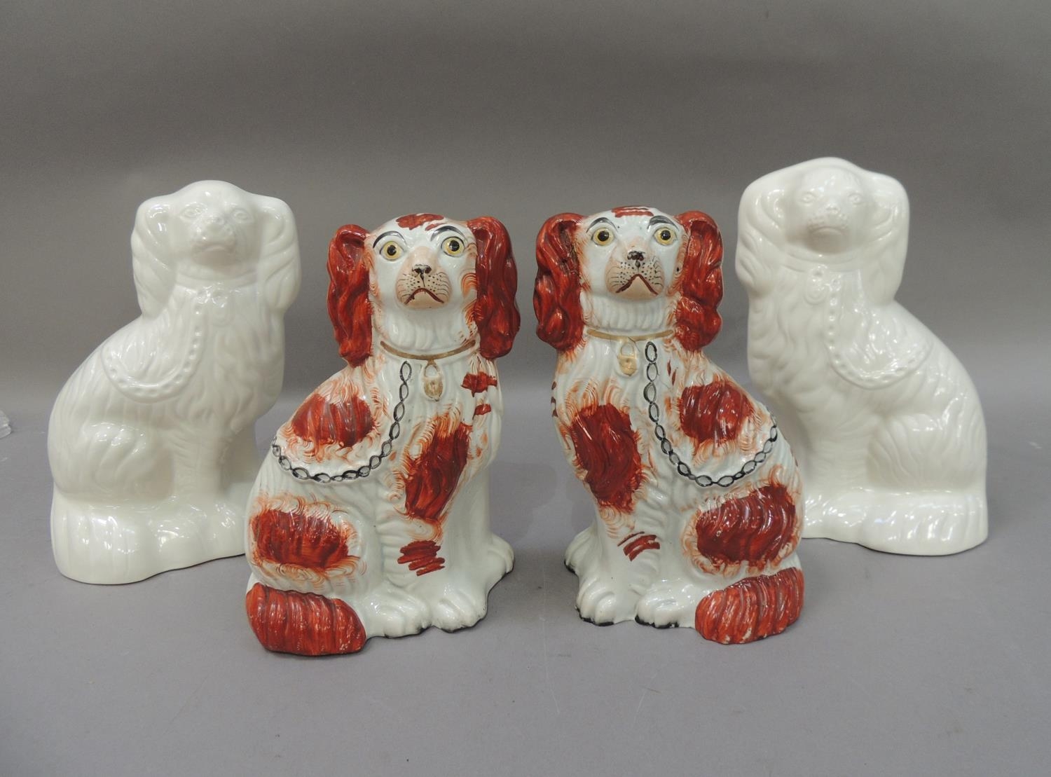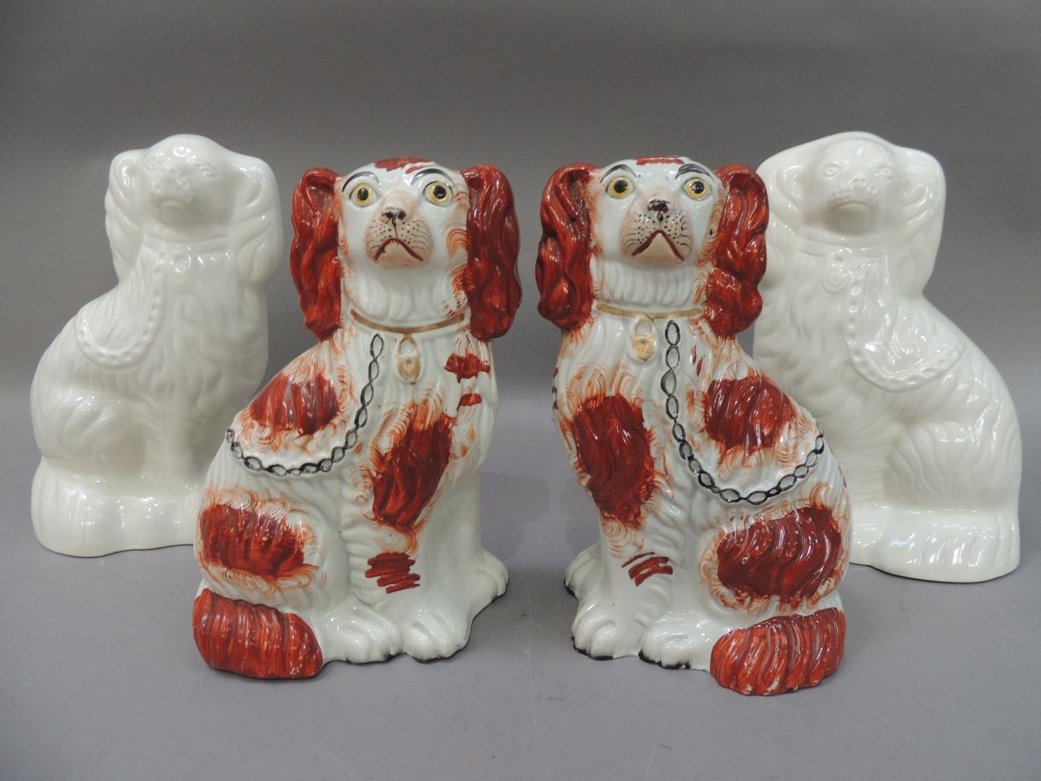 A pair of Victorian Staffordshire spaniels with rust red decorated bodies with gilt collars, black chains and decorated snouts and eyes, 22cm high (af); together with a pair of reproduction Beswick white pottery spaniels, 24cm high (4)