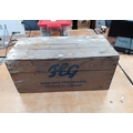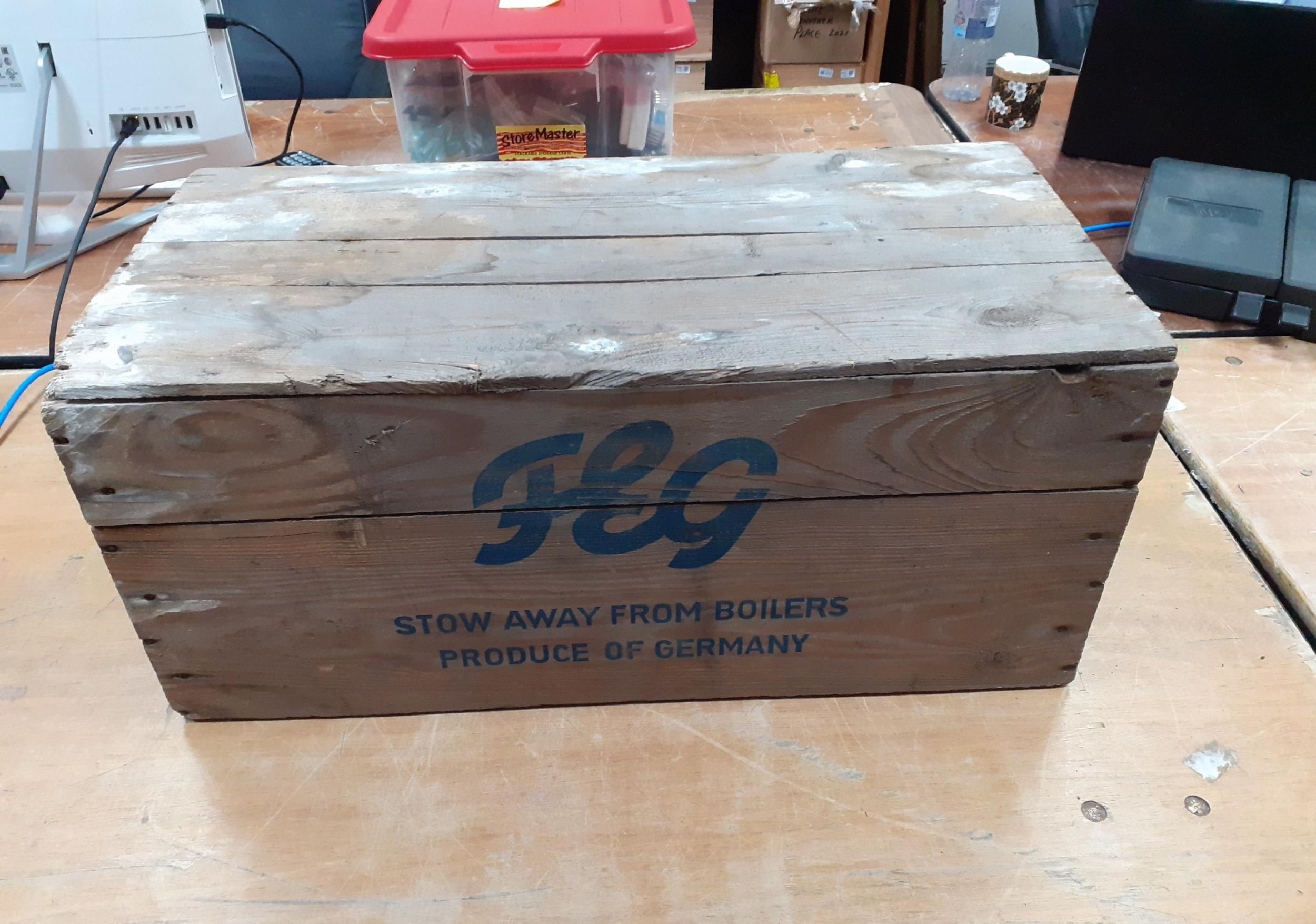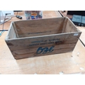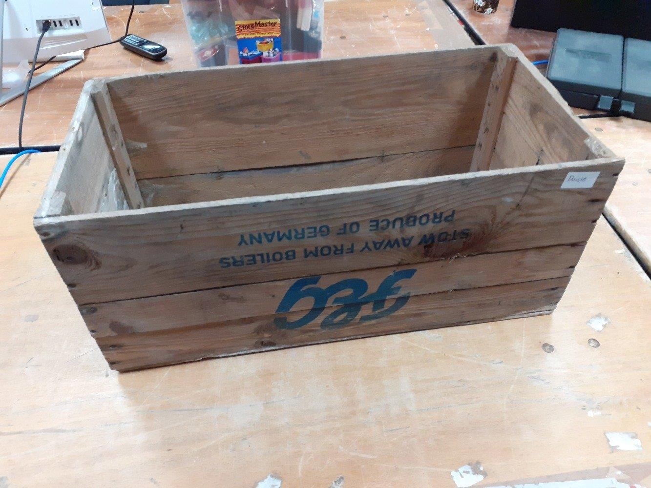 An old wooden box, ideal for storing logs, stamped 'Produce of Germany', measures 61x30x26cm approx