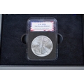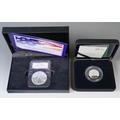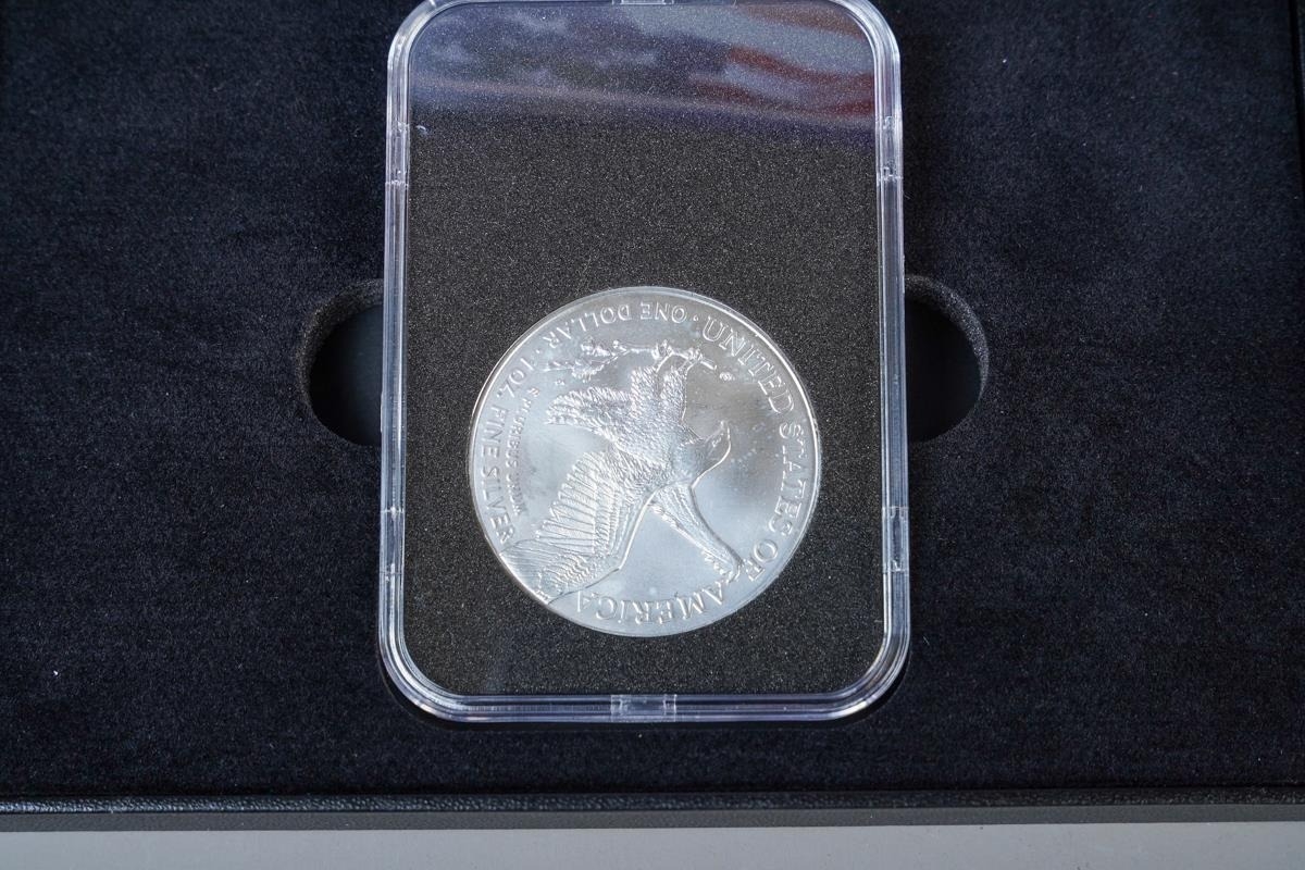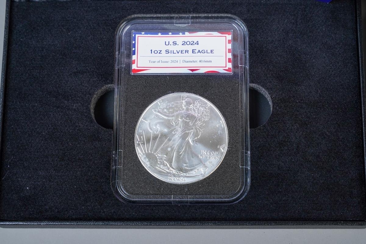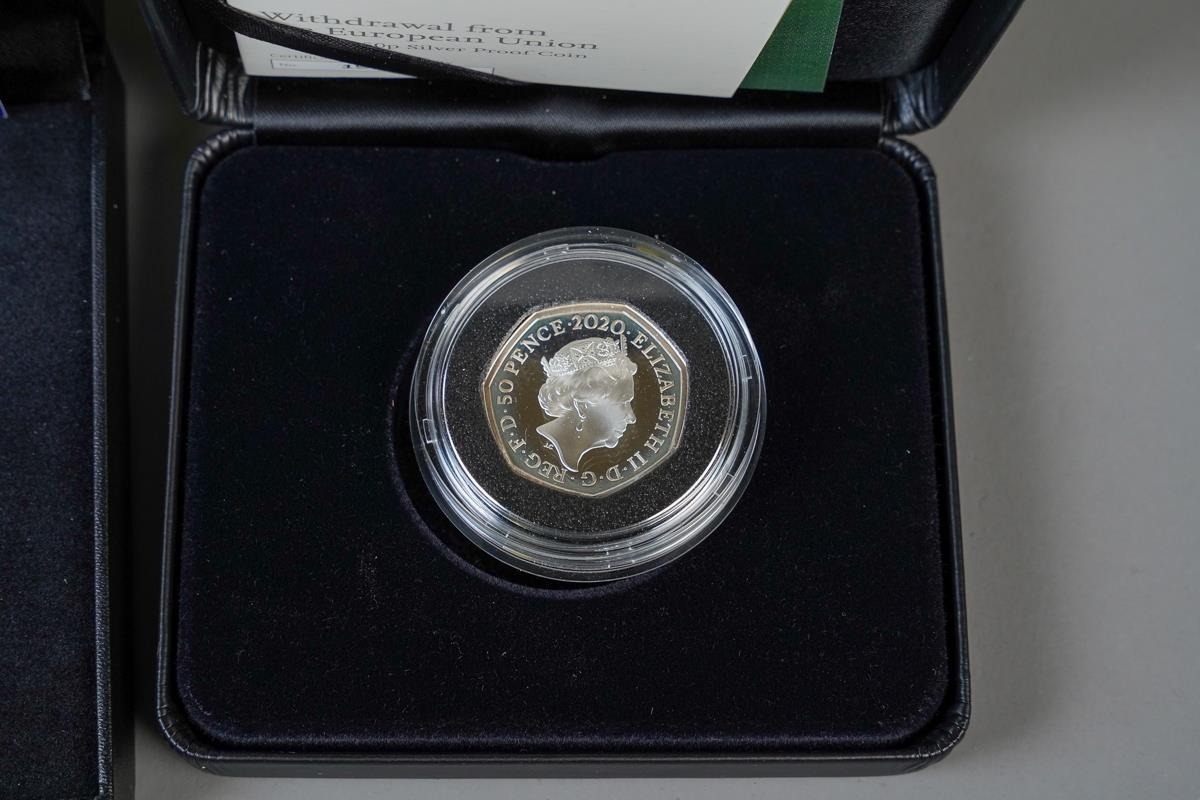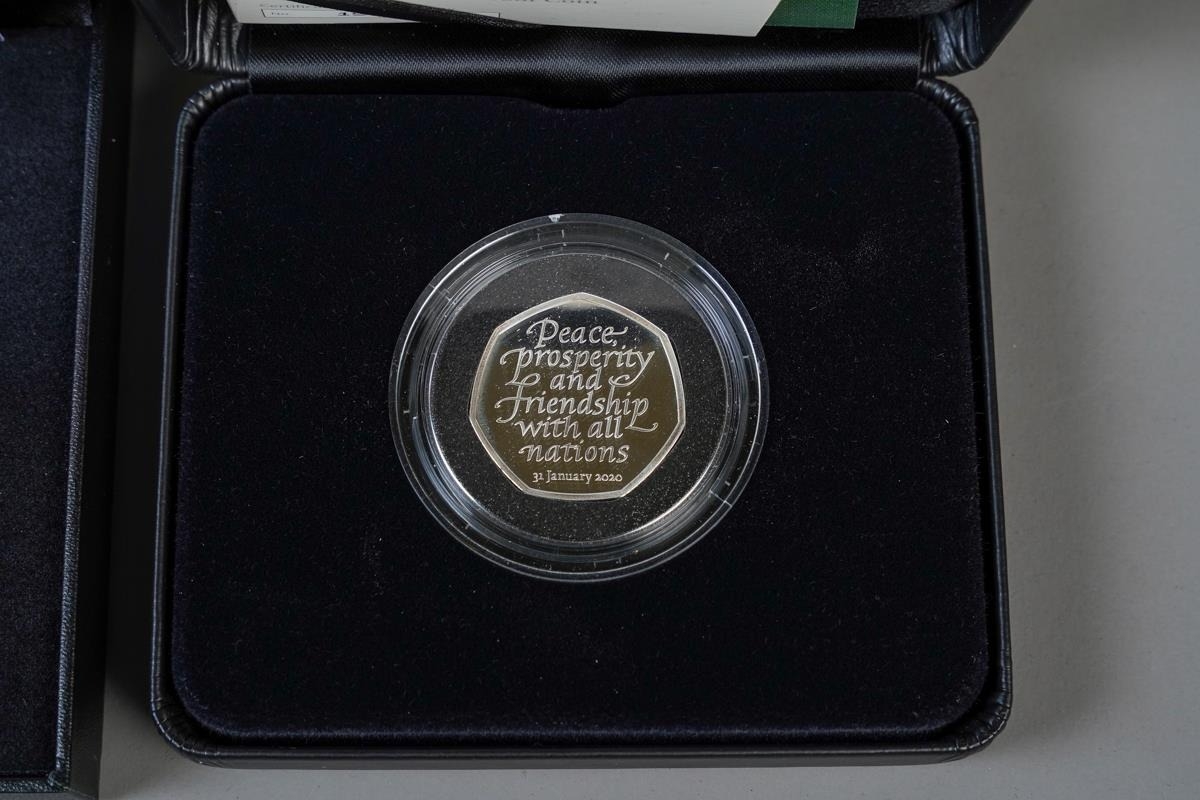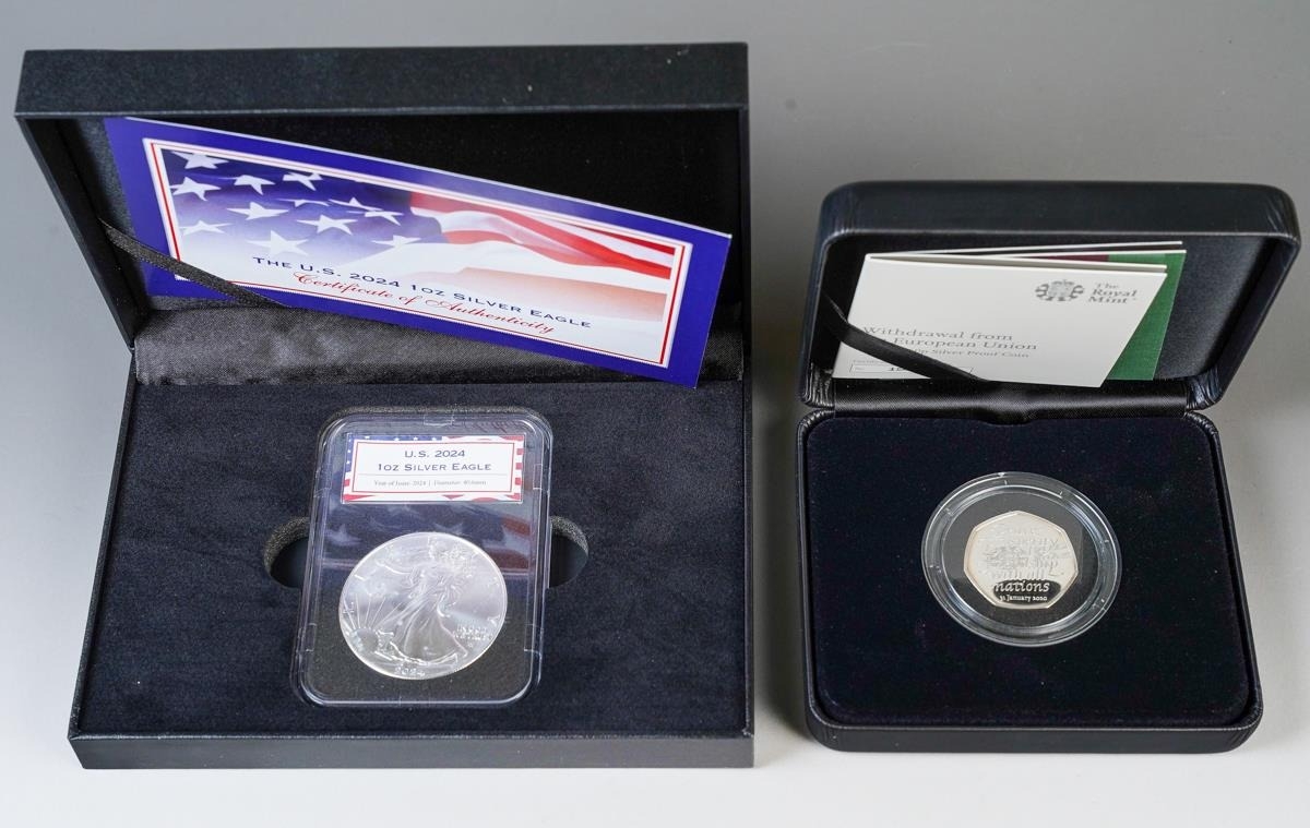 A boxed and cased 2024 U.S. 1oz silver eagle coin in perspex case, with certificate, together with a boxed Royal Mint 2020 UK 50p Silver Proof Coin - Withdrawal From the European Union, 8 grams, in perspex case, with certificates (2)