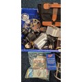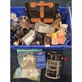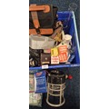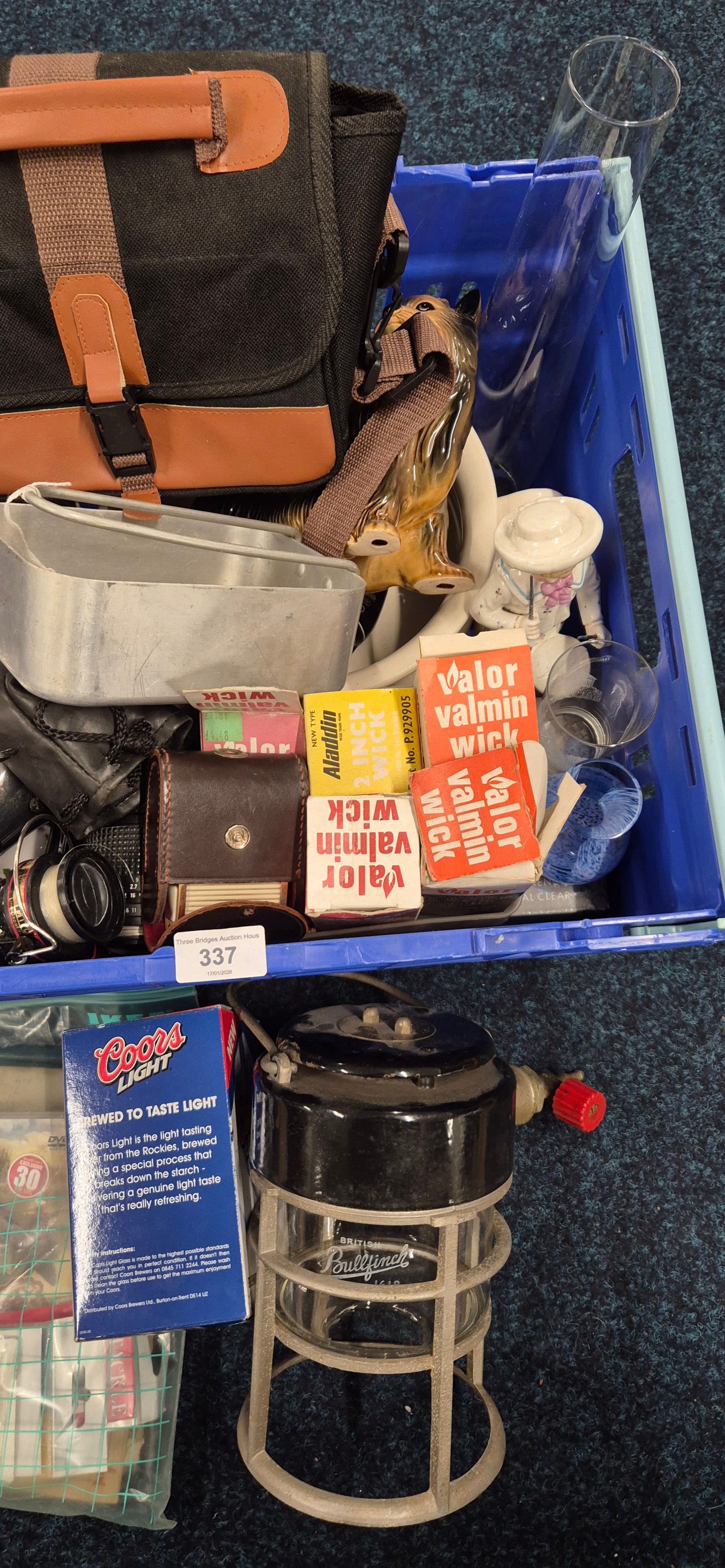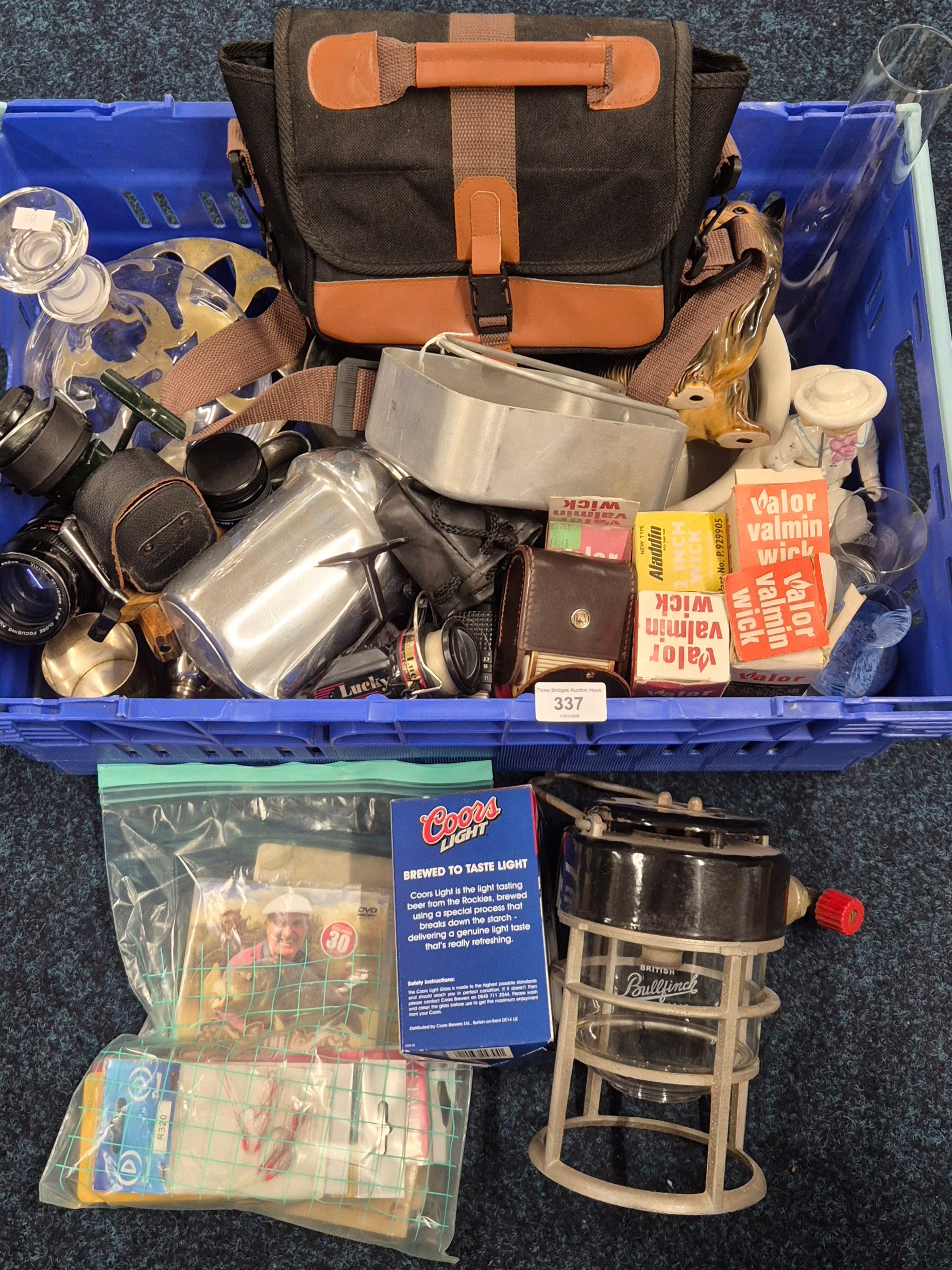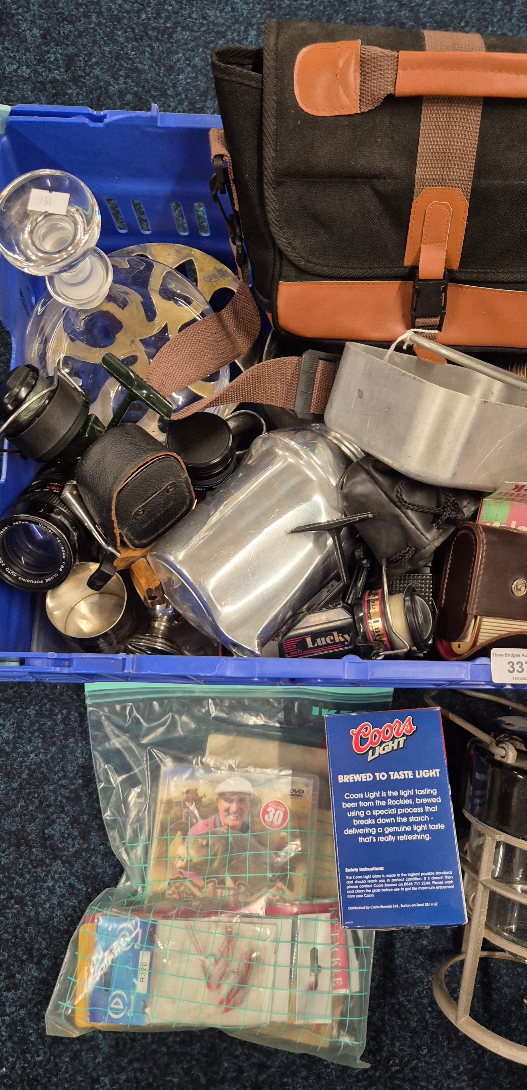 Crate of Collectables; 19th Century Pewter Stein, Silver plated wares, Piquot Ware, Oil lamp funnel, Royal Crown Derby "Derby Posies" Dish, Vintage Galion 12 fishing reel, fishing accessories, Camping gas light, Vivitar 70-150mm Lens, Prakticar 2.8/135 Lens, Vivitar Automatic Tele Converter & Vanguard 1.5X/0.5X Lens with other items.