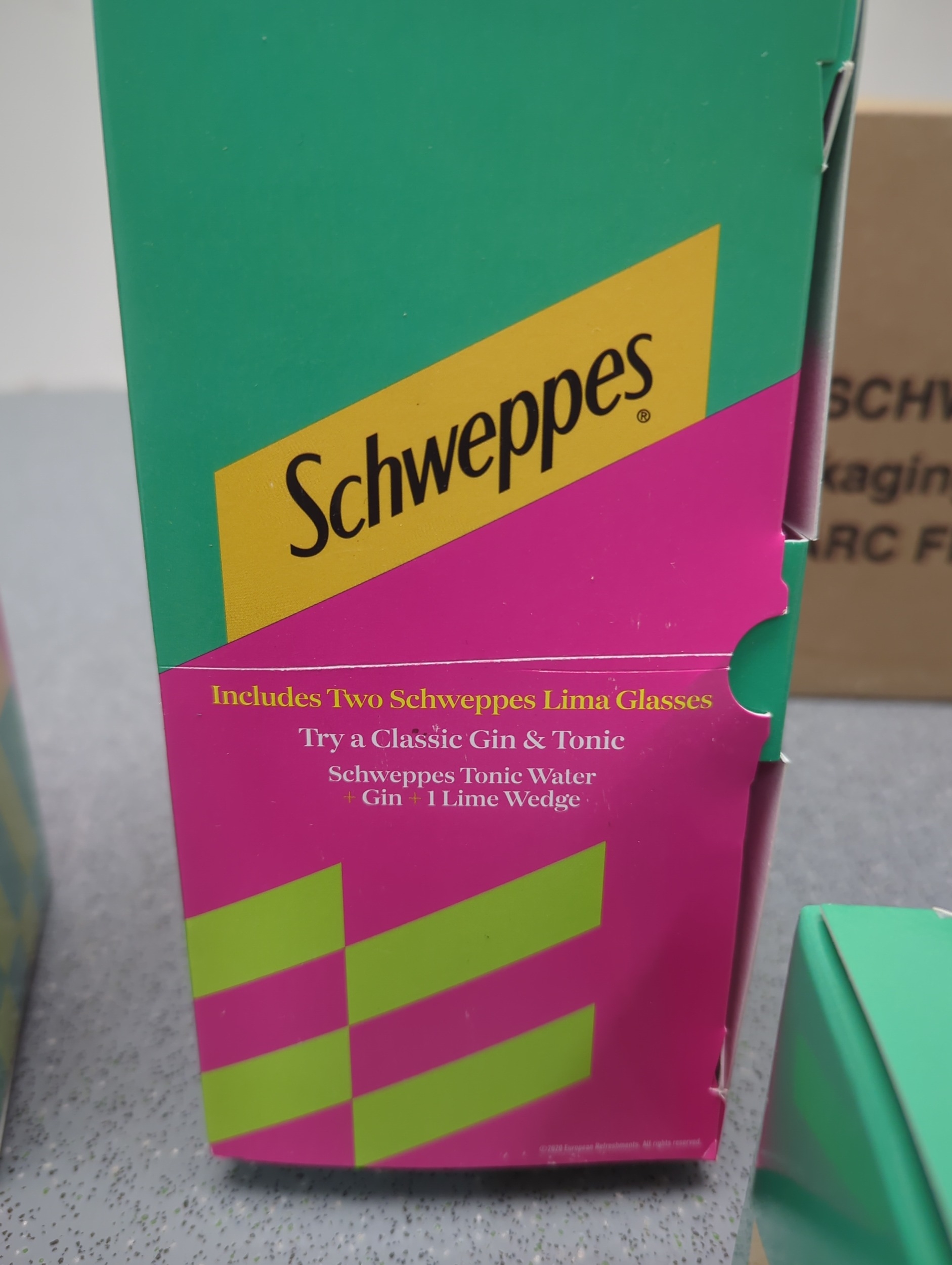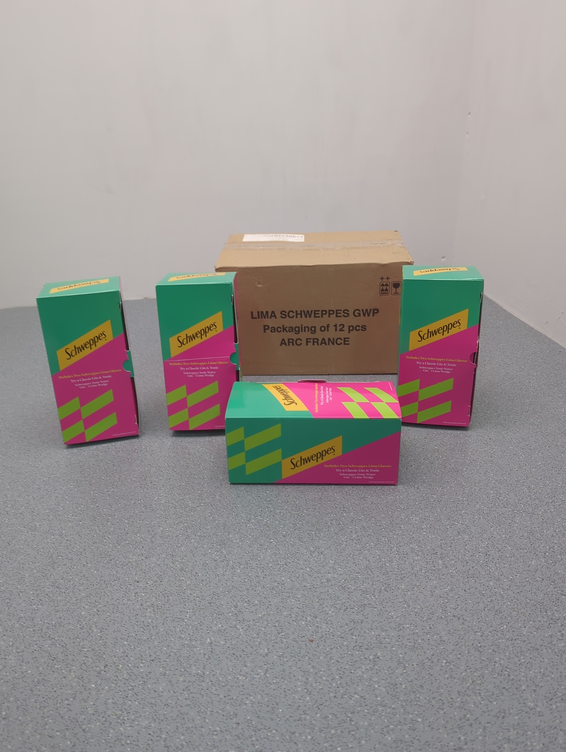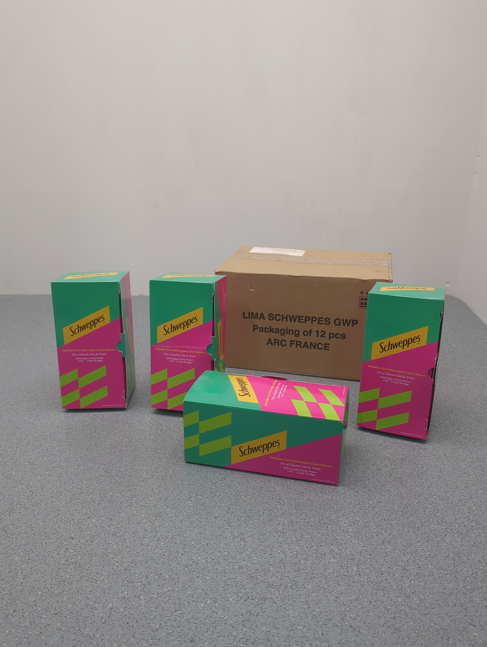 This bundle includes multiple boxes of Schweppes Lima glasses. The boxes are vibrantly decorated in pink and green with the Schweppes logo clearly visible. These glasses are designed for enjoying a classic gin and tonic. The packaging states they are a GWP (gift with purchase) item from ARC France.