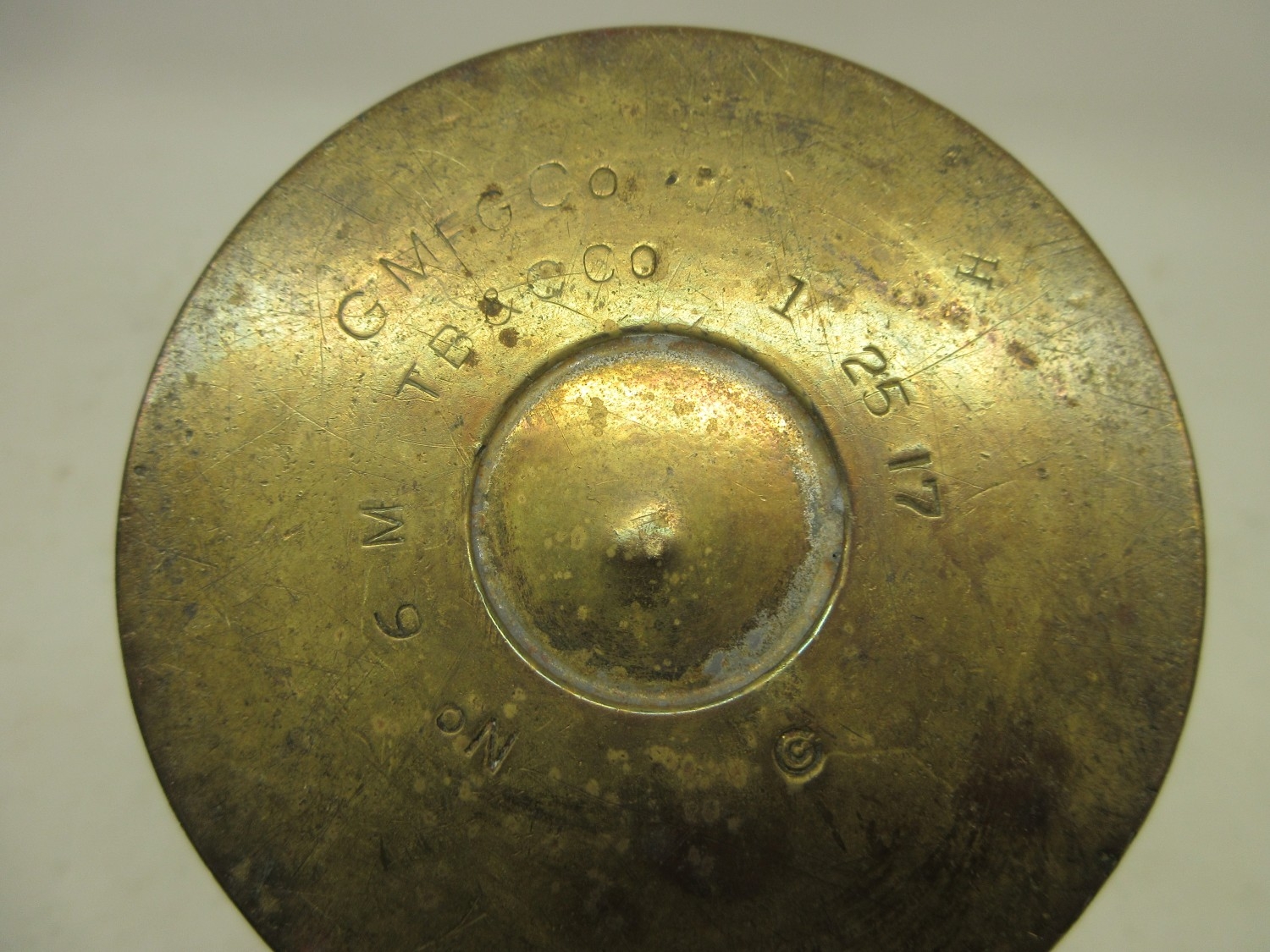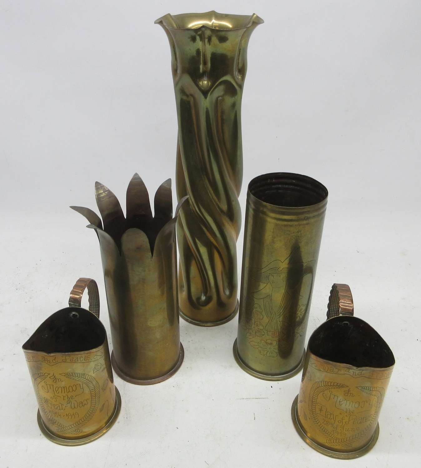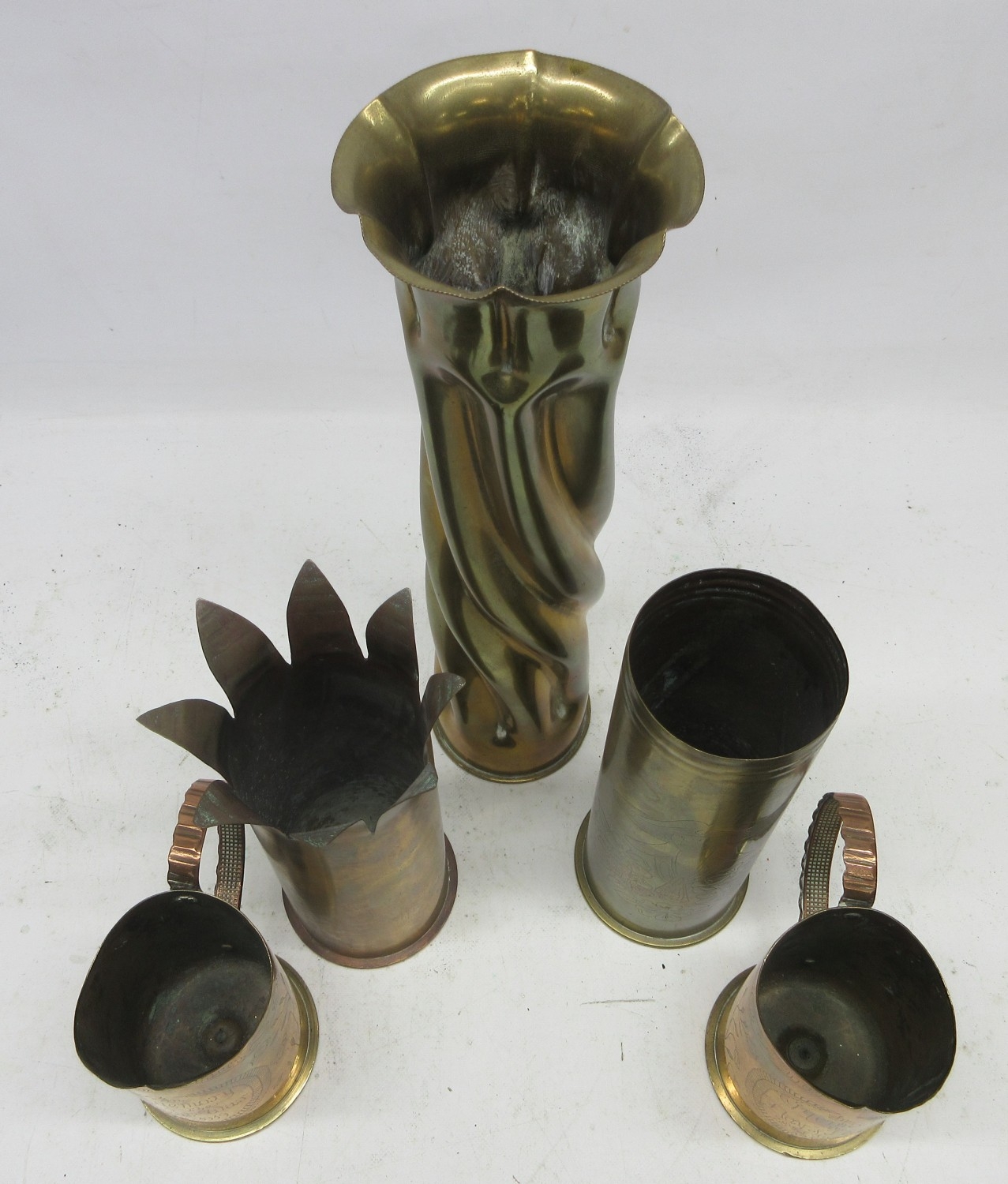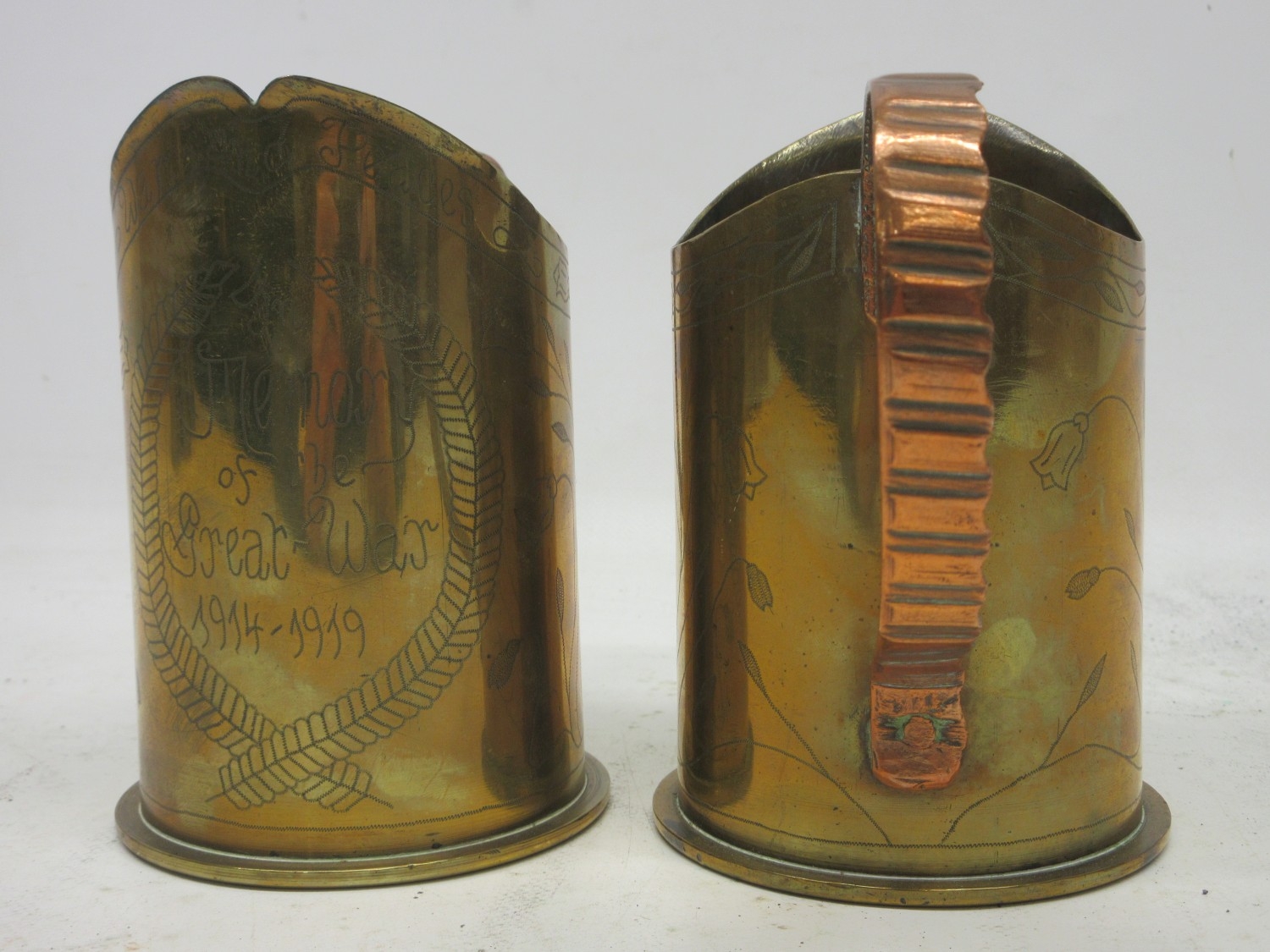 Collection of WWI trench art items including 3 brass shell vases, 2 with remembrance etchings, likely French, May & July 1917; plus a pair of German (maker Friedrich Newmeyer), Sept 1917, strengthened shell casing beakers with banding handles and engraving in memorandum, etc. Qty. 5