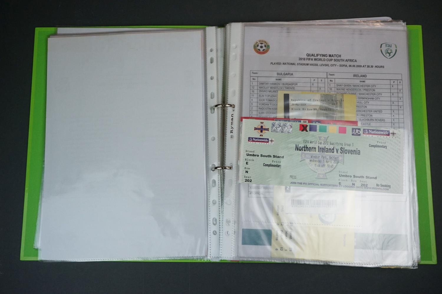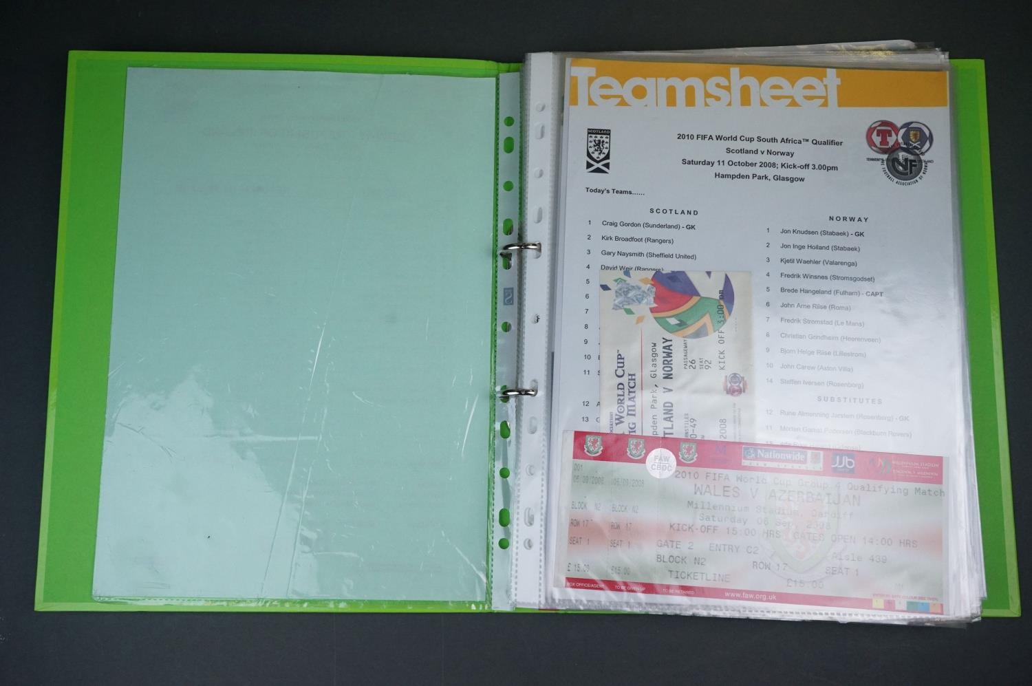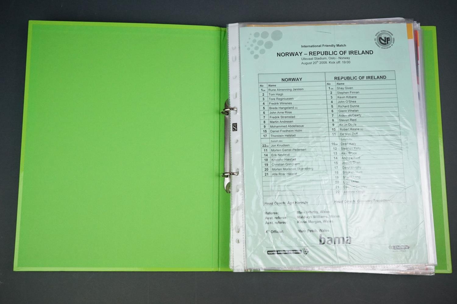 Football - Internationals 2008-2013, a binder containing an extensive collection of teamsheets, tickets, menus etc, to include Scotland, Rep of Ireland, Wales, England etc, gen vg