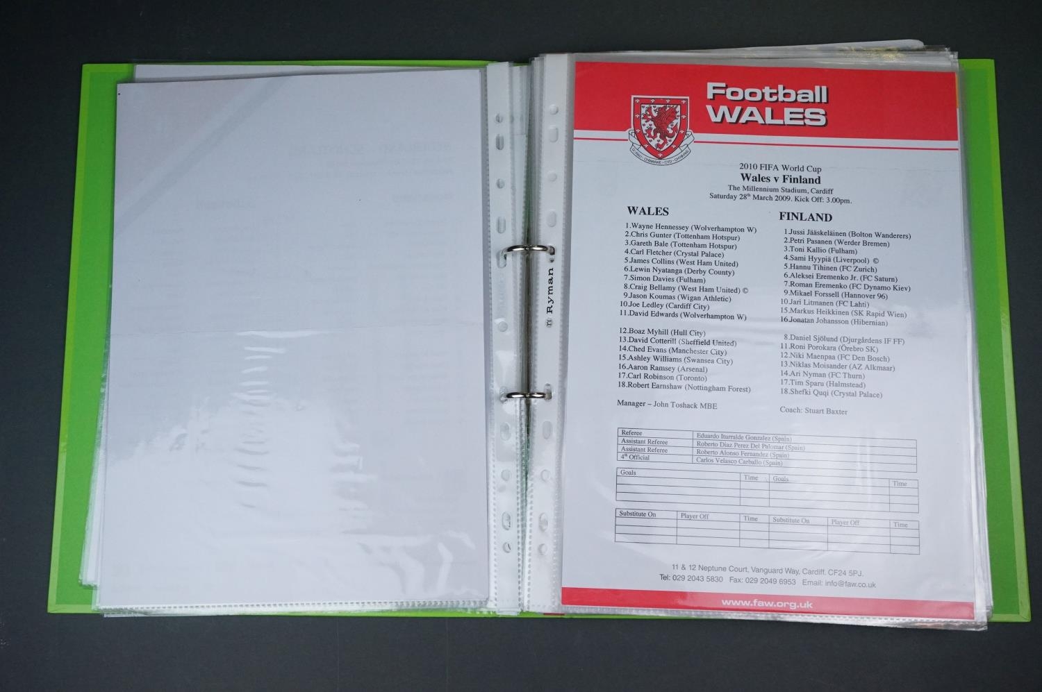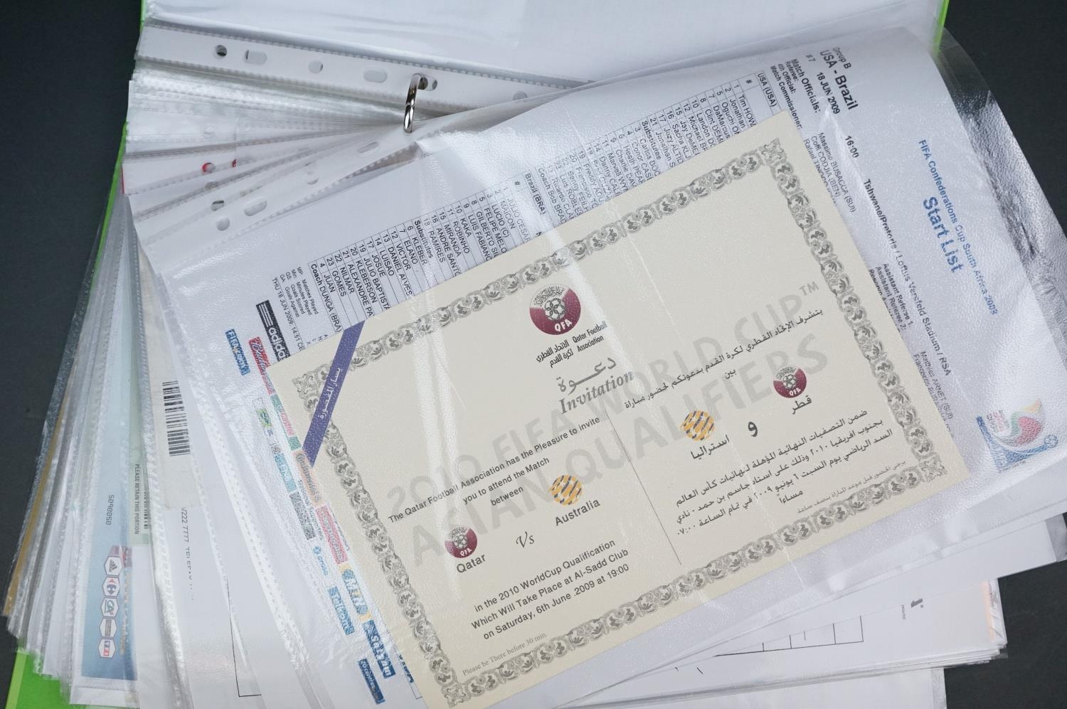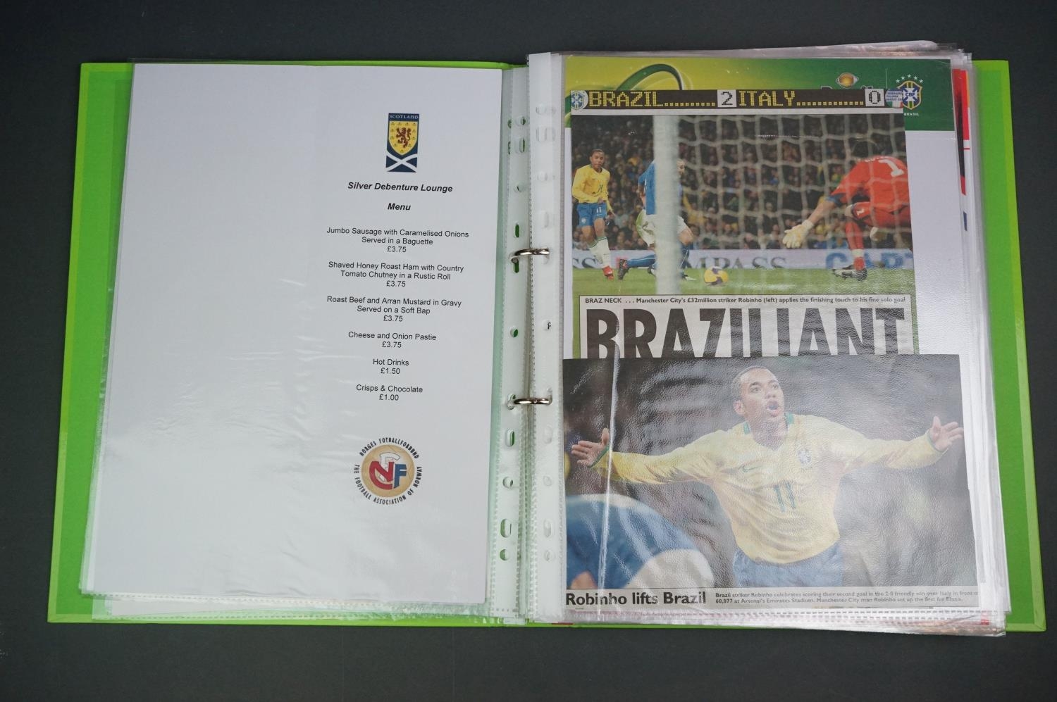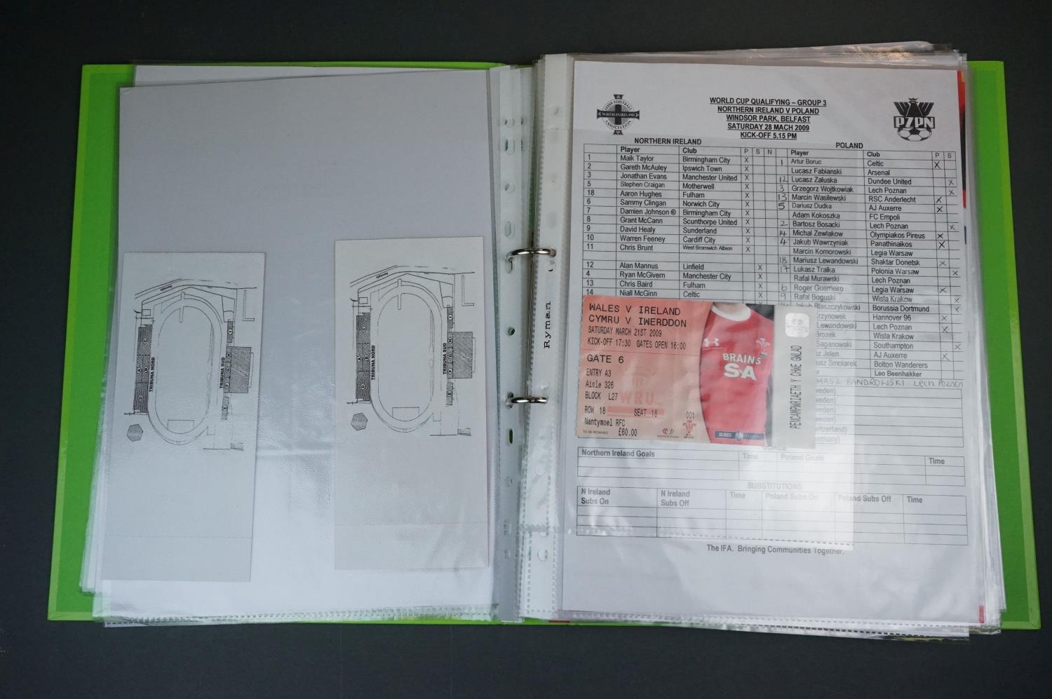 Football - Internationals 2008-2013, a binder containing an extensive collection of teamsheets, tickets, menus etc, to include Scotland, Rep of Ireland, Wales, England etc, gen vg