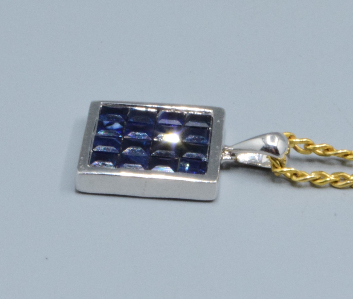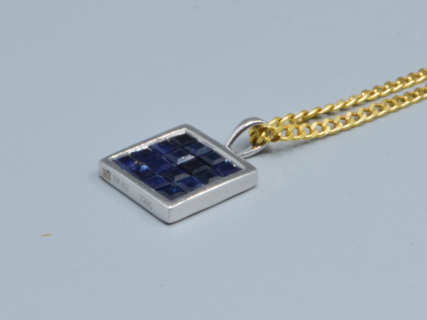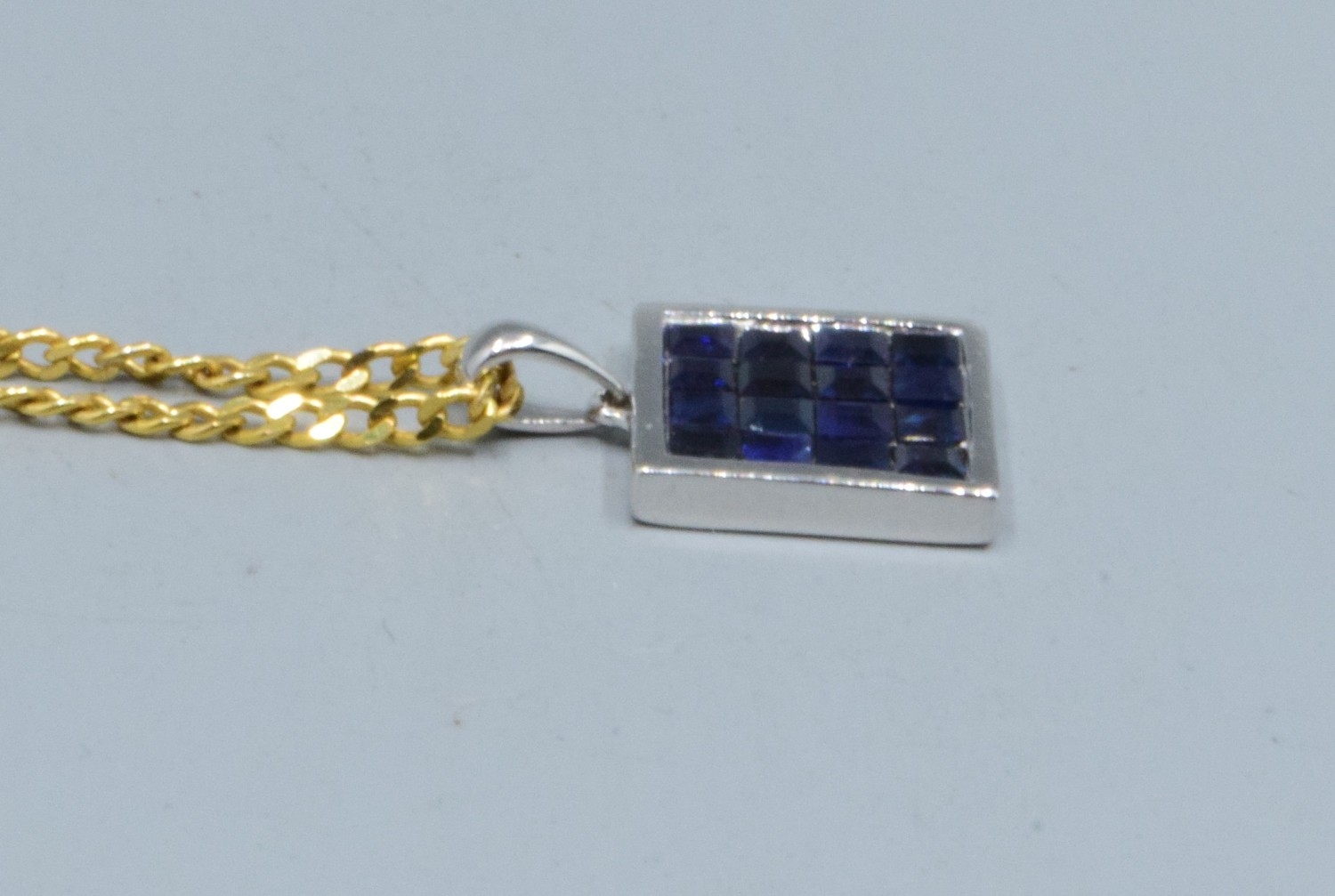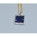 9ct white gold Sapphire square shape pendant necklace 12x12mm held on a 9ct gold neck chain of 44cm long, 5.2grams