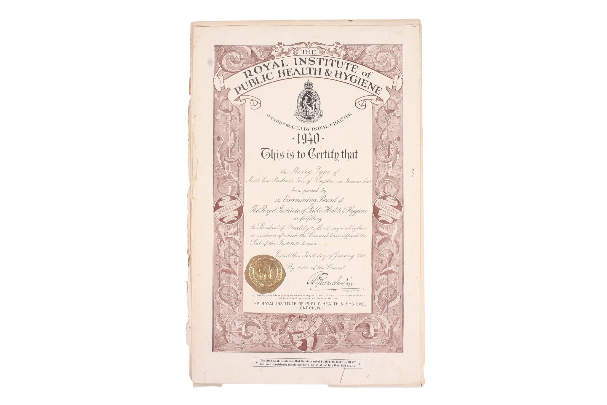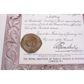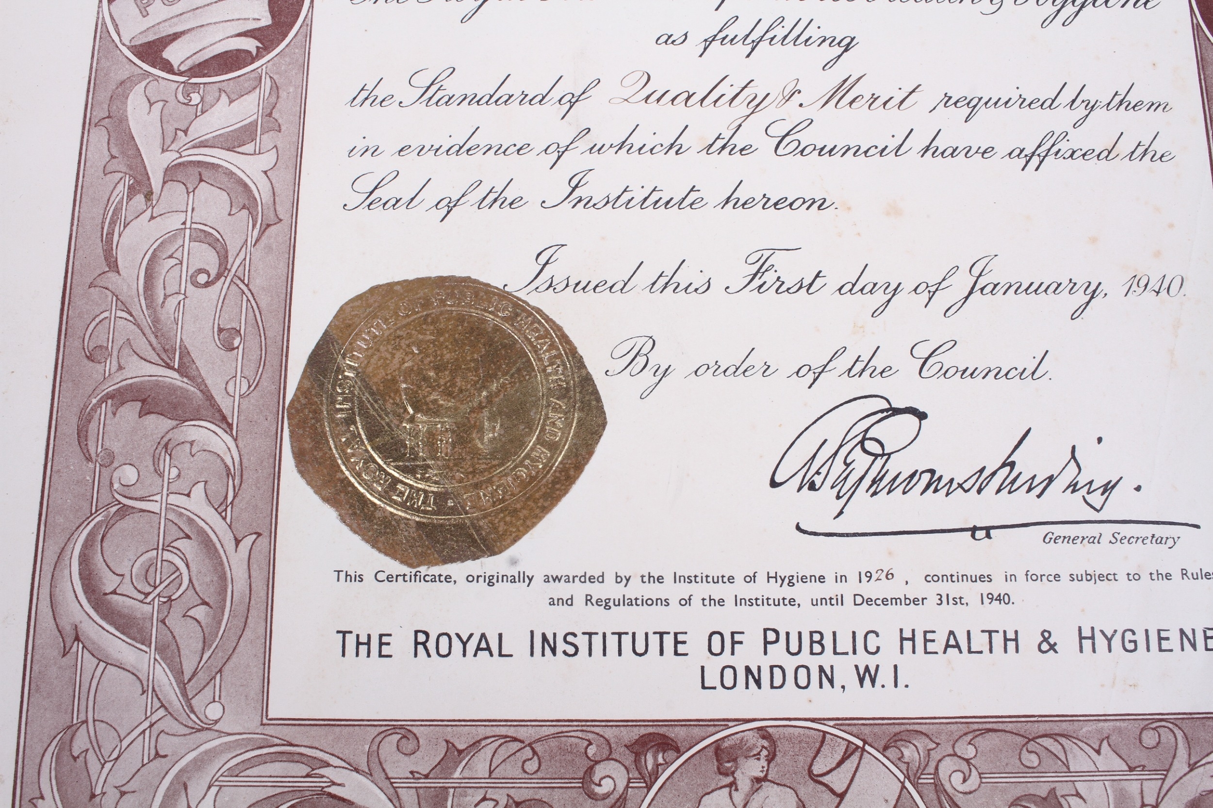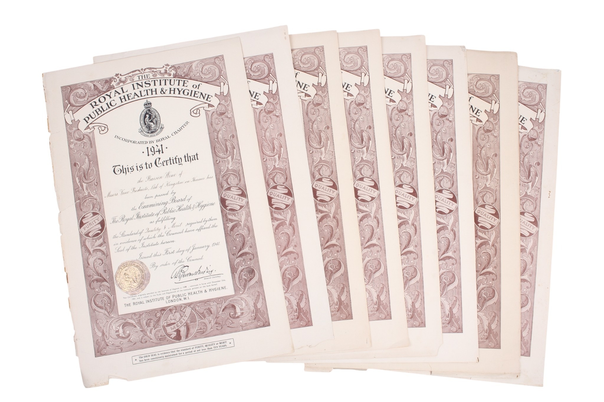 Eight WWII certificates' 'The Royal Institute of Public Heath and Hygiene'. Dated from 1939 to 1943, all having printed signatures of the General Secretary and a gold seal, 48cm x 30.5cm.