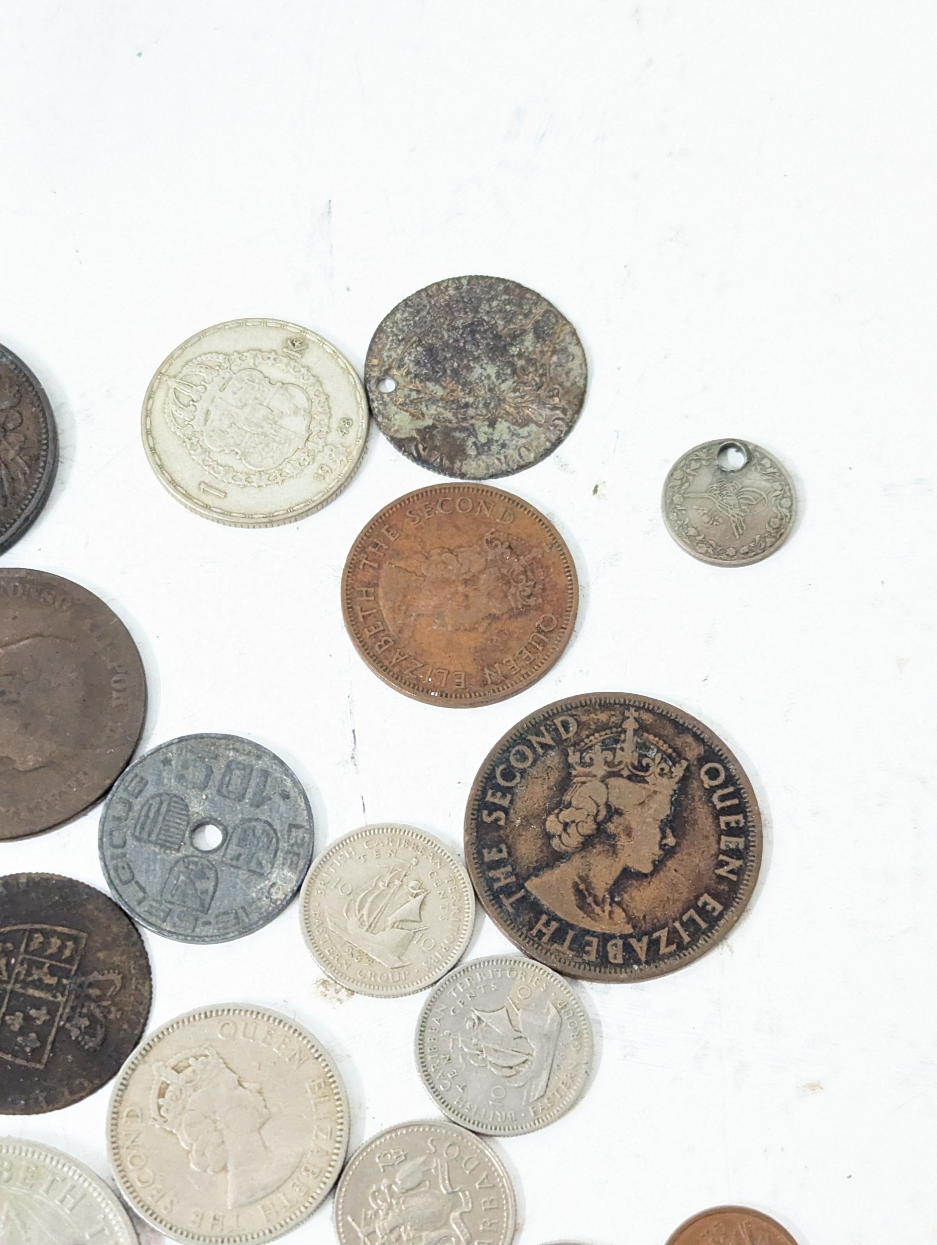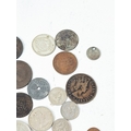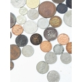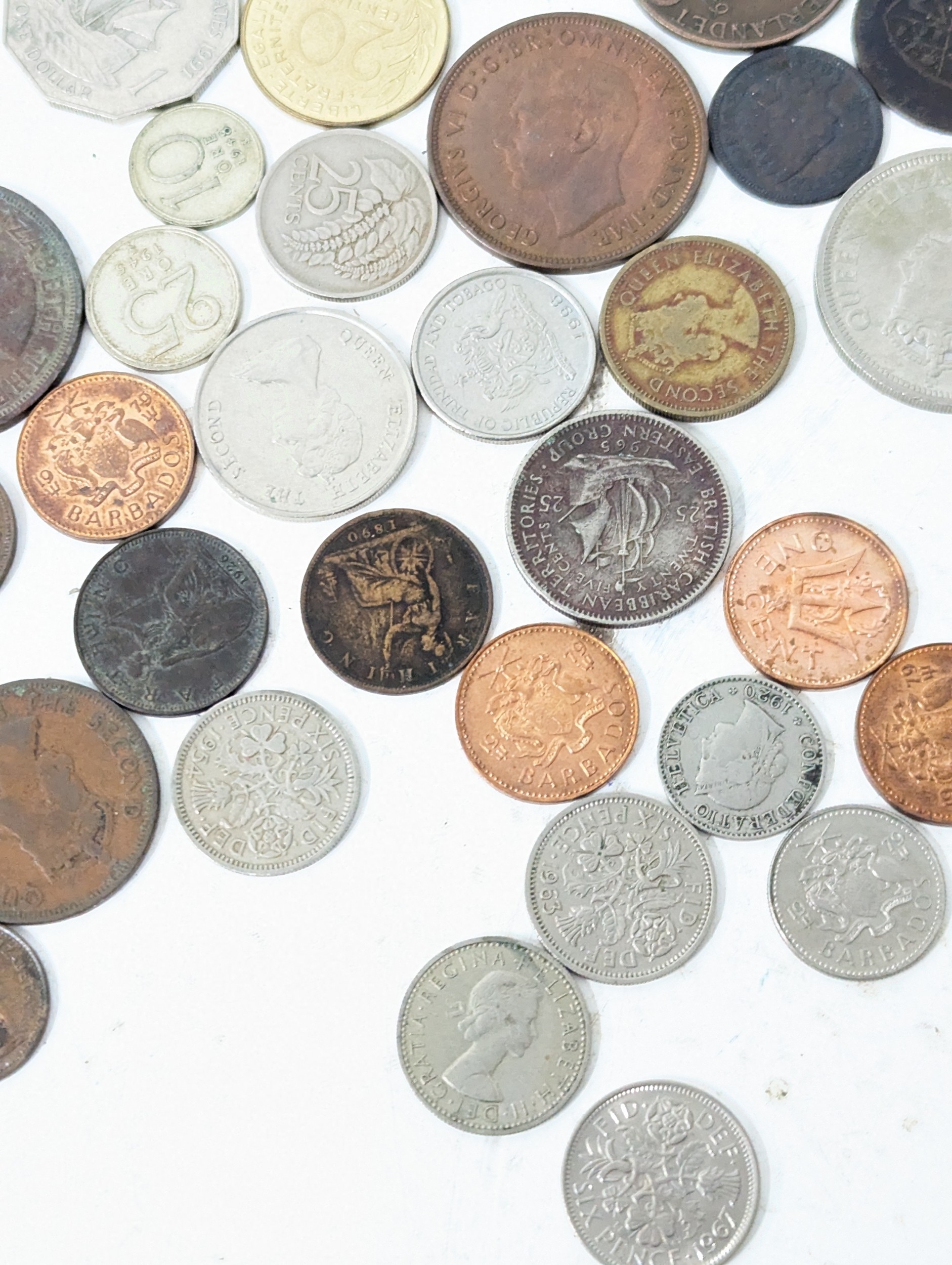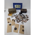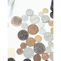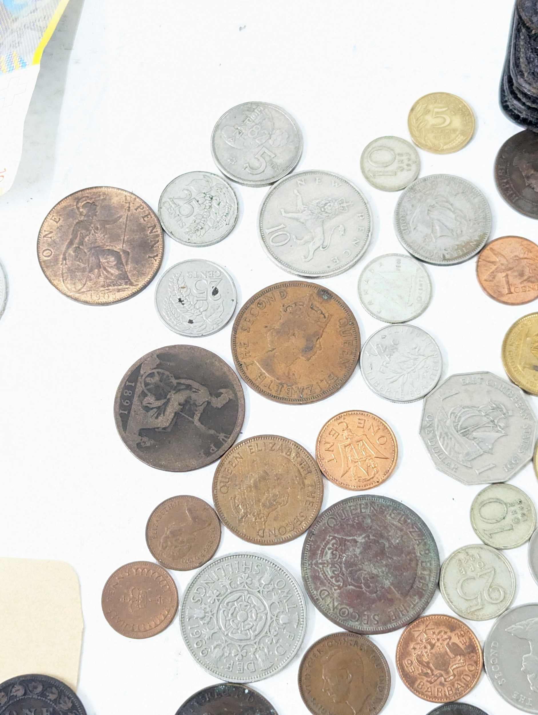 A group of mainly British coinage to include a George III half penny, a vintage money tin and others