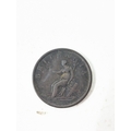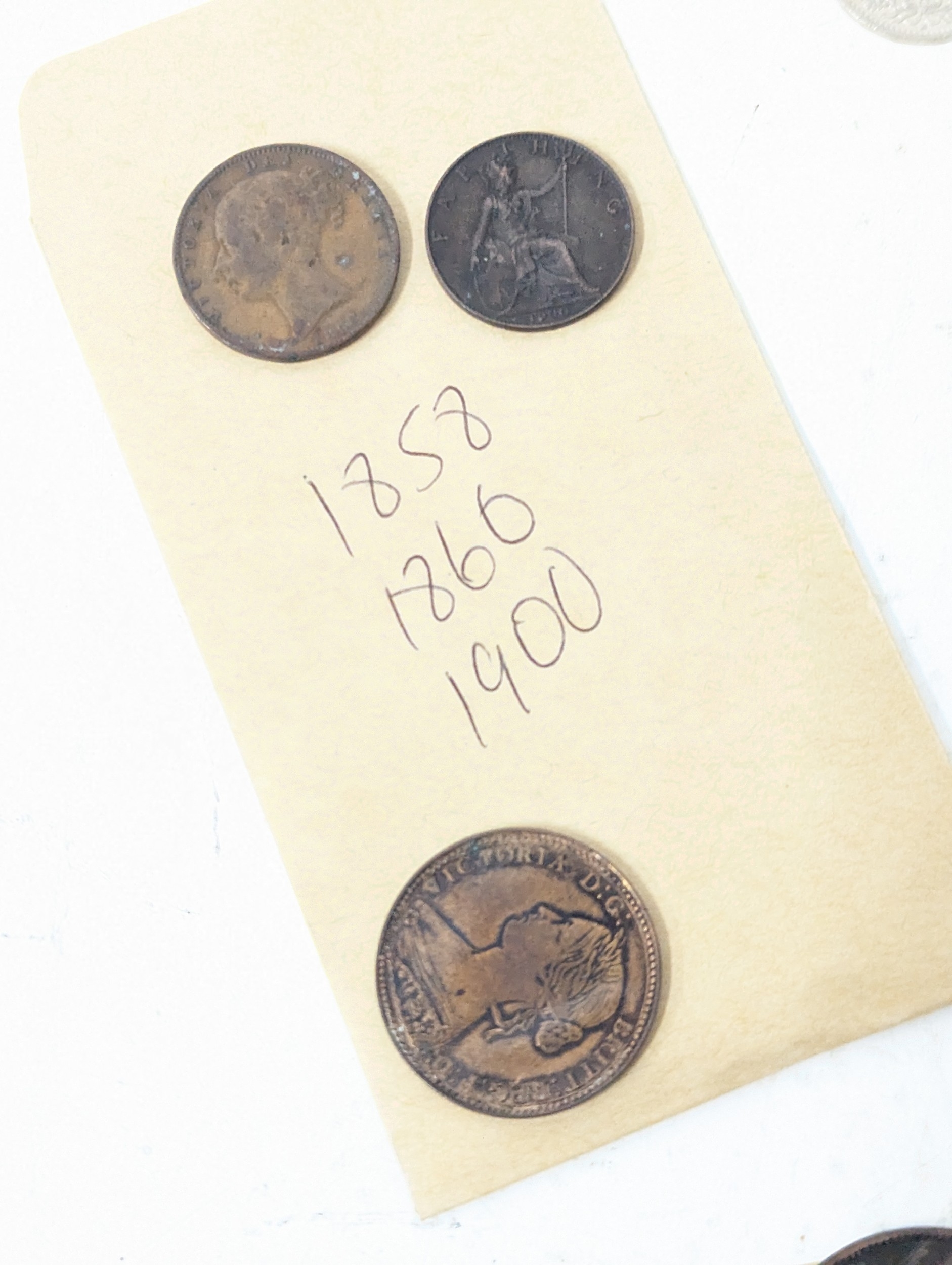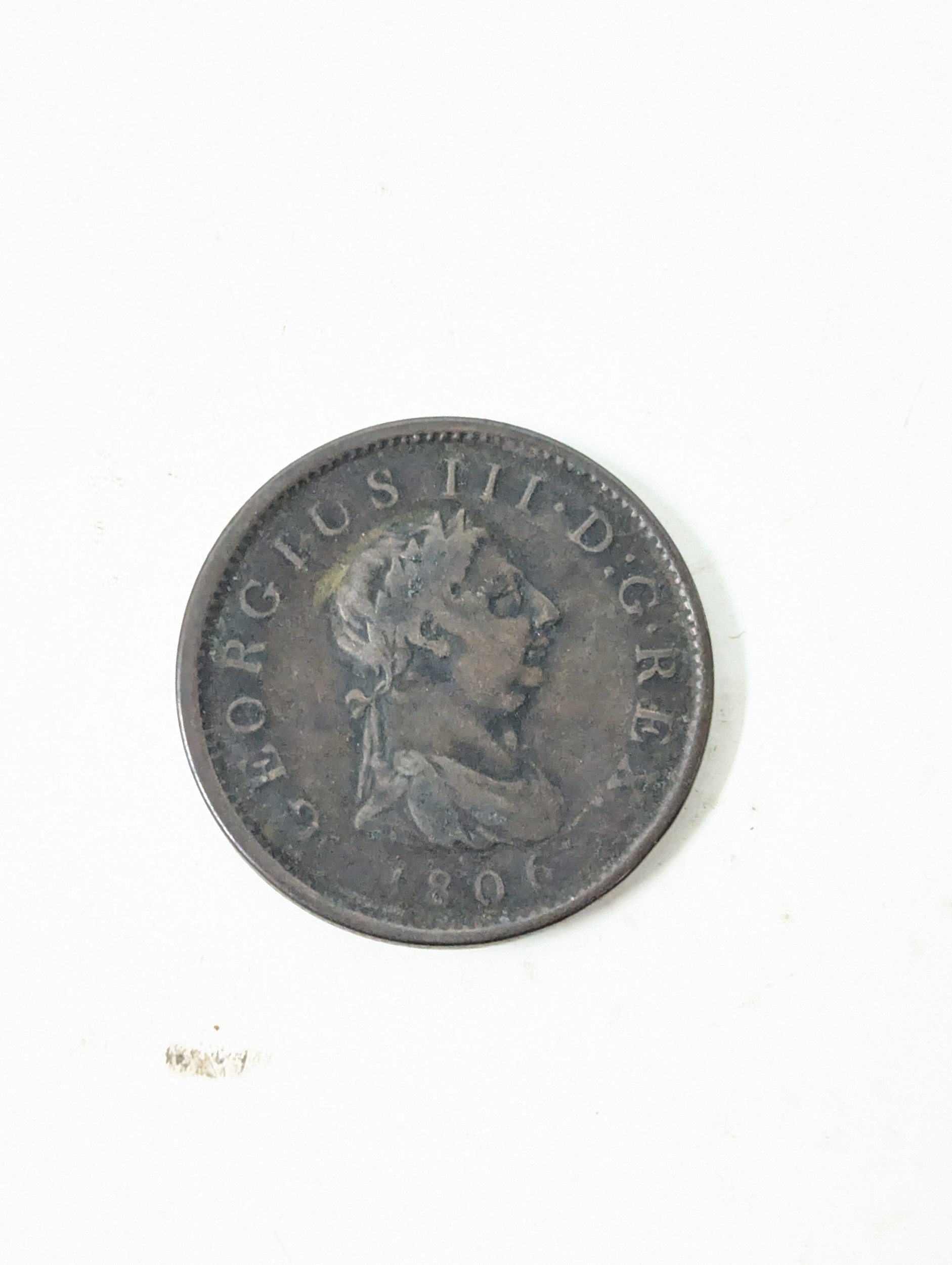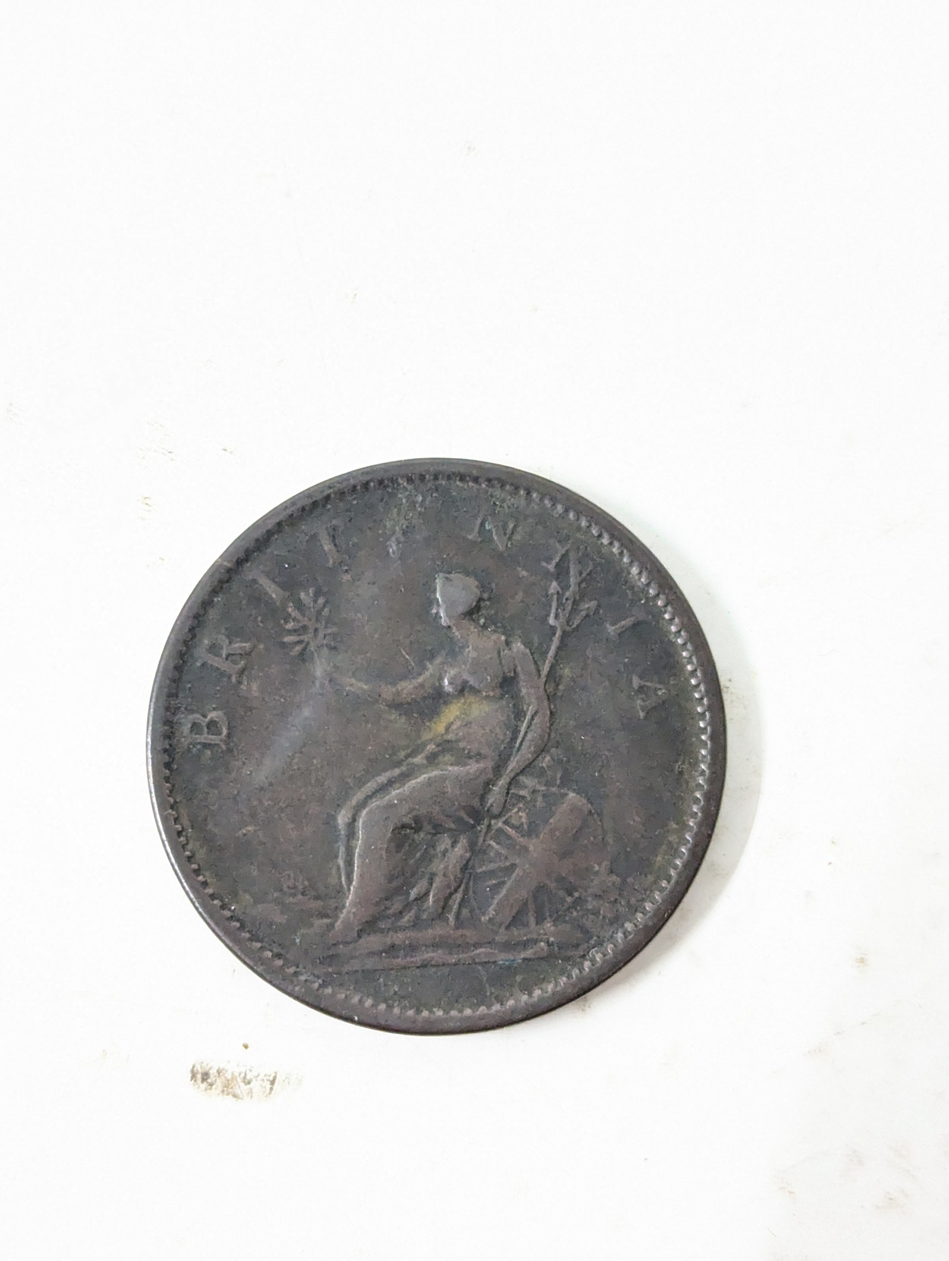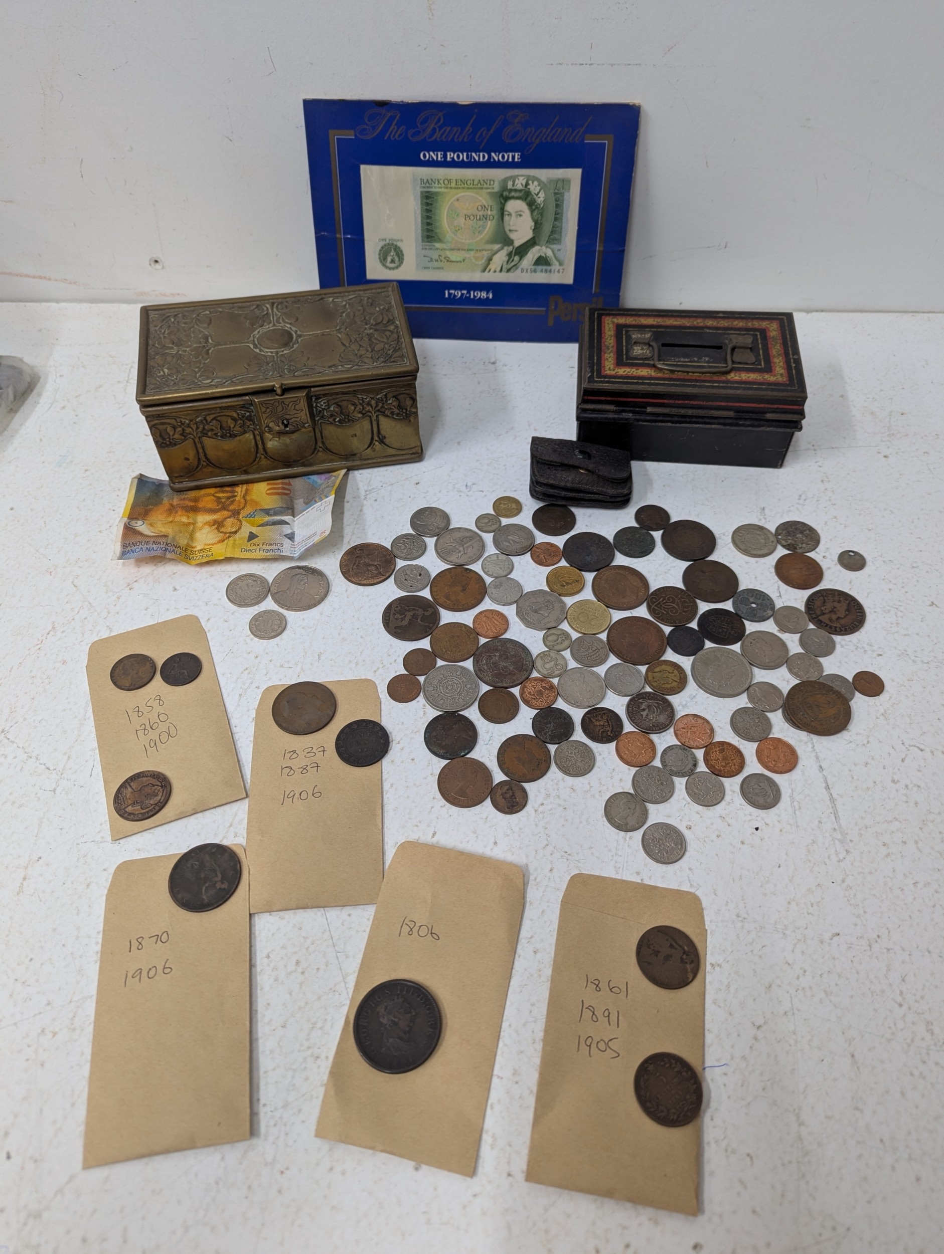 A group of mainly British coinage to include a George III half penny, a vintage money tin and others