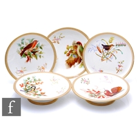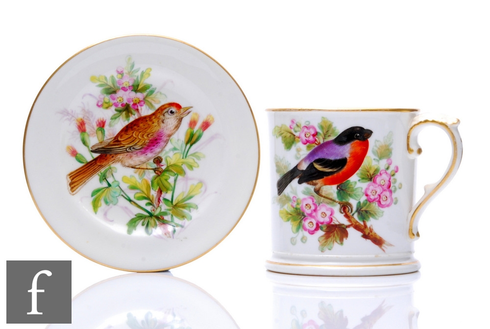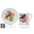 A small Royal Worcester mug decorated with a hand painted chaffinch perched on a flowering branch, puce mark with indistinct date letter, height 7.5cm, together with a small pin dish coaster decorated with a redwing perched on a flowering branch, puce mark with date letter for 1884, diameter 10.5cm. (2)