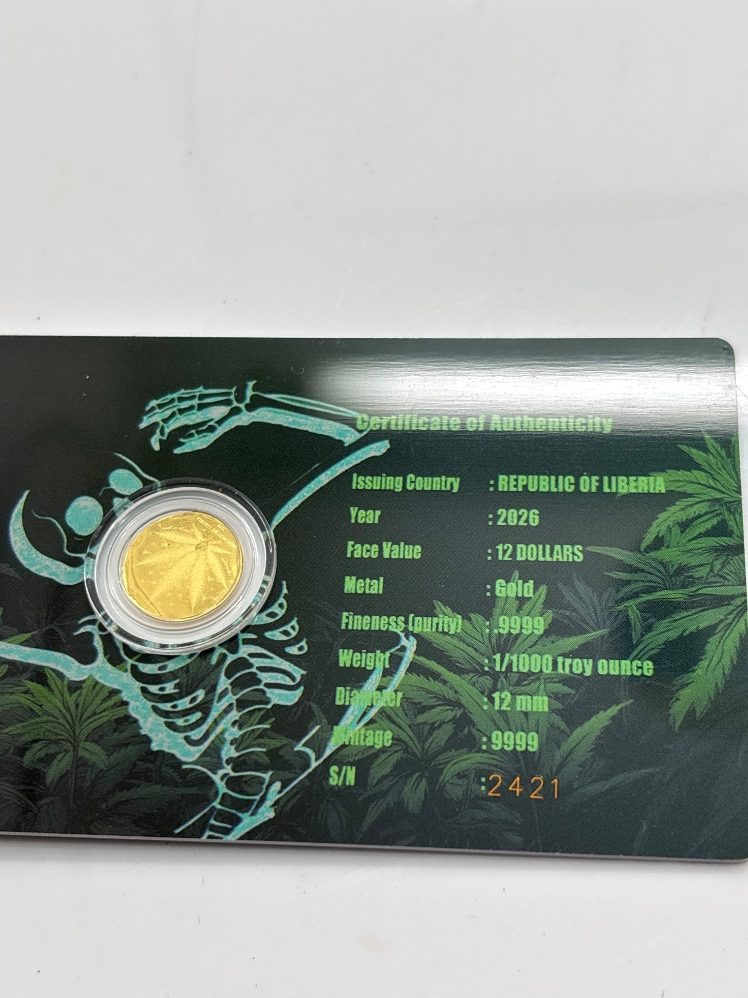 2026 gold coin, 1/1000 troy ounce, 12 Liberian dollars, 9999 pure gold.