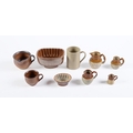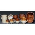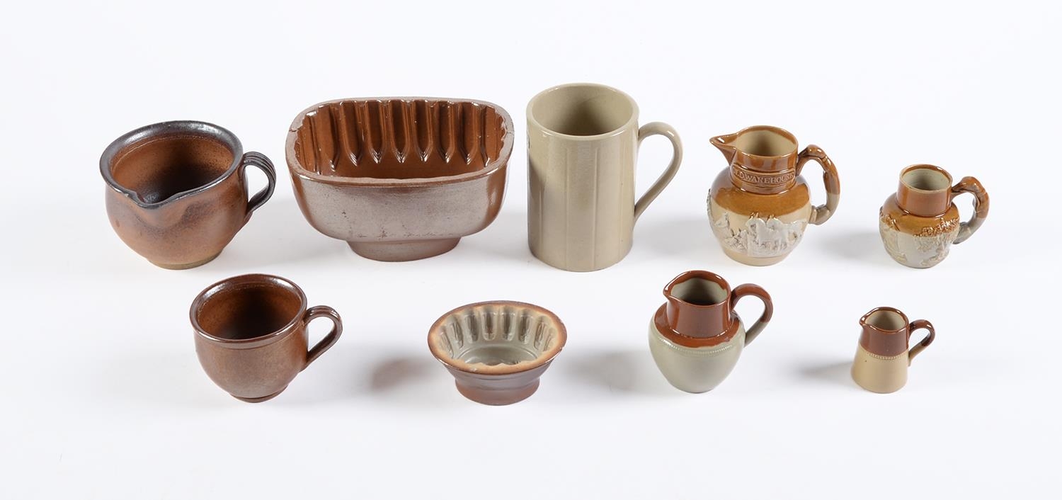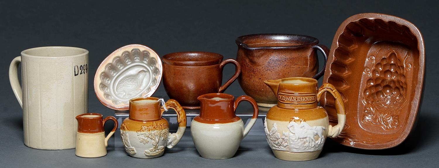 Two Derbyshire saltglazed brown stoneware handled pots, Chesterfield, early-mid 19th c, 70 and 90mm h, two contemporary jelly moulds and four stoneware jugs and a jar (9)