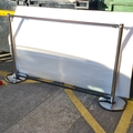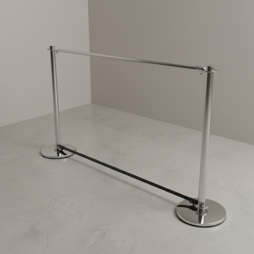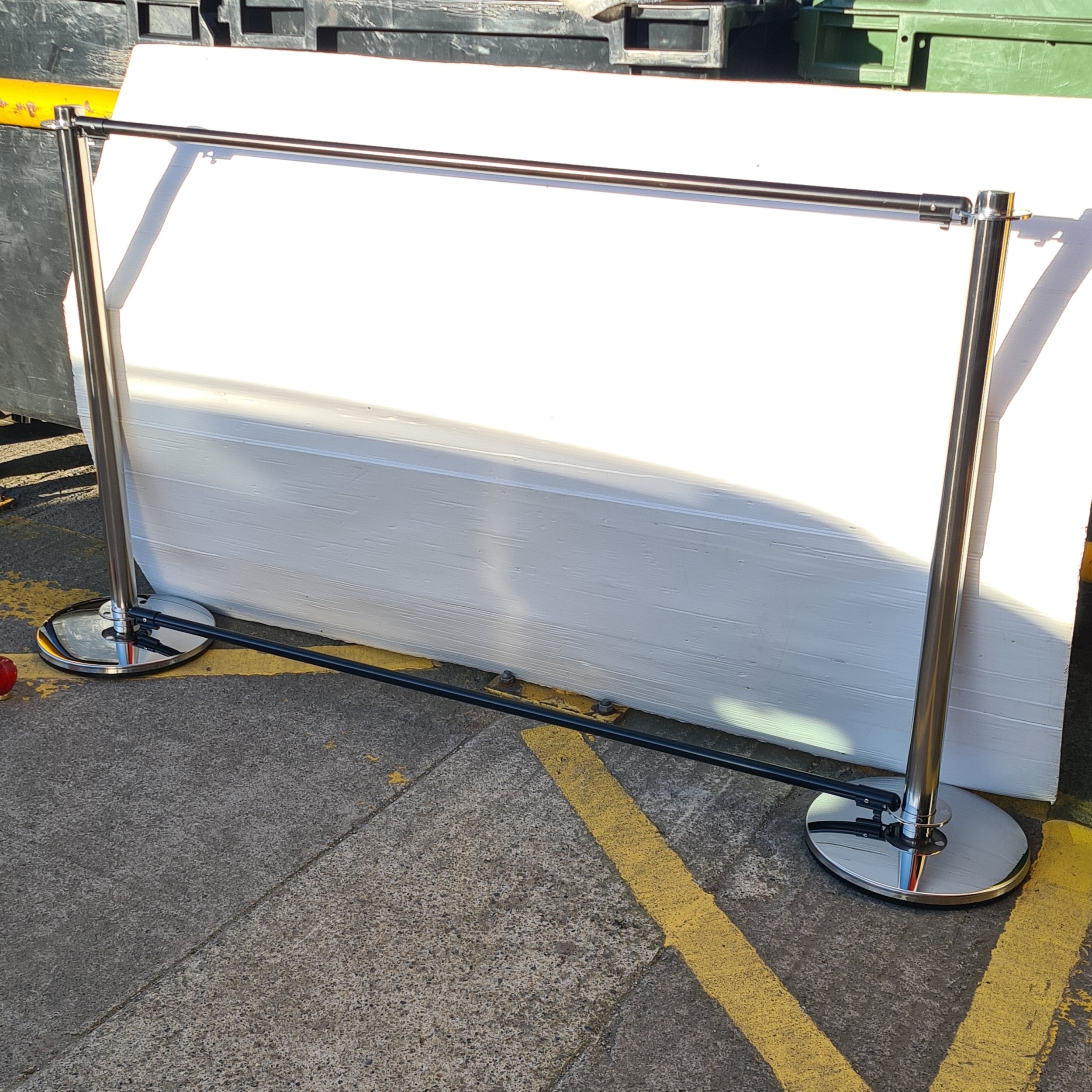 Pair of brand new polished chrome crowd-control stanchion posts with weighted circular bases, together with two matte black clip-fitted crossbars, so you can add advertising if you wish. There is a good quanity of these in this sale.